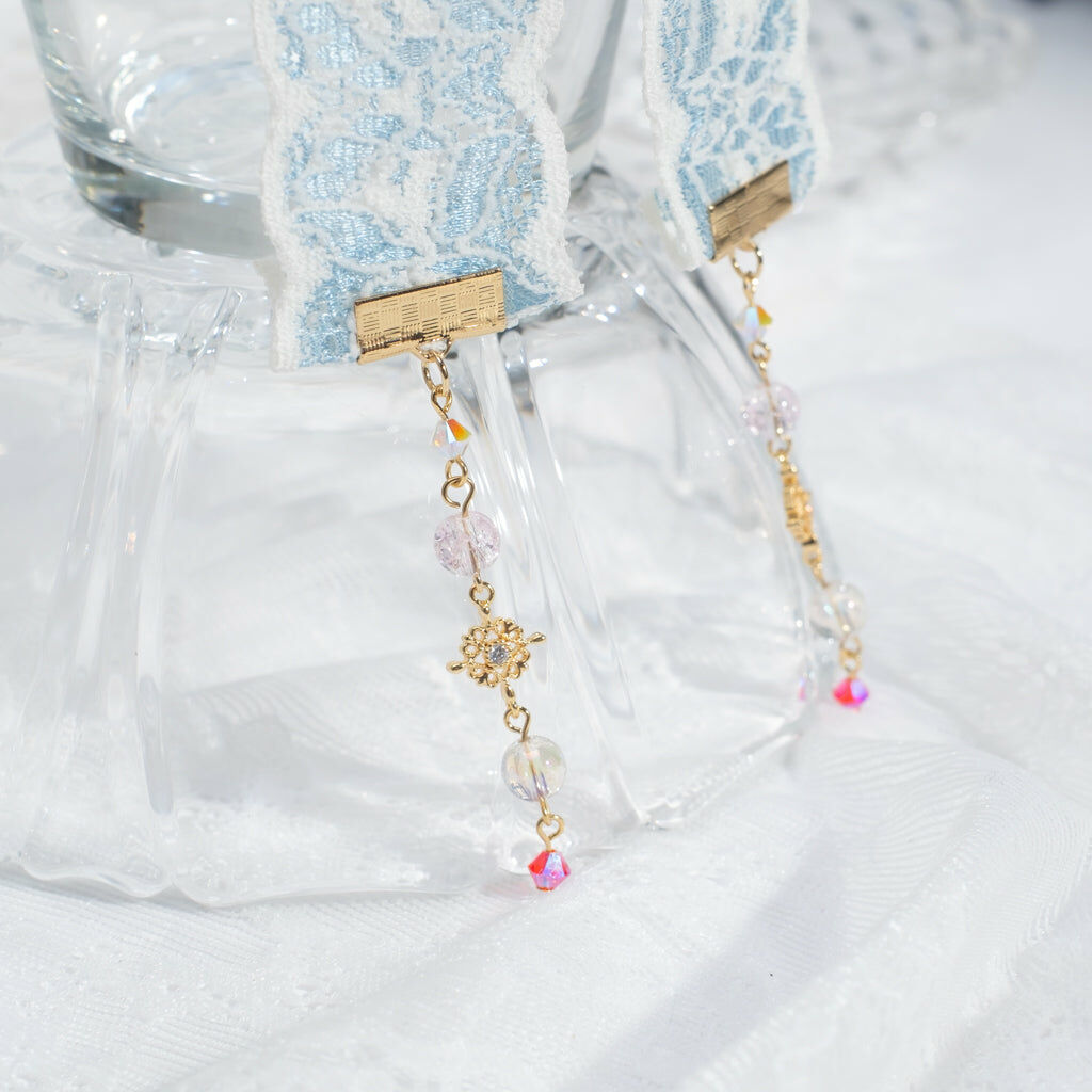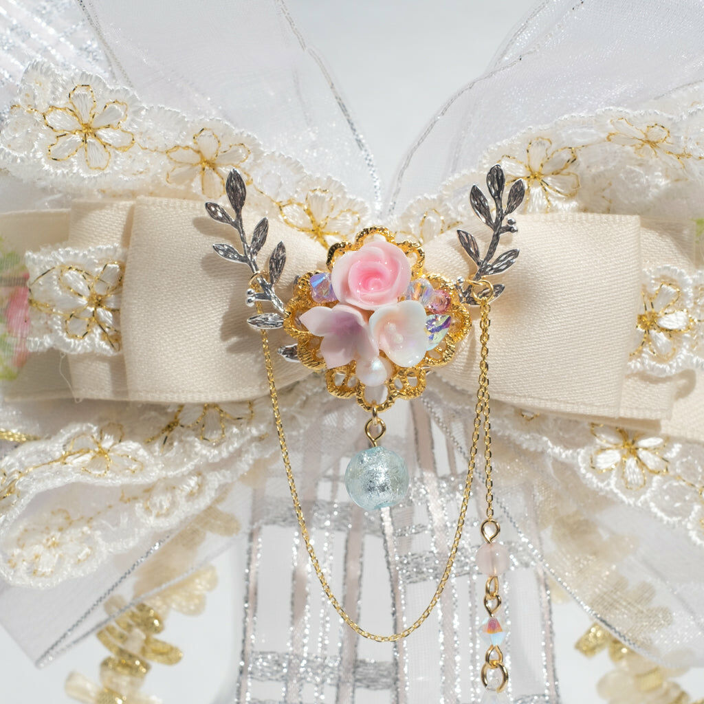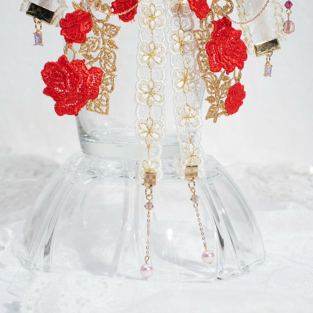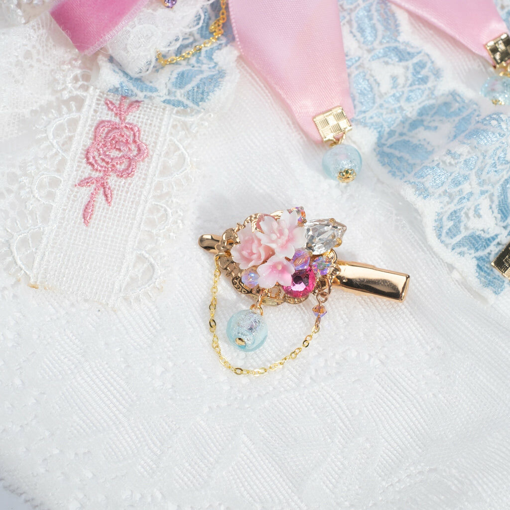 鍍金線 | 施華洛世奇水晶 | 手製樹脂黏土花 | UV膠強化保護層 | 金屬髮夾