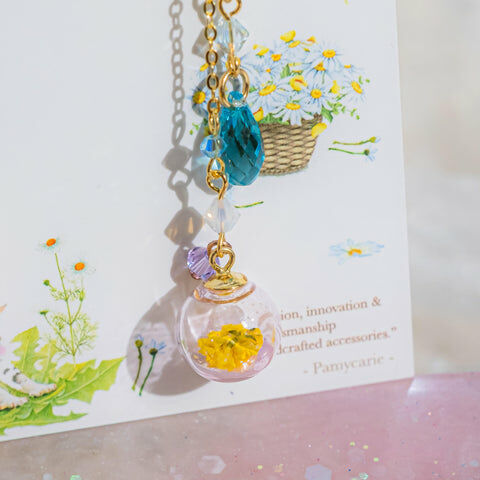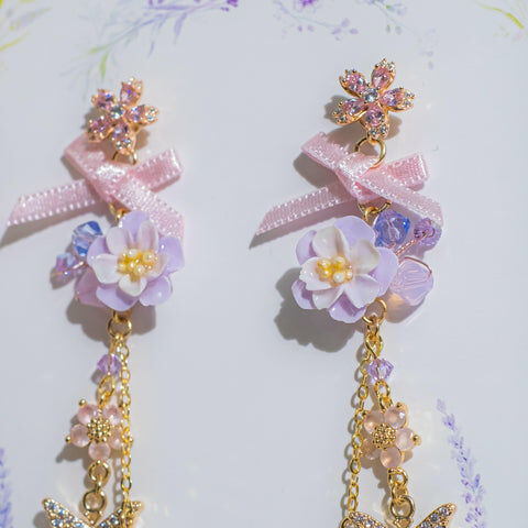 鍍金線 | 施華洛世奇水晶 | 手製樹脂黏土花 | UV膠強化保護層 | 鍍金925純銀耳釘
