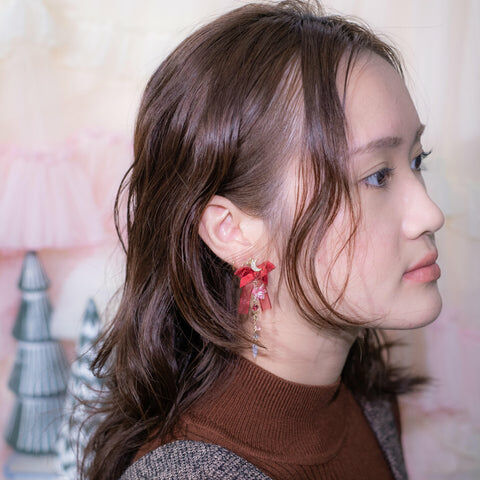 3 ❅ 酒紅聖誕花蝴蝶結POMPOM S925耳環