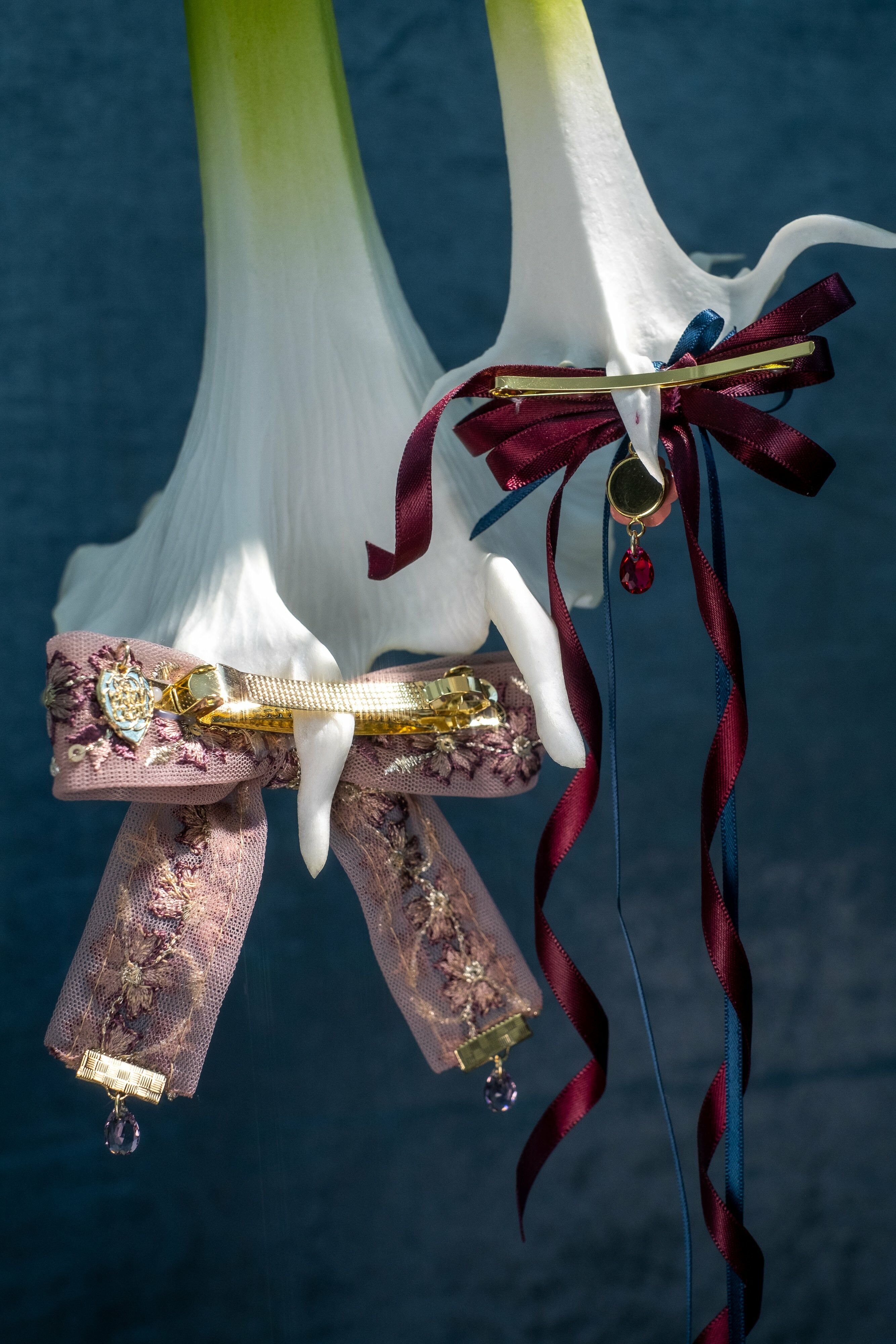 由迷你髮夾+刺繡蕾絲蝴蝶結髮夾的組合!緞帶和蕾絲的組合讓作品的層次感變得豐富。迷你蝴蝶結的超長拖尾讓整個造形充滿少女感!