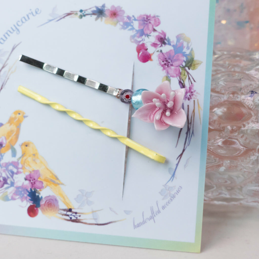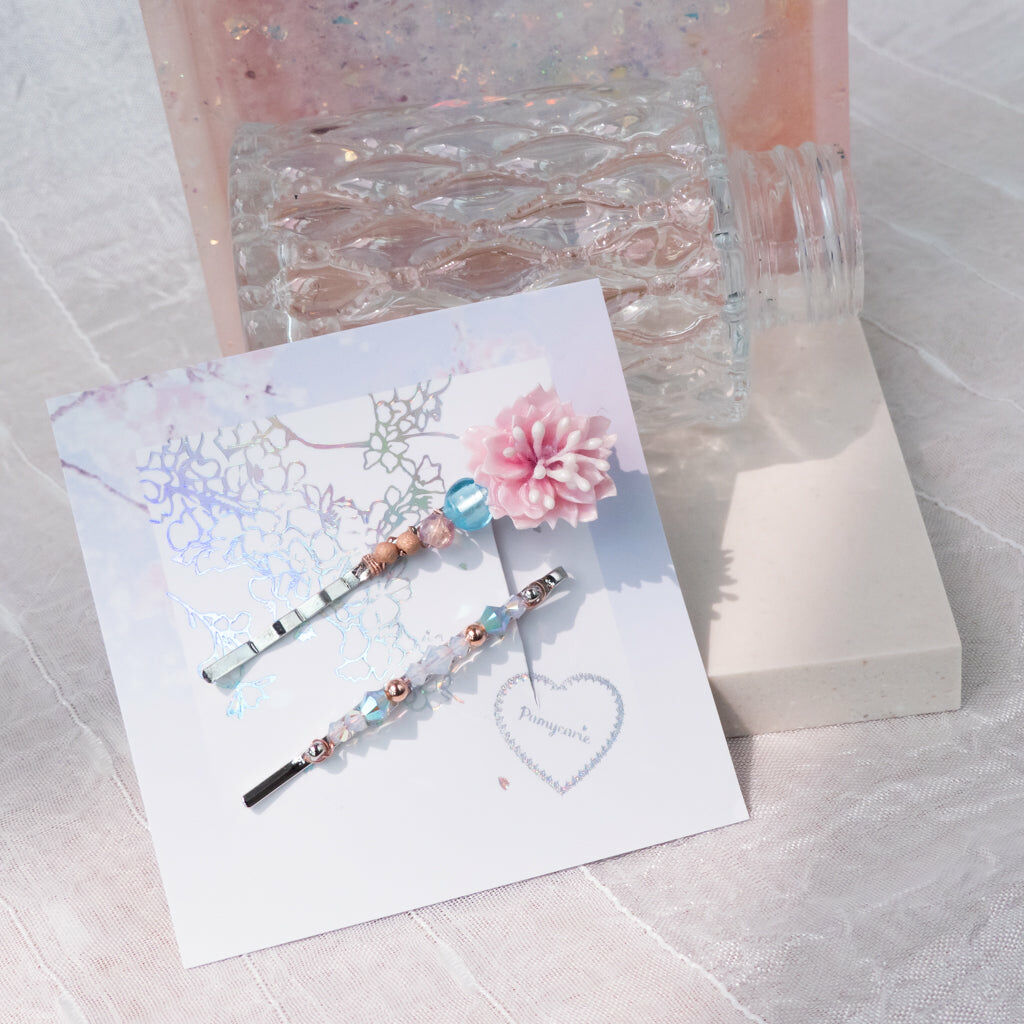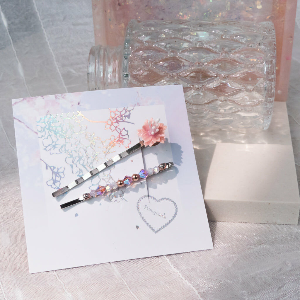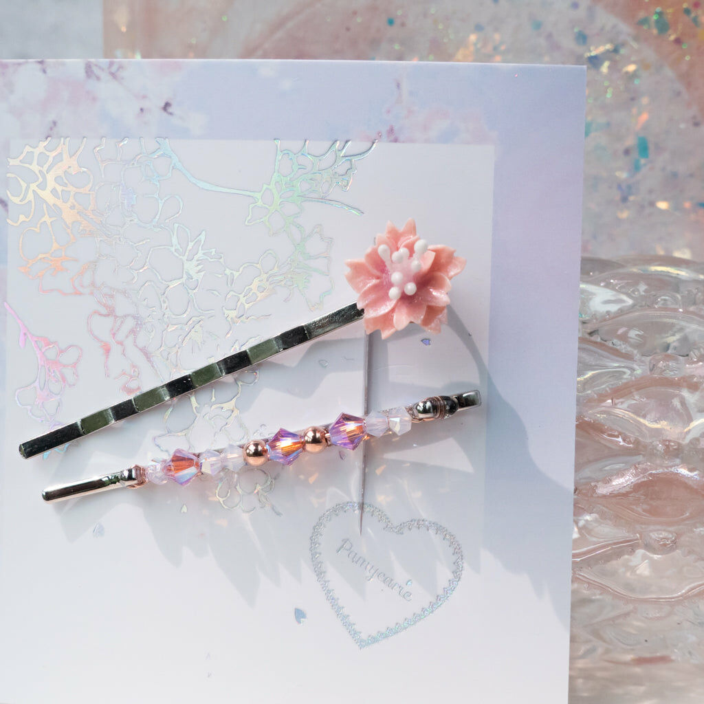鍍金線 | 施華洛世奇水晶 | 手製樹脂黏土花 | UV膠強化保護層 | 金屬髮夾