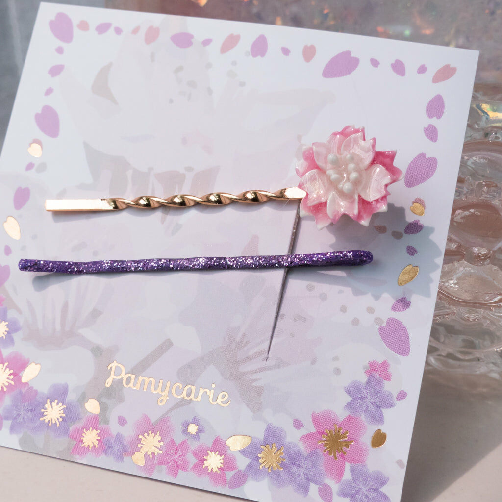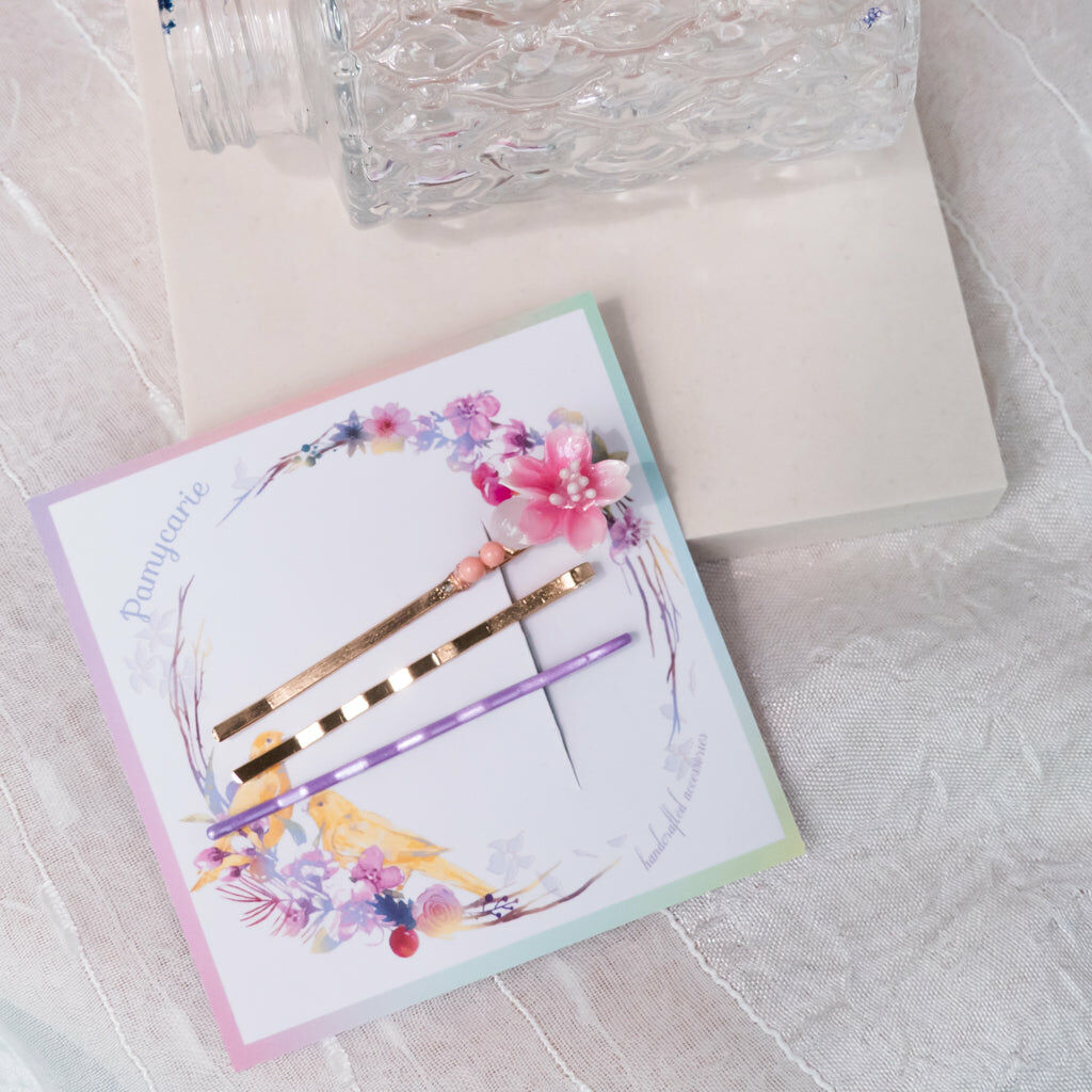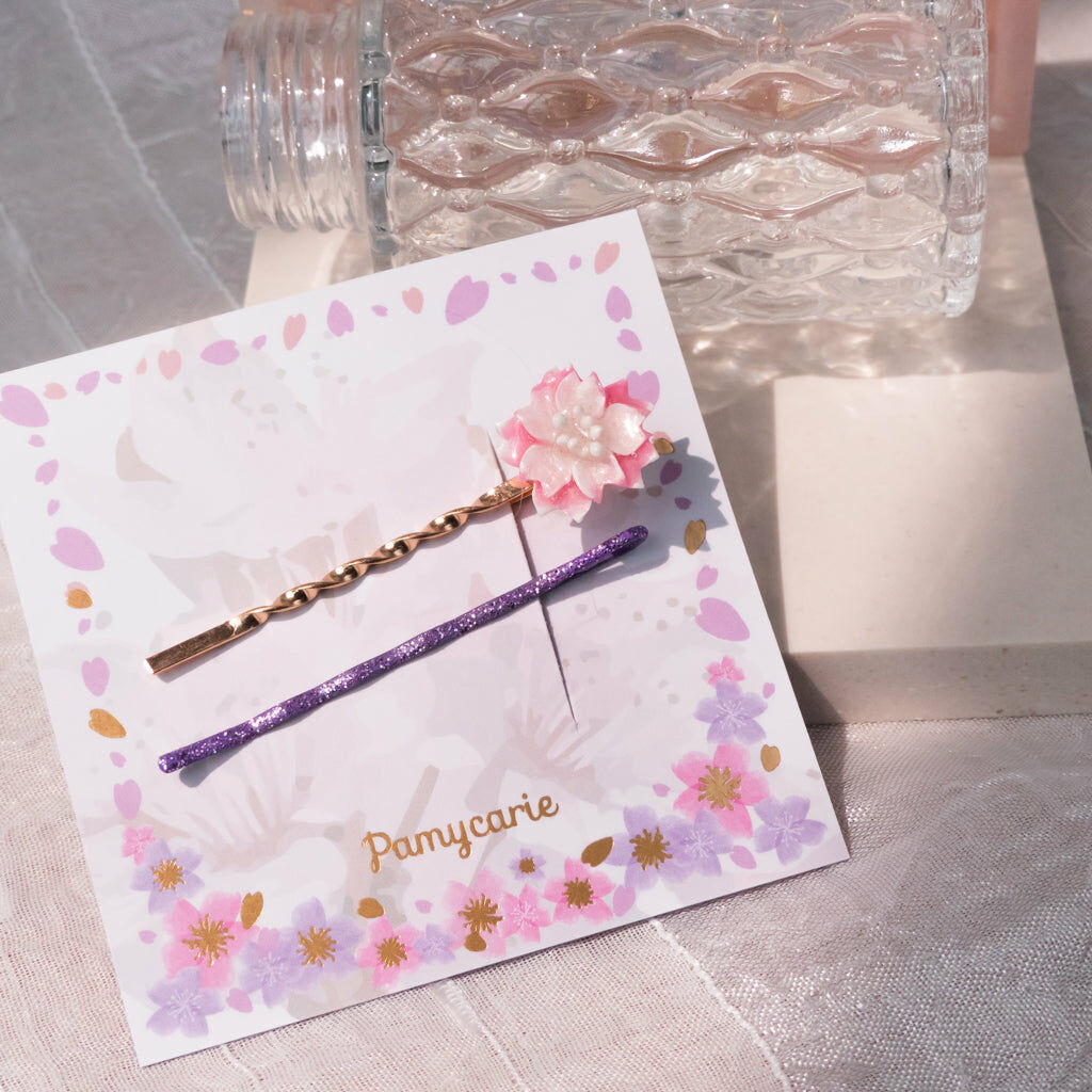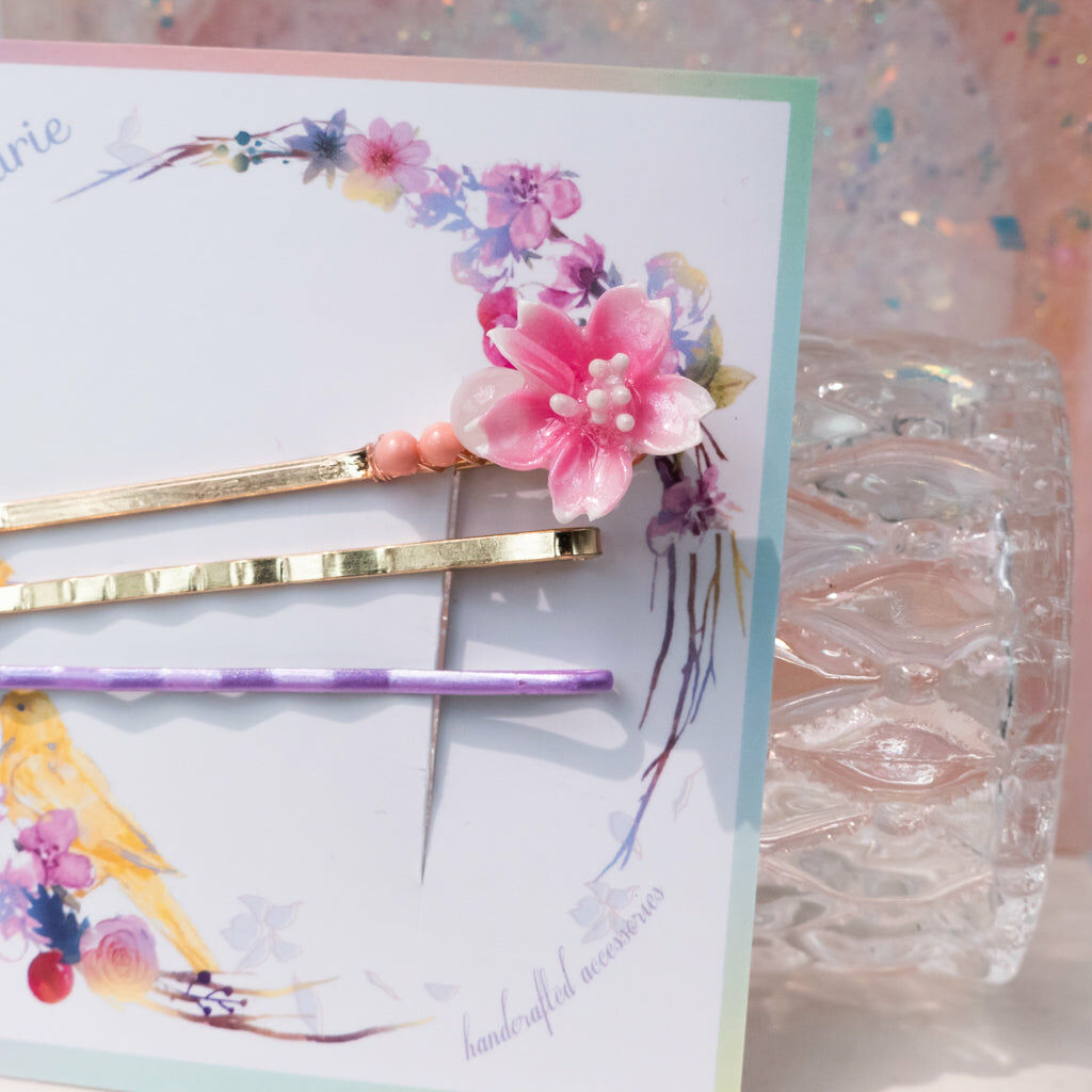 鍍金線 | 施華洛世奇水晶 | 手製樹脂黏土花 | UV膠強化保護層 | 金屬髮夾
