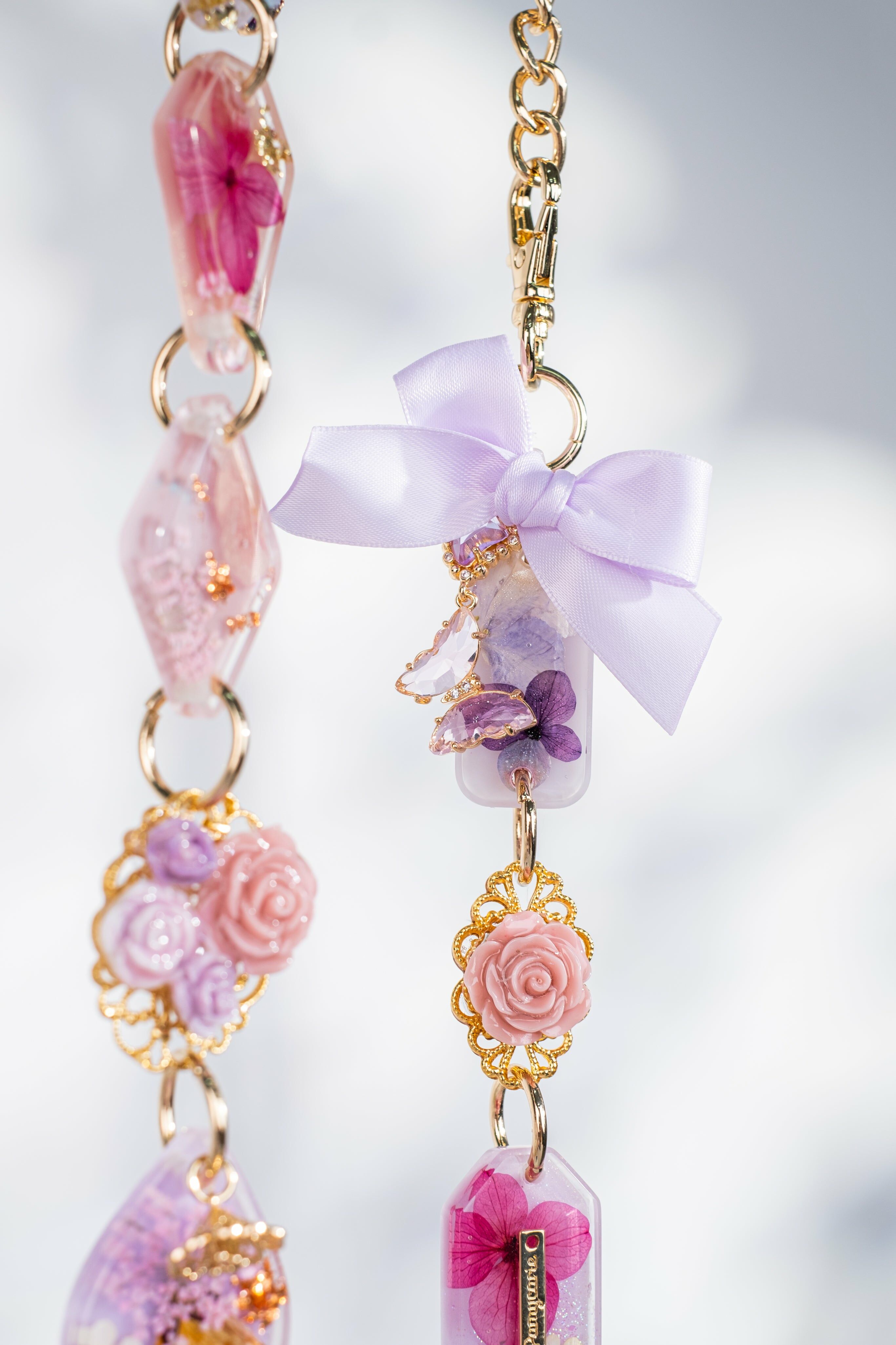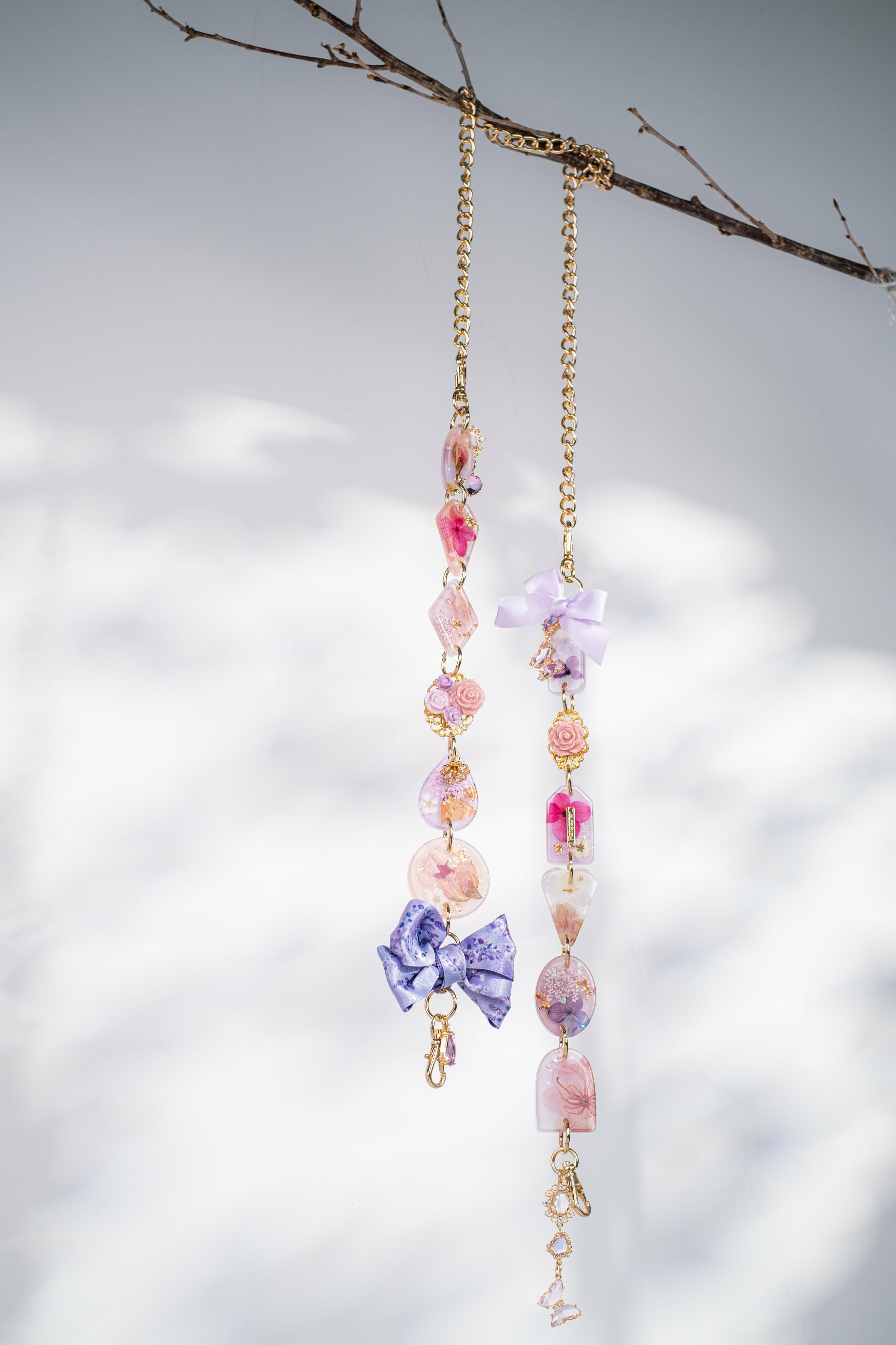 將櫻花與心願一同放進漂流瓶,好好保存,每日重溫當初的期待。這次首次,也許是唯一一次將真櫻花加進押花工藝品裡,仔細觀察每朵櫻花還能看到她獨有的紋路,配搭溫柔的淡紫色調,這款手機帶是喜愛櫻花的妳不能錯過的單品。