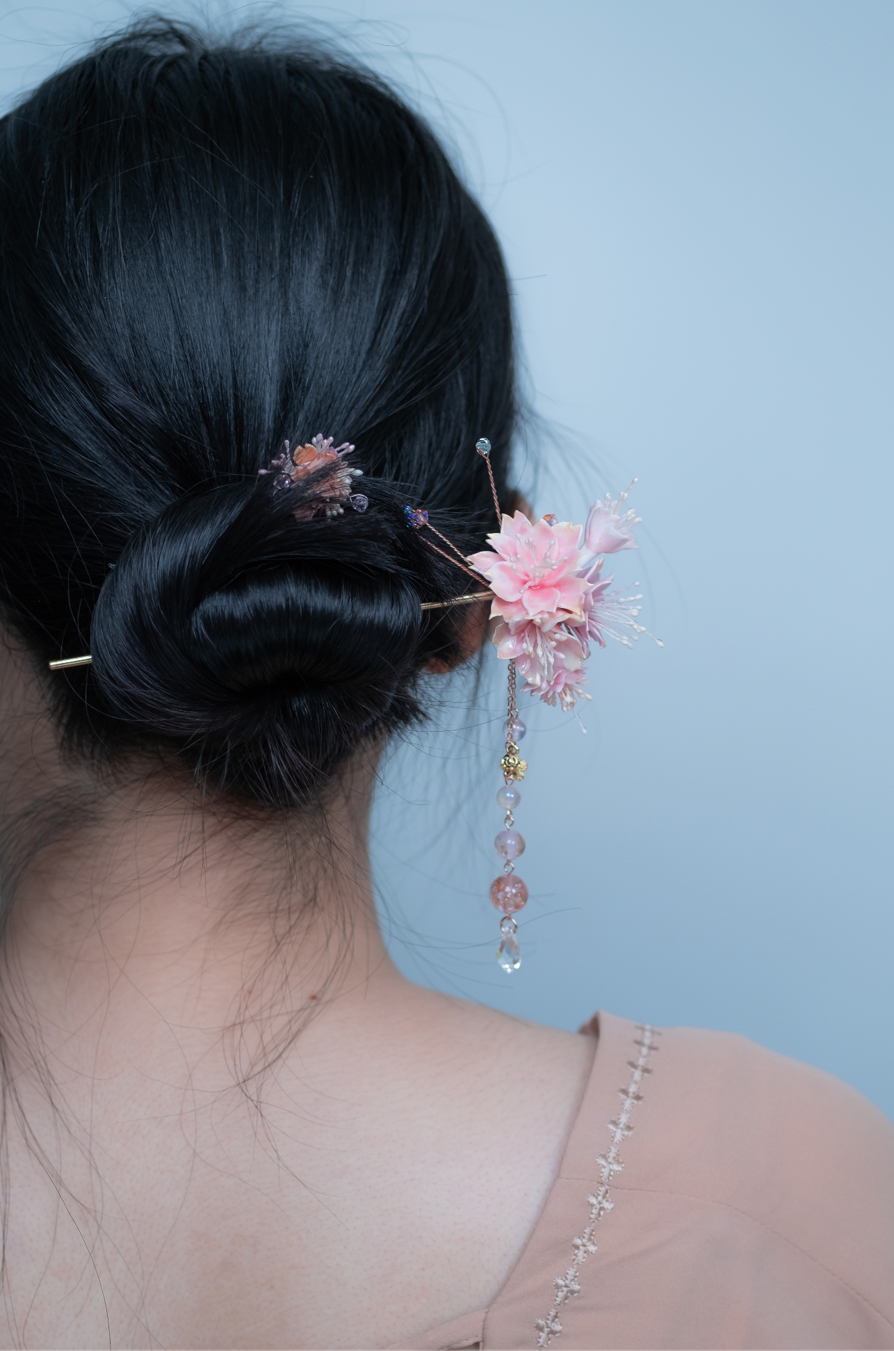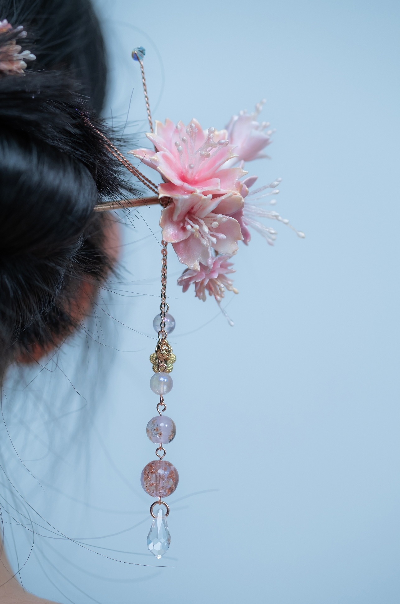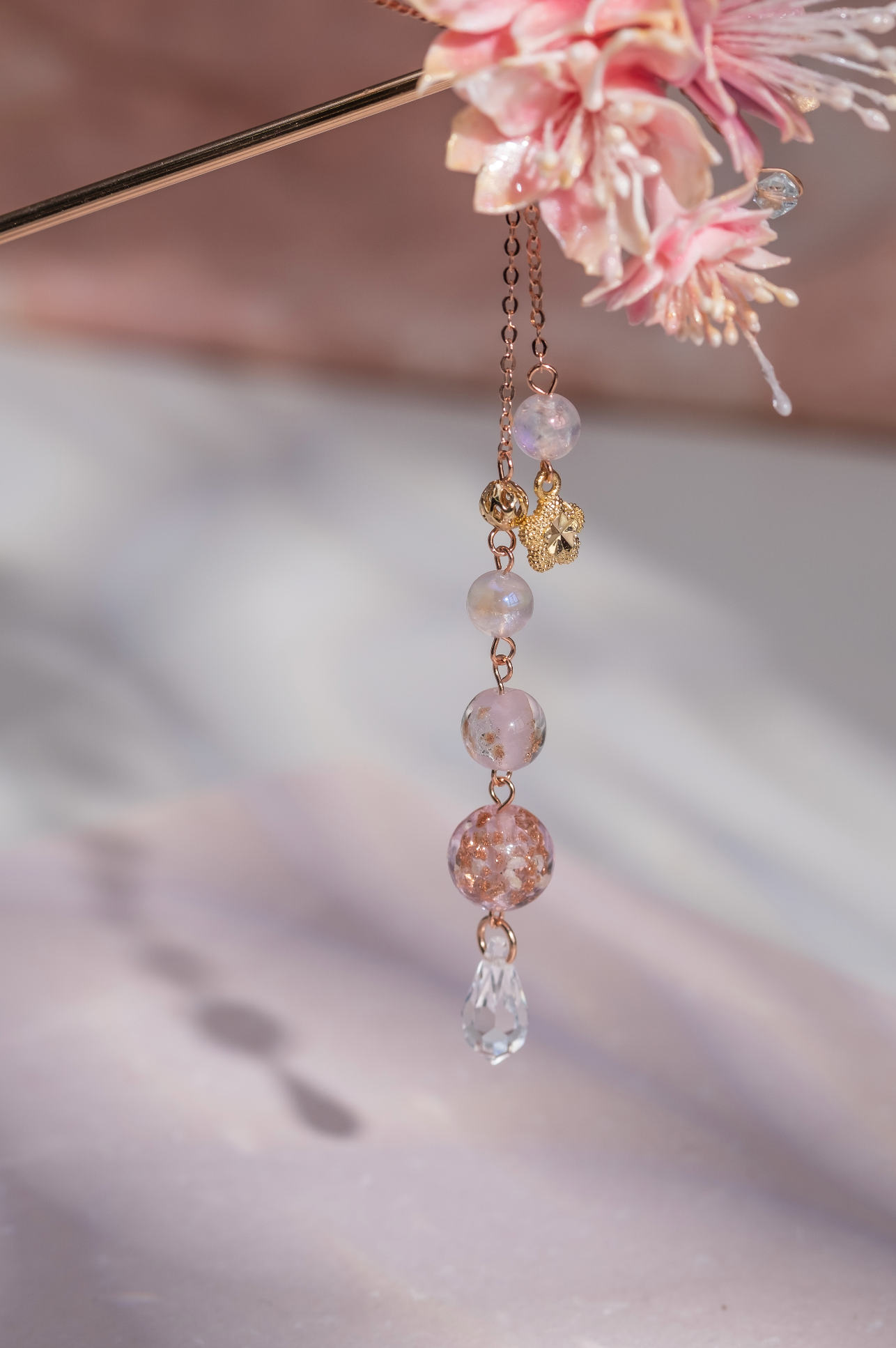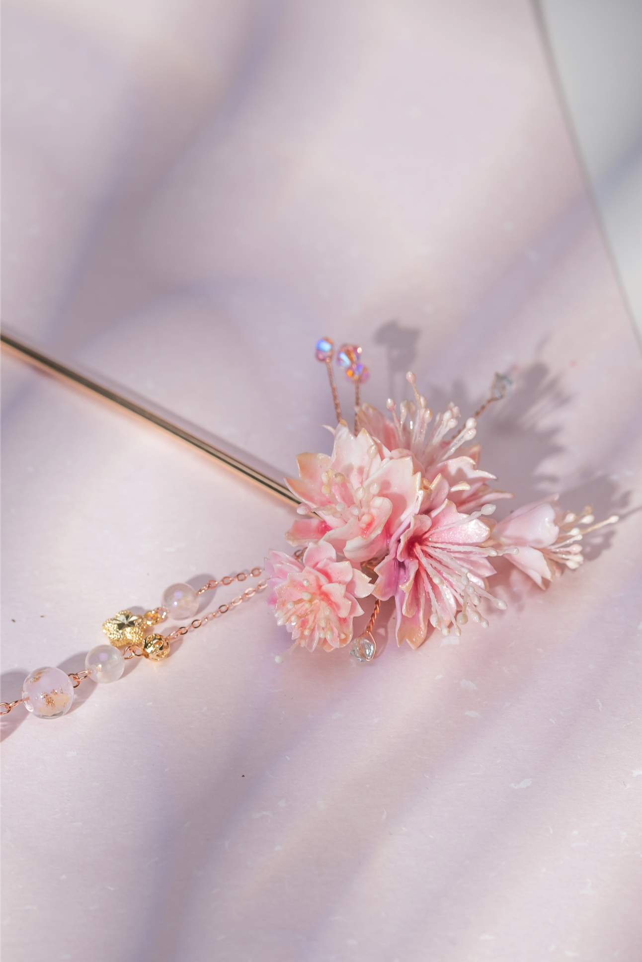 美國進口Beadsmith銀線 | 施華洛世奇水晶 | 手製樹脂黏土花| UV強化保護層 | 鍍金髮簪