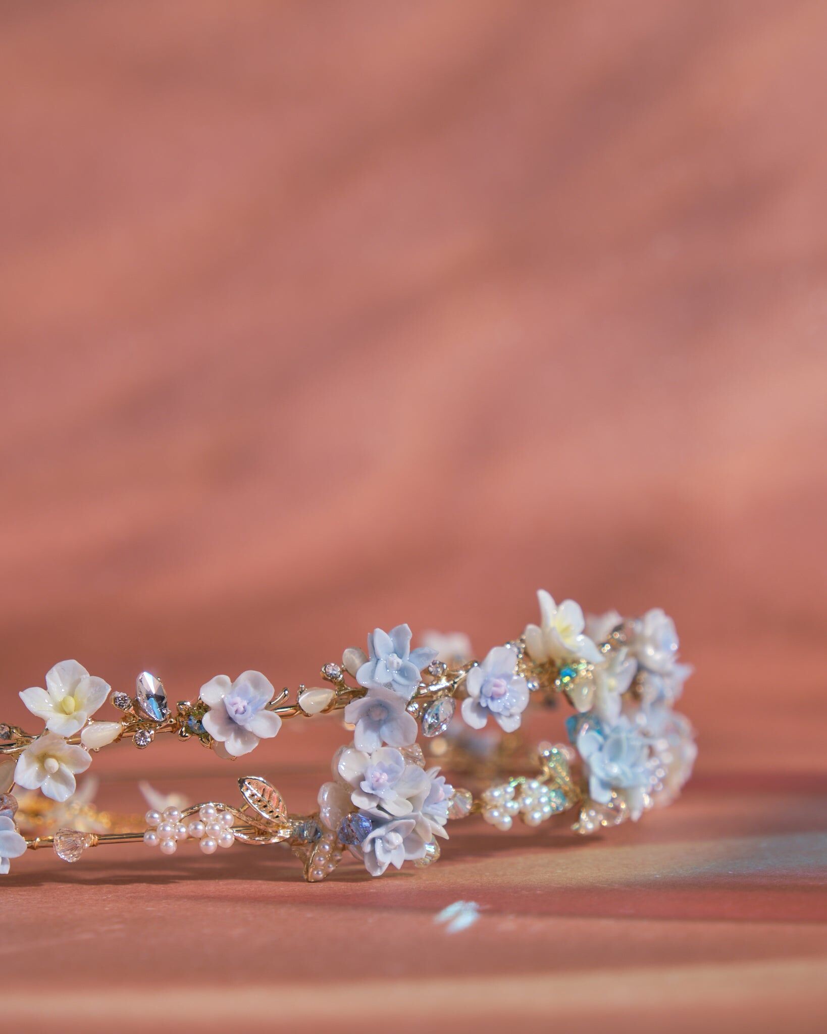 藍色重瓣繡球組成簡單可愛的髮箍!最近髮箍的潮流愈演愈烈,寬和份量重的髮箍越來越愛歡迎,想必大家都體驗到它的氛圍感和秘變高顱項的好處!這款作品配有一對垂鏈,可以拆下,也可以扣在頭箍末端,看起來效果超像配戴了長耳環一樣,沒有耳洞的女孩也可以考慮。