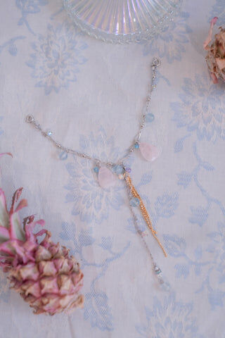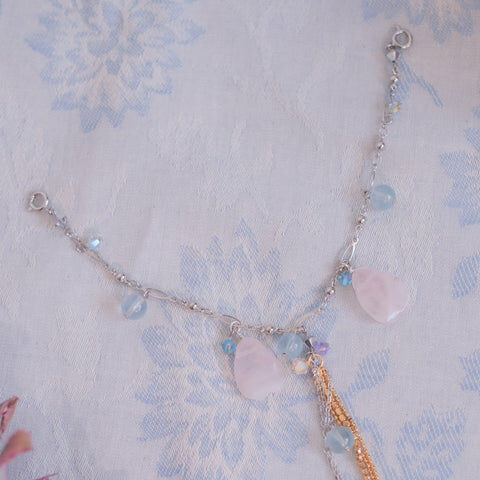 Gold Plated Artistic Wire | Swarovski Crystal | Handcrafted Resin Clay Flowers | UV Hardening Coating | Silver-plated Metal Clip | S925 Silver Chain | Rose Quartz Petal | Aquamarine