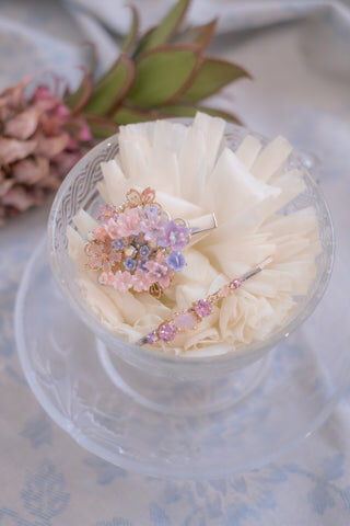 美國進口Beadsmith銀線 | 施華洛世奇水晶 | 手製樹脂黏土花| UV強化保護層 | 鍍銀髮夾 |S925純銀鏈 | 粉晶花瓣海藍寶