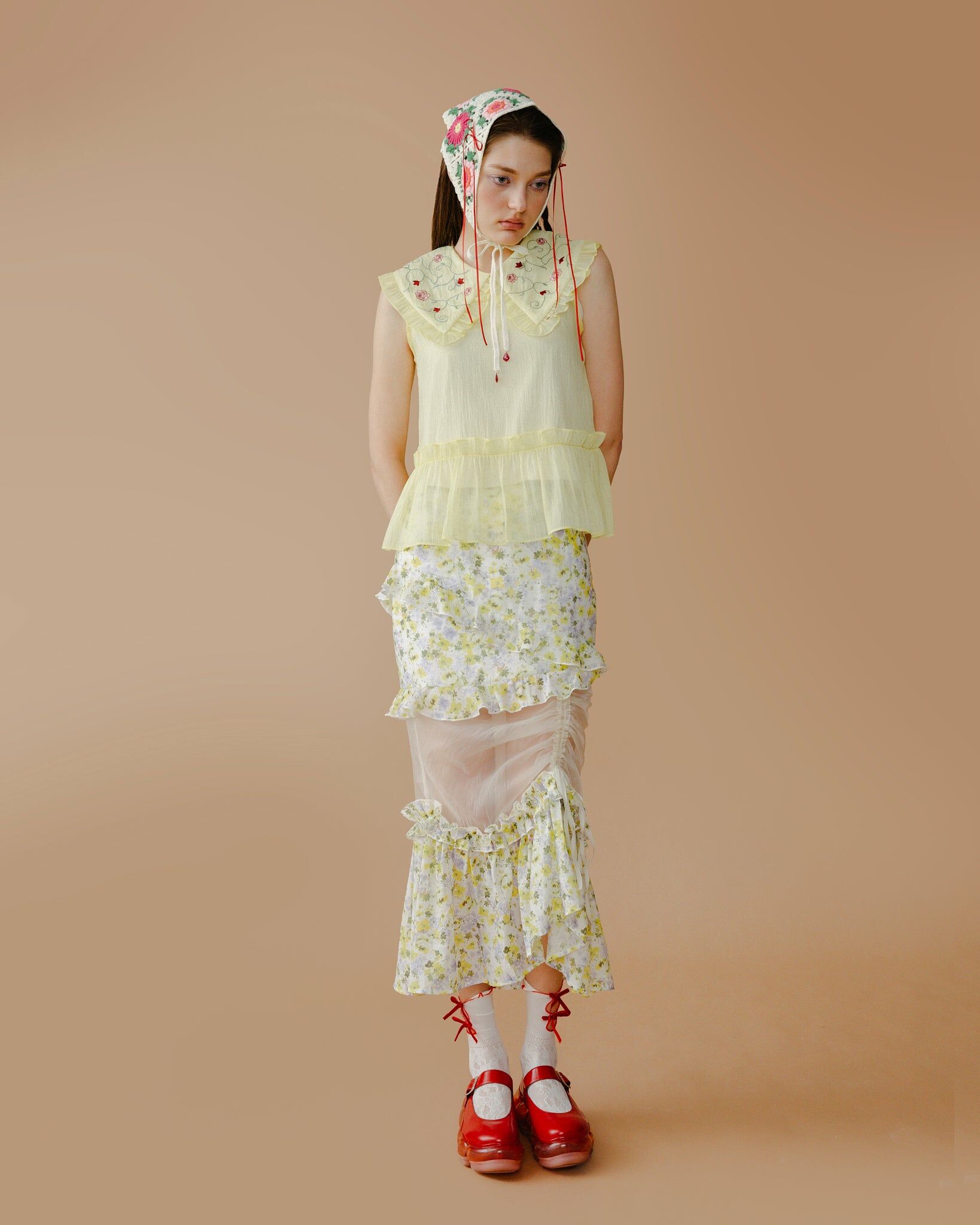 Sheer Ruffled Blouse with Embroidered Collar (Yellow/Purple)