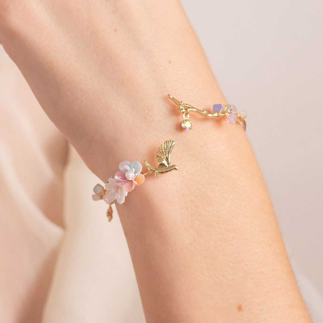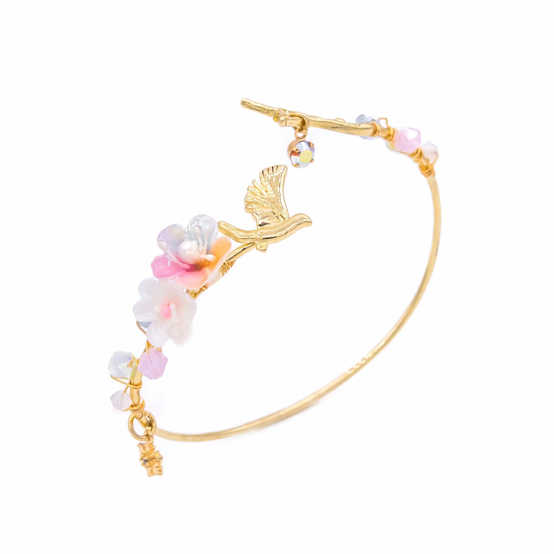 American Bead Smith Silver Wire | Austrian Crystal | Handcrafted Resin Clay Flower | UV Hardening Coating | 14K Gold-plated Bangle