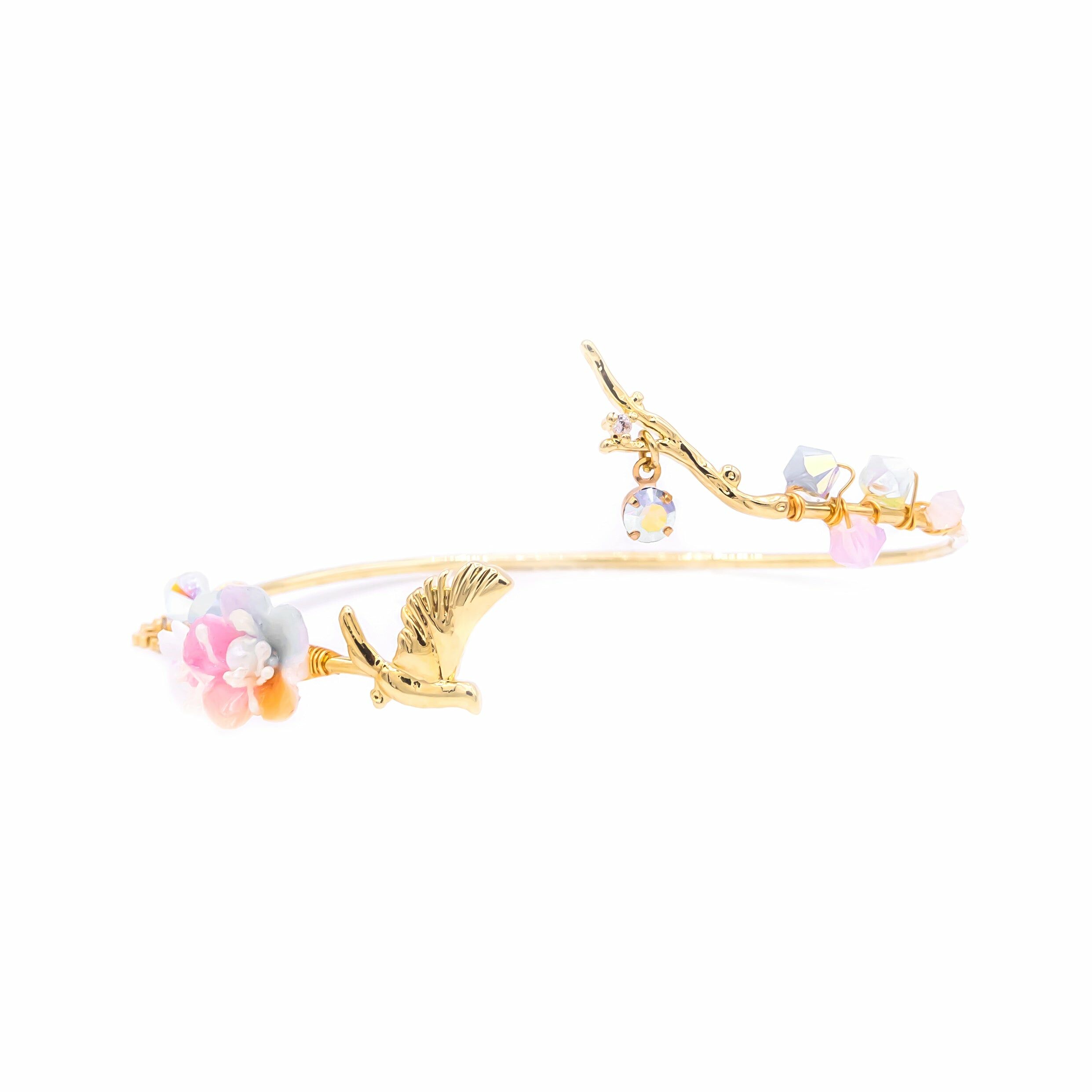 美國進口Beadsmith純銀線 | 奧地利水晶 | 手製樹脂黏土花 | UV膠強化保護層 | 銅鍍14K金手鐲