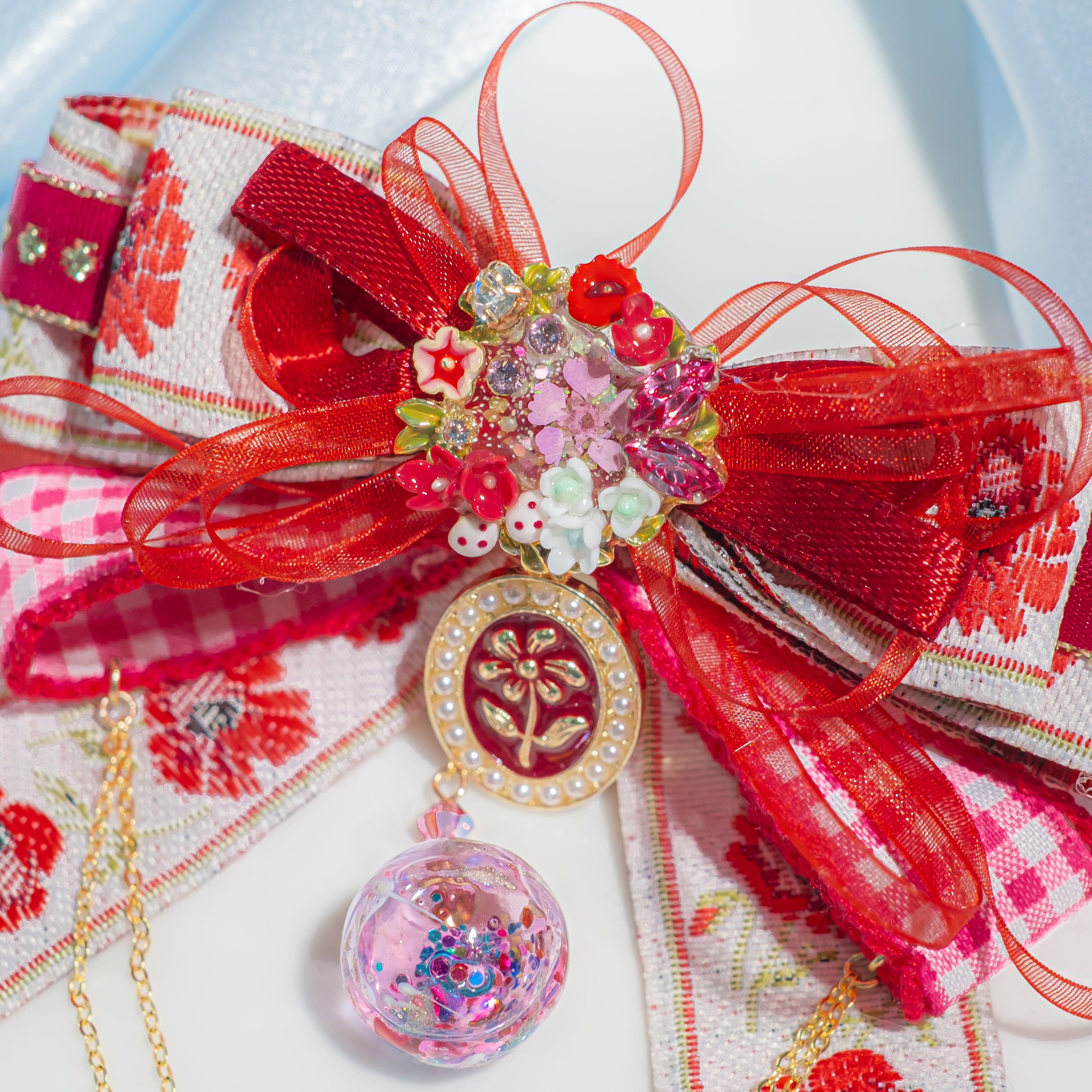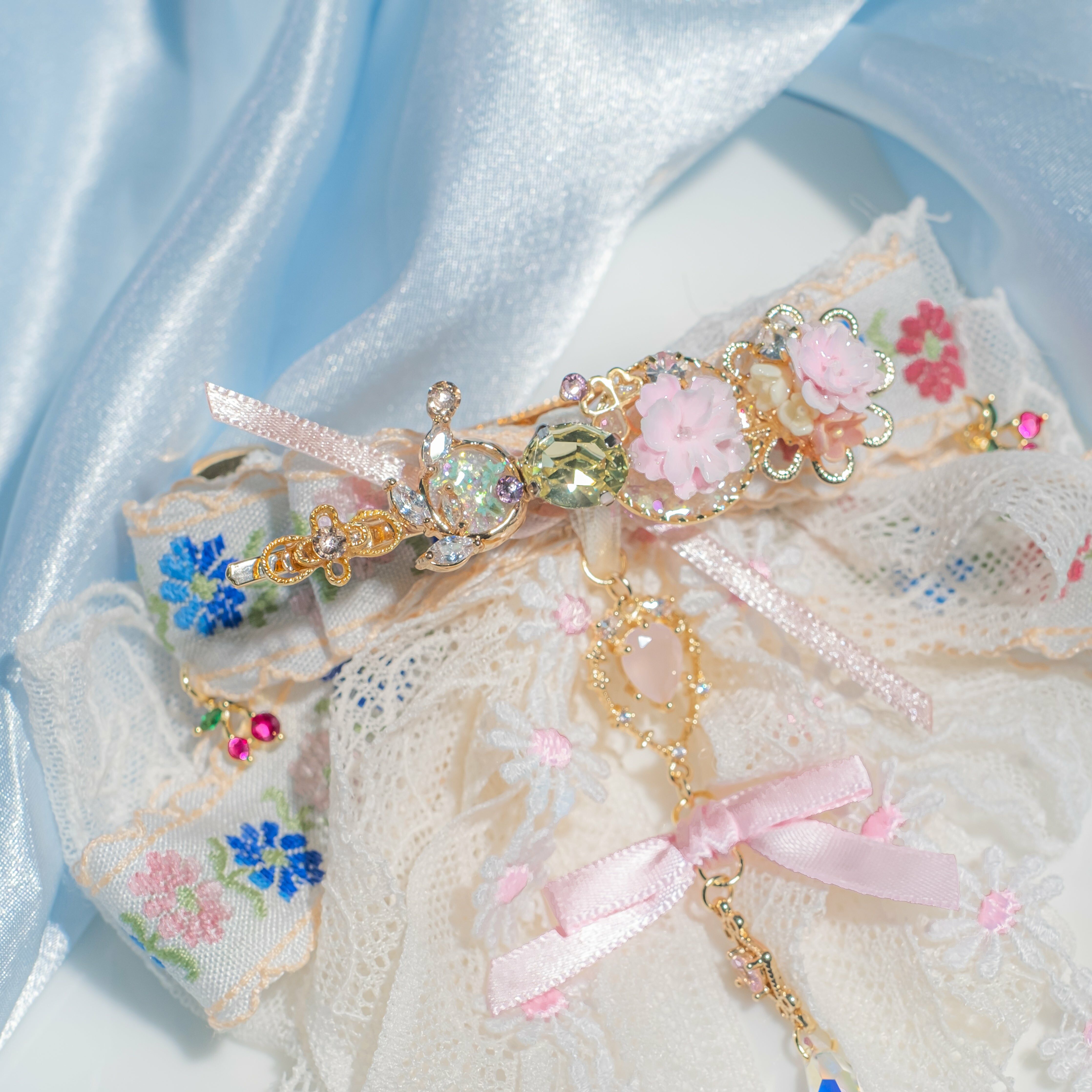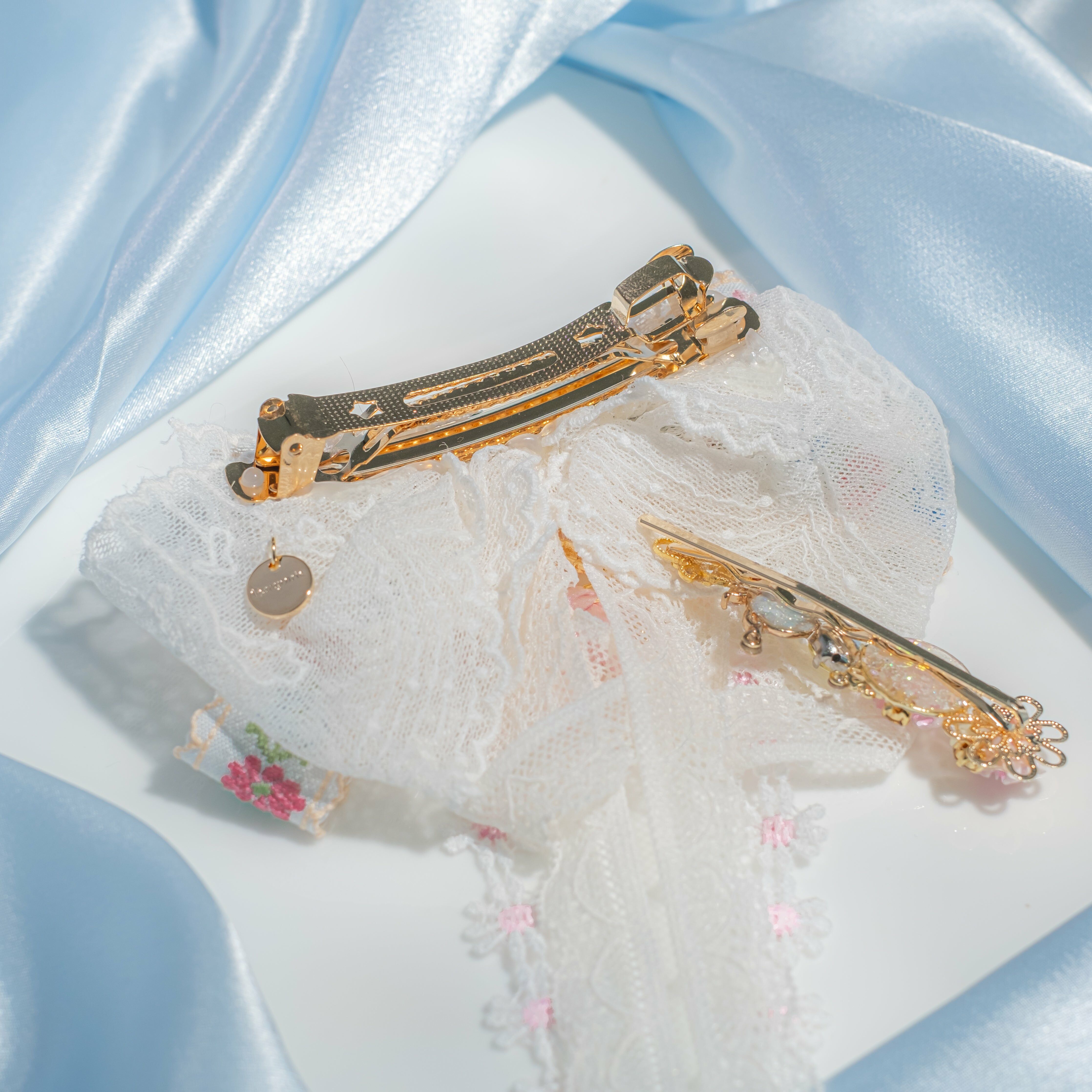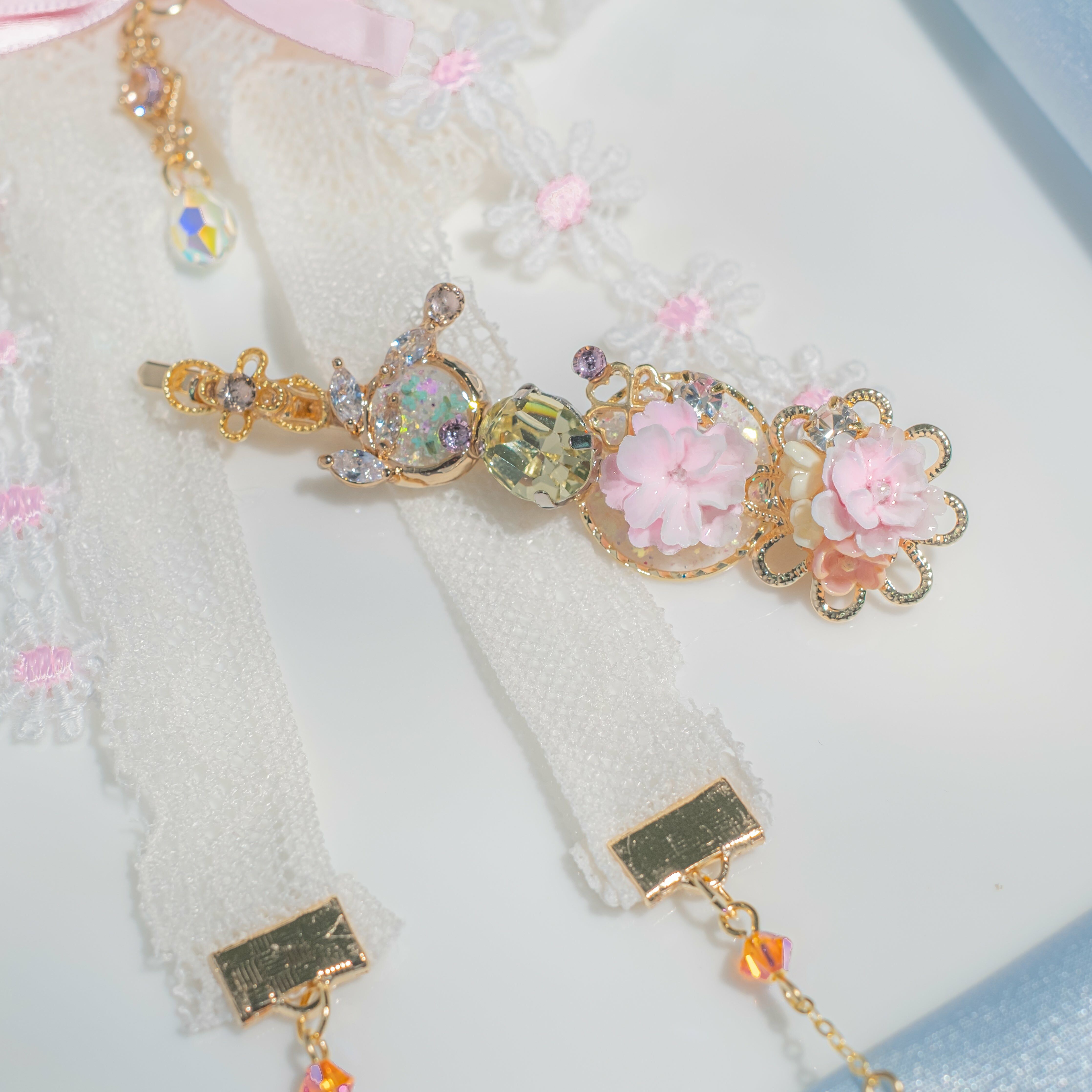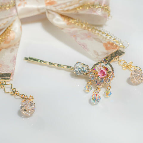 鍍金線 | 施華洛世奇水晶 | 手製樹脂黏土花 | UV膠強化保護層 | 金屬髮夾