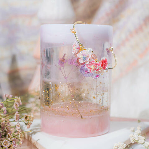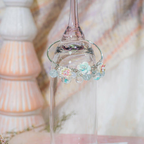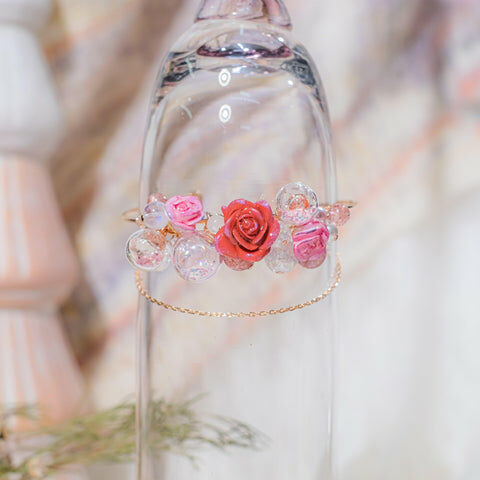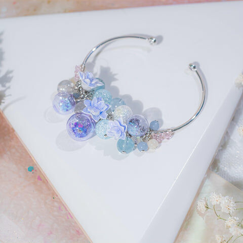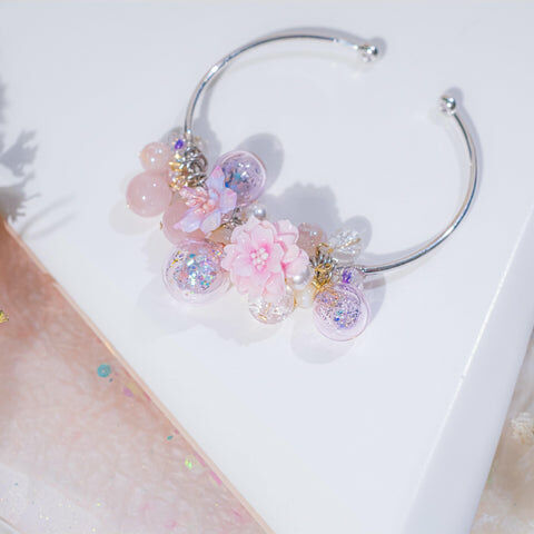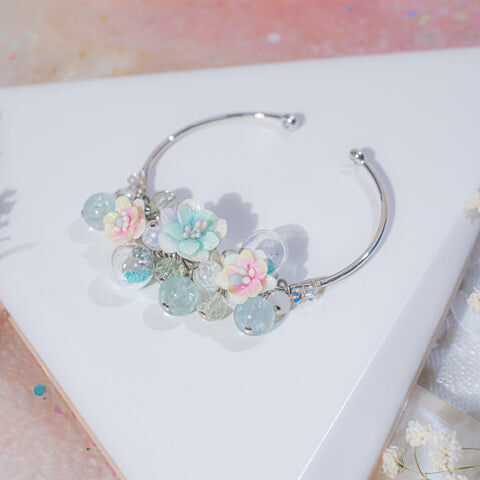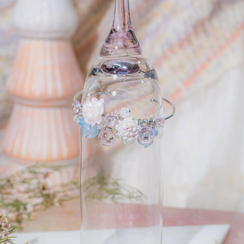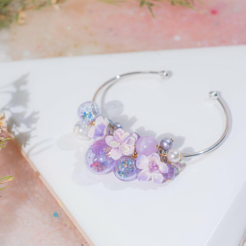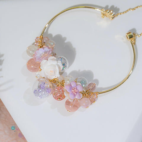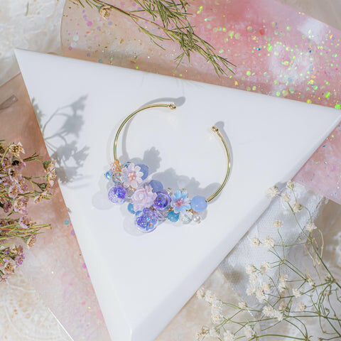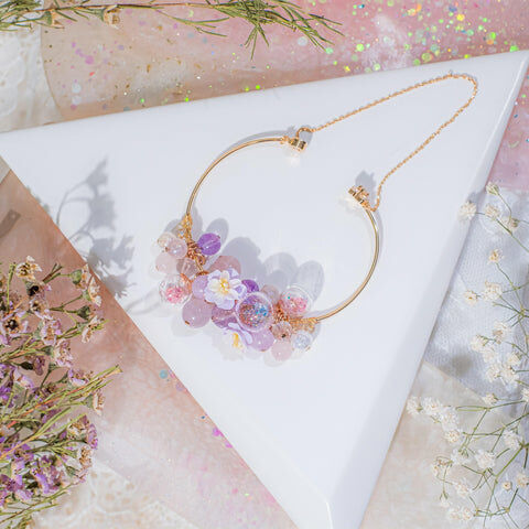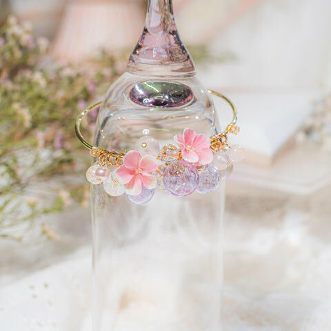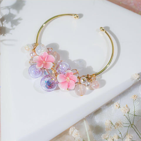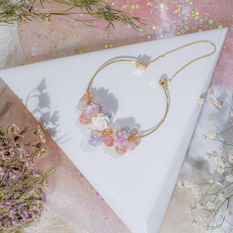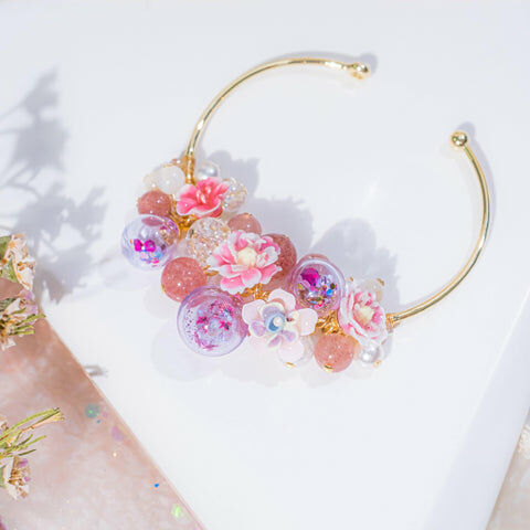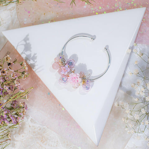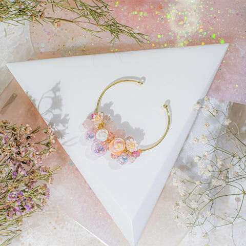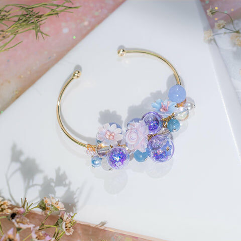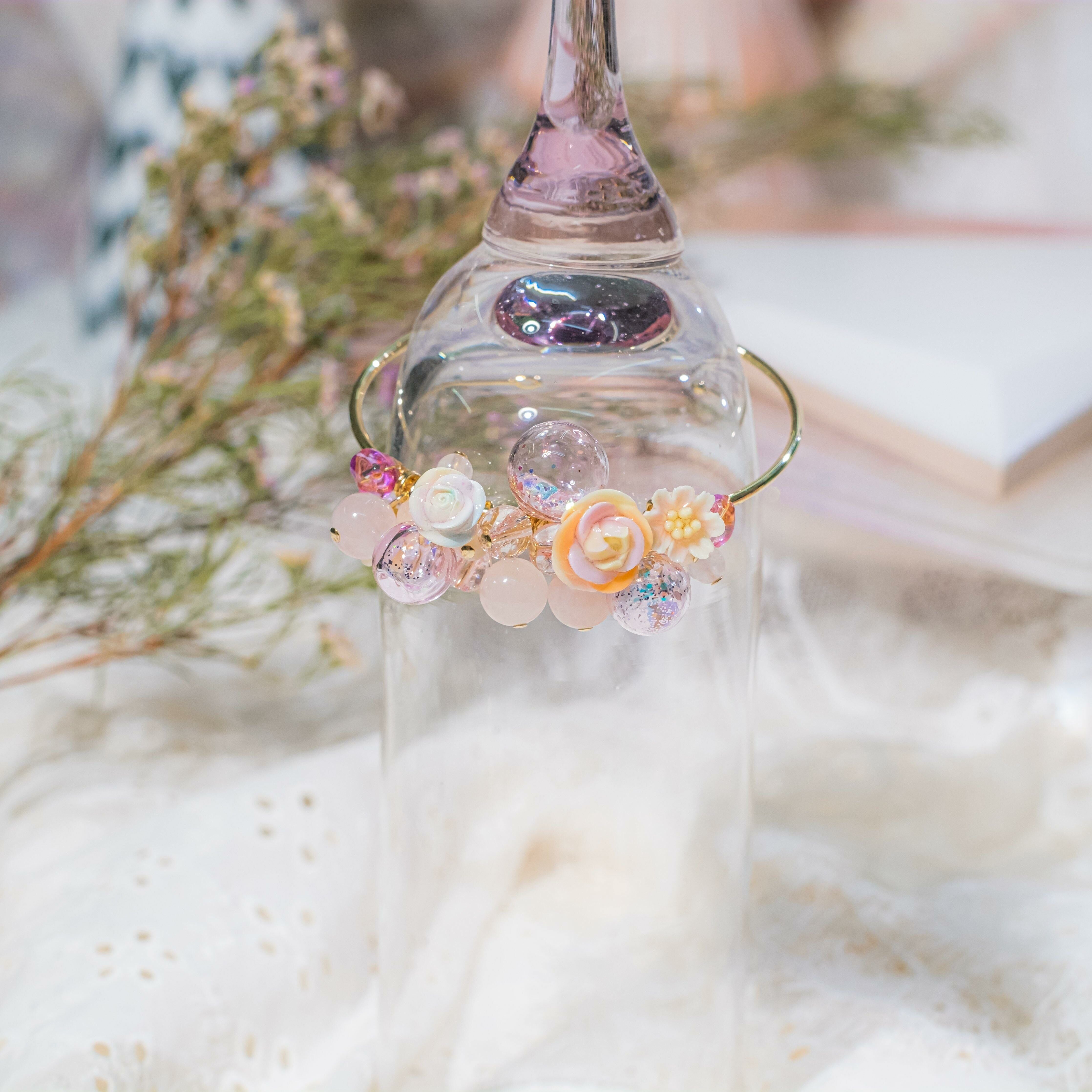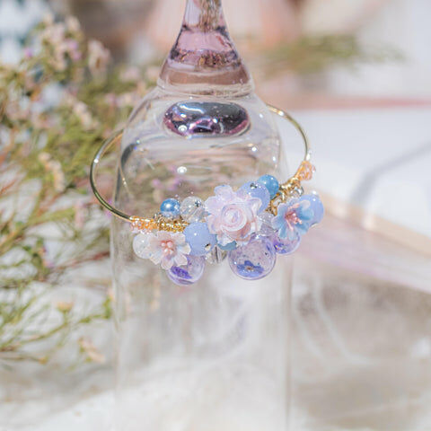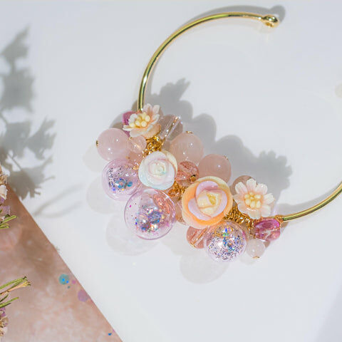 鍍金線 | 施華洛世奇水晶 | 手製樹脂黏土花 | UV膠強化保護層 | 鍍金/銀 金屬手鐲