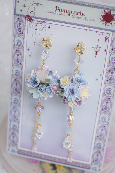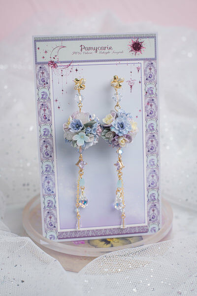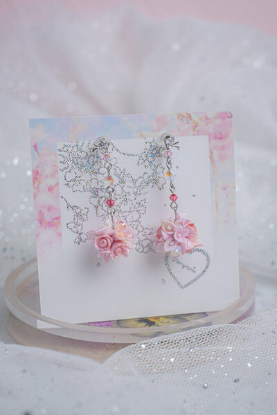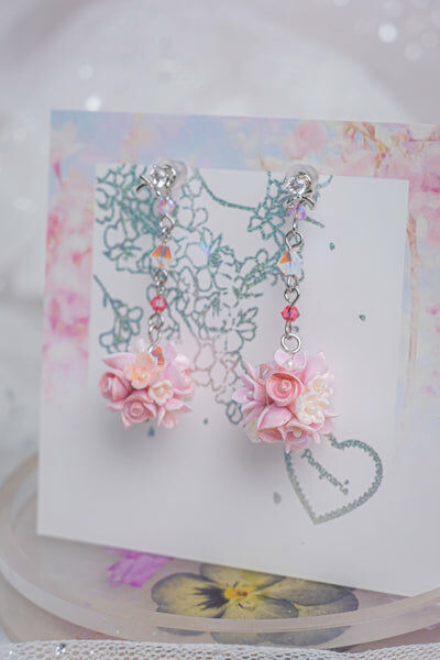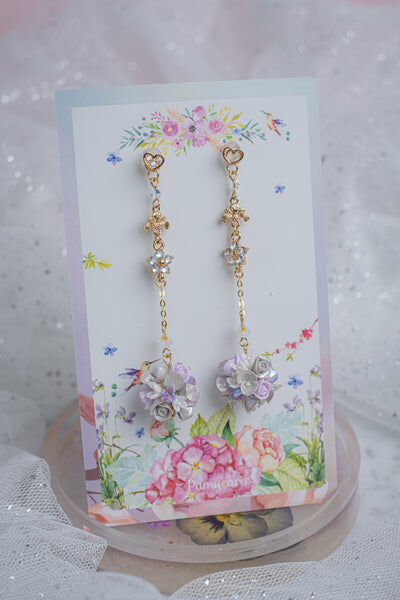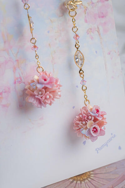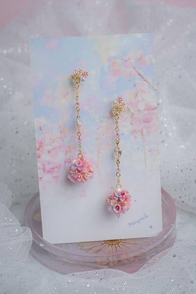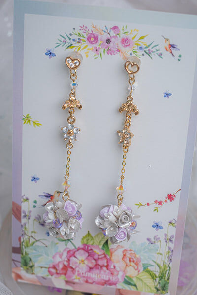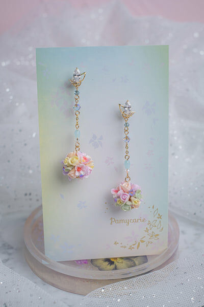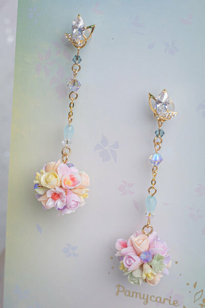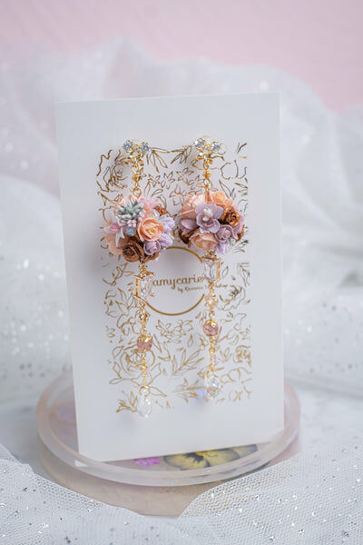 鍍金線 | 施華洛世奇水晶 | 手製樹脂黏土花 | UV膠強化保護層 | 鍍金925純銀耳釘