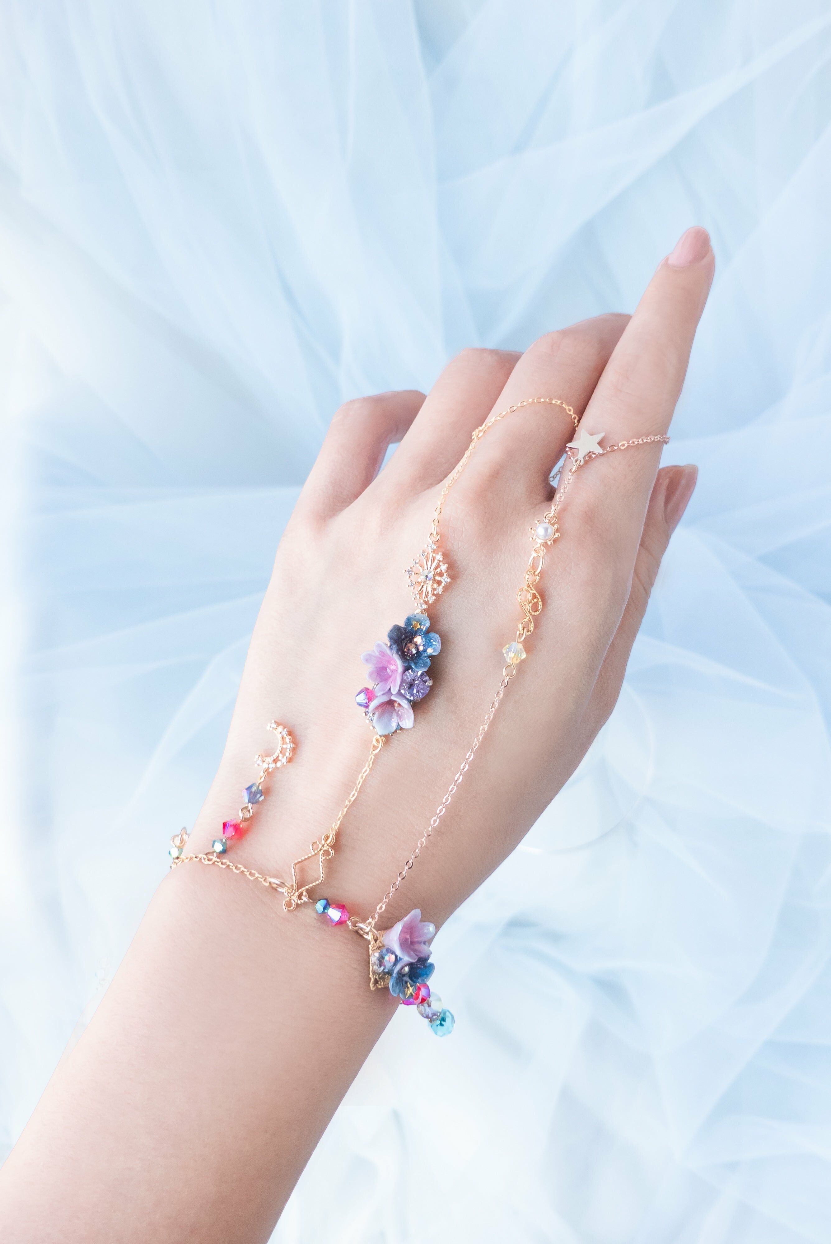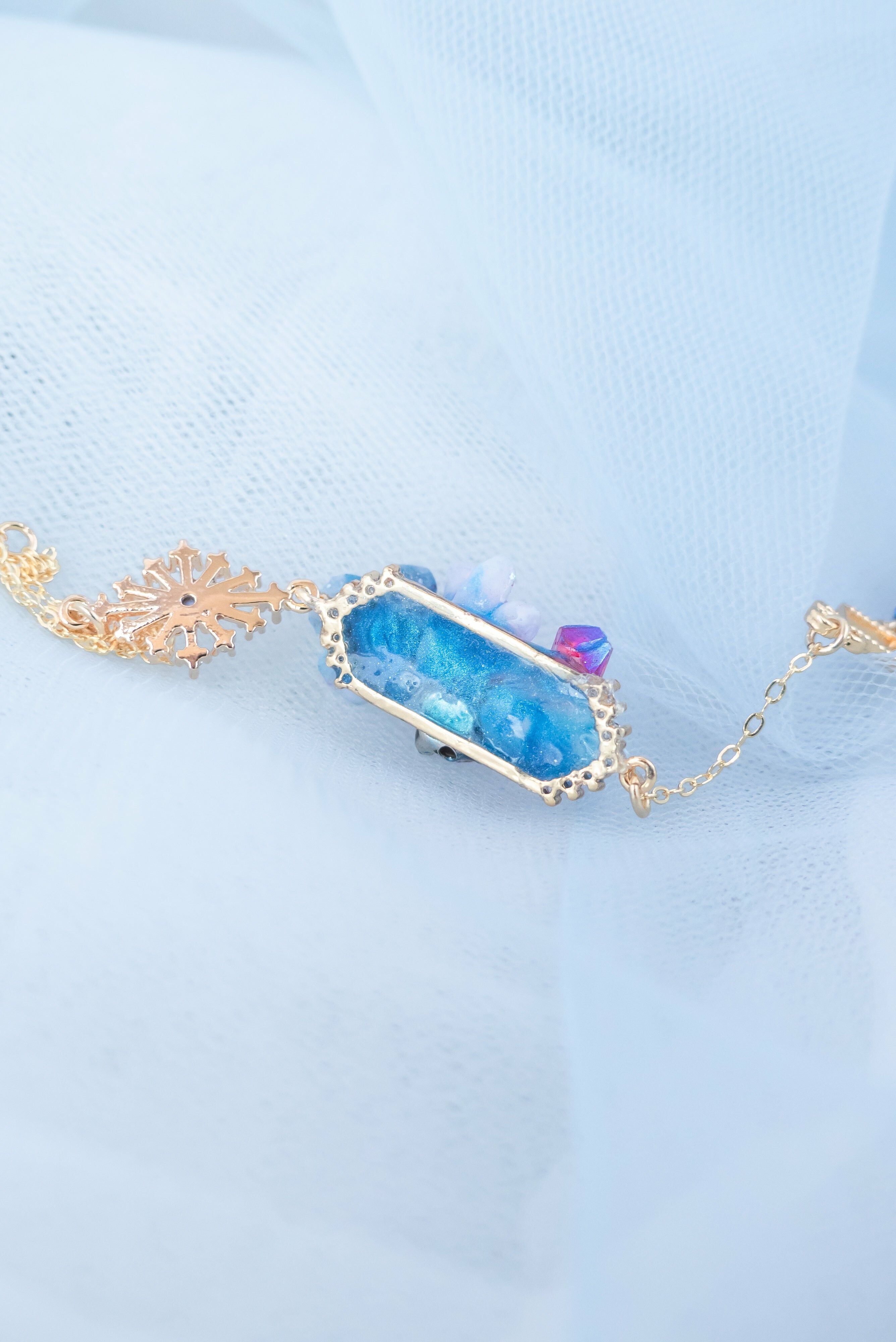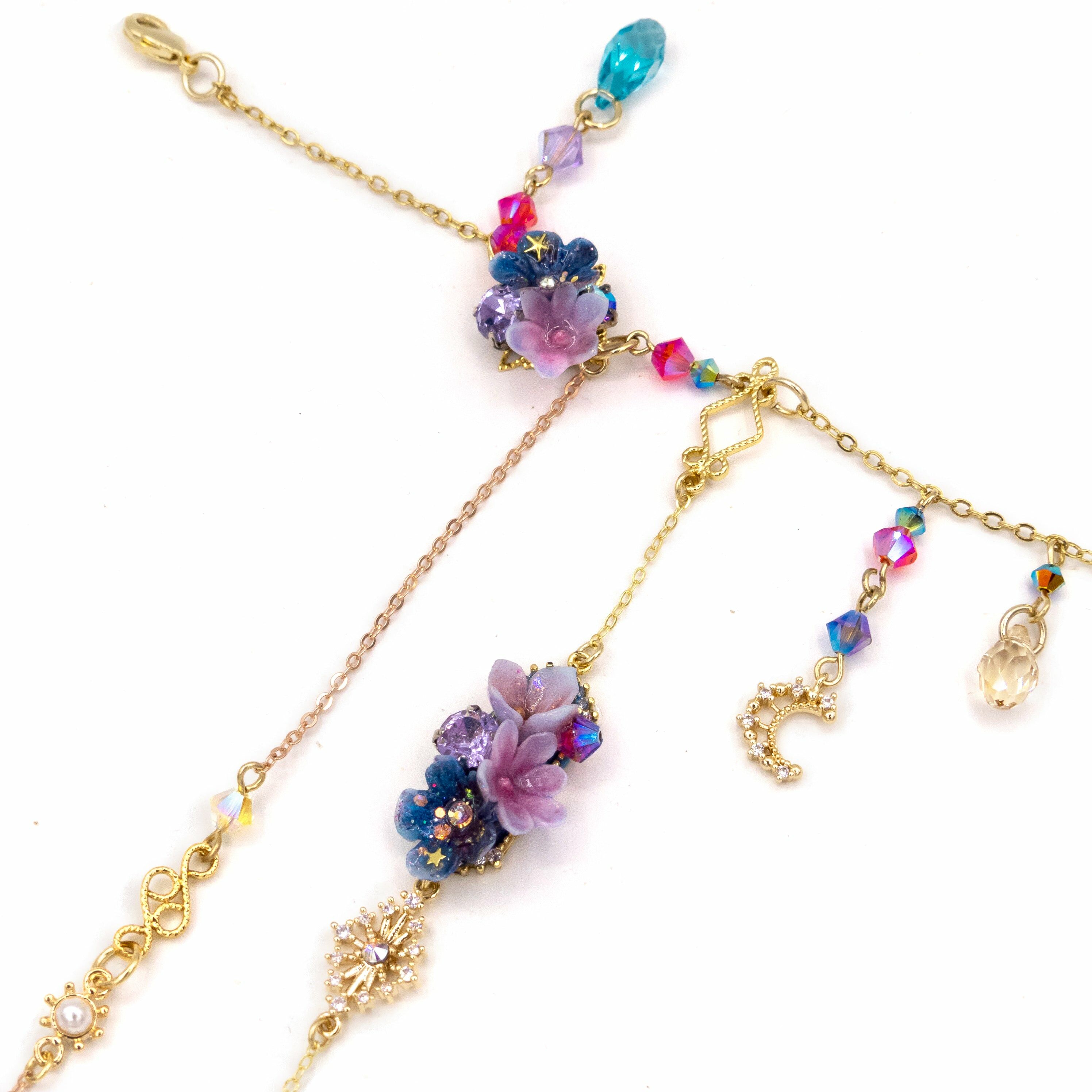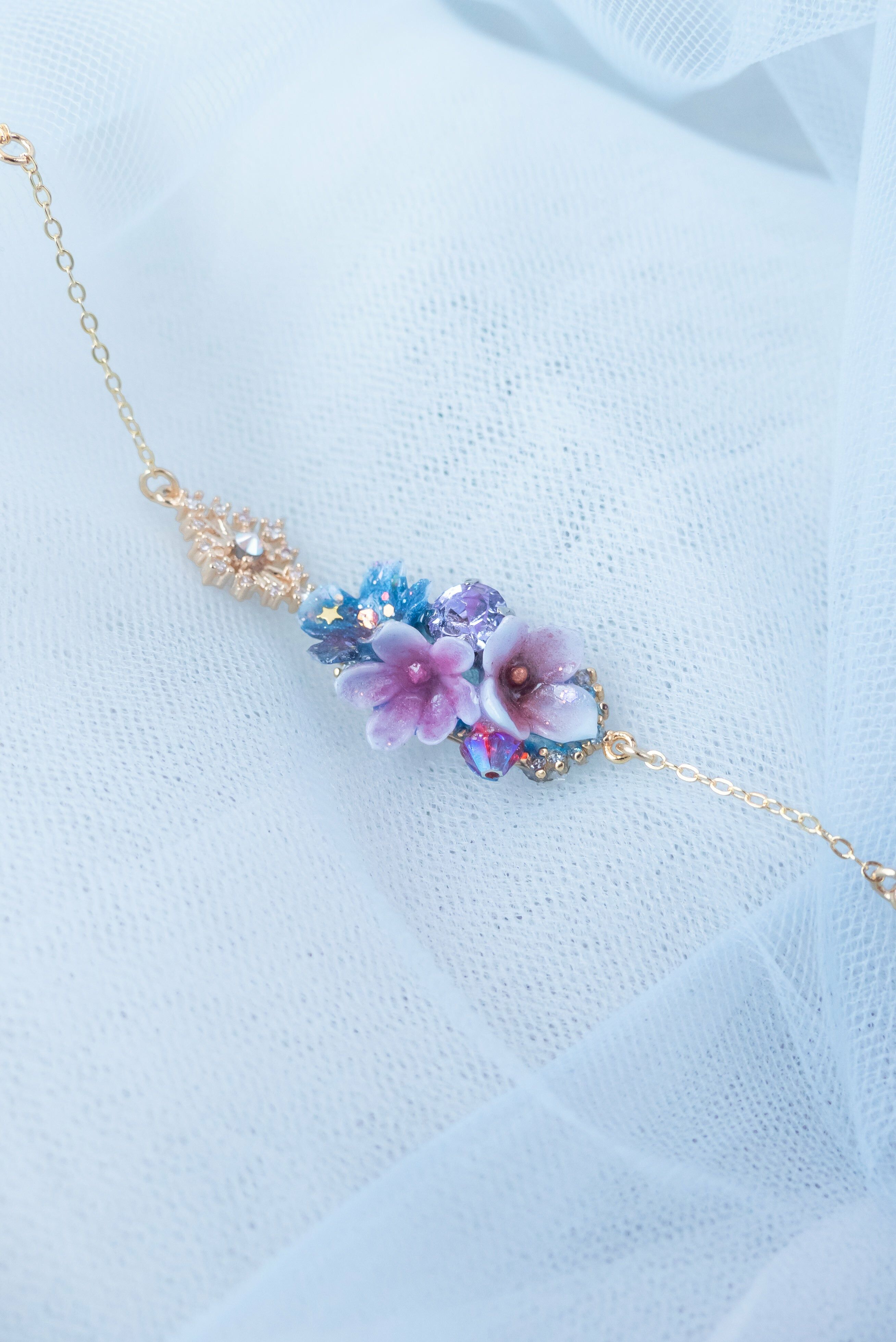 鍍金銀線 | 施華洛世奇水晶 | 手製樹脂黏土花 | UV膠強化保護層 | 鍍14K金手鍊