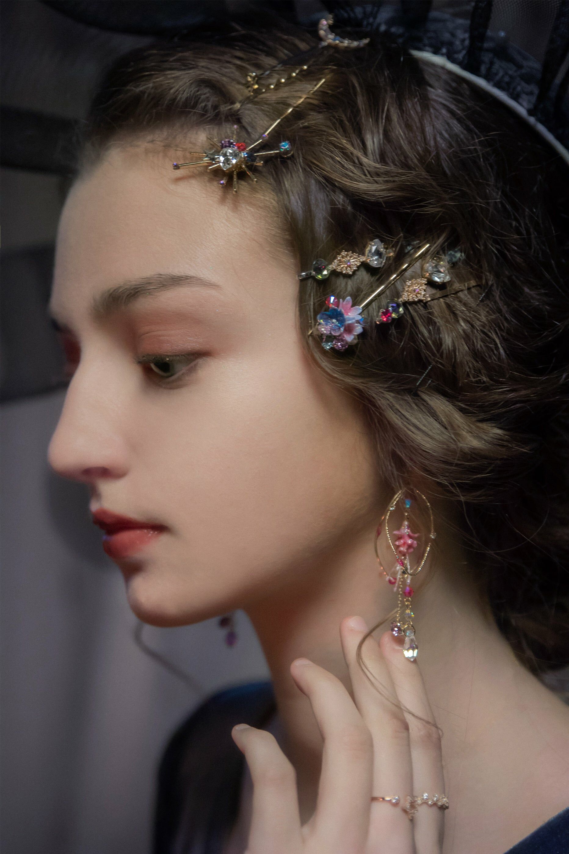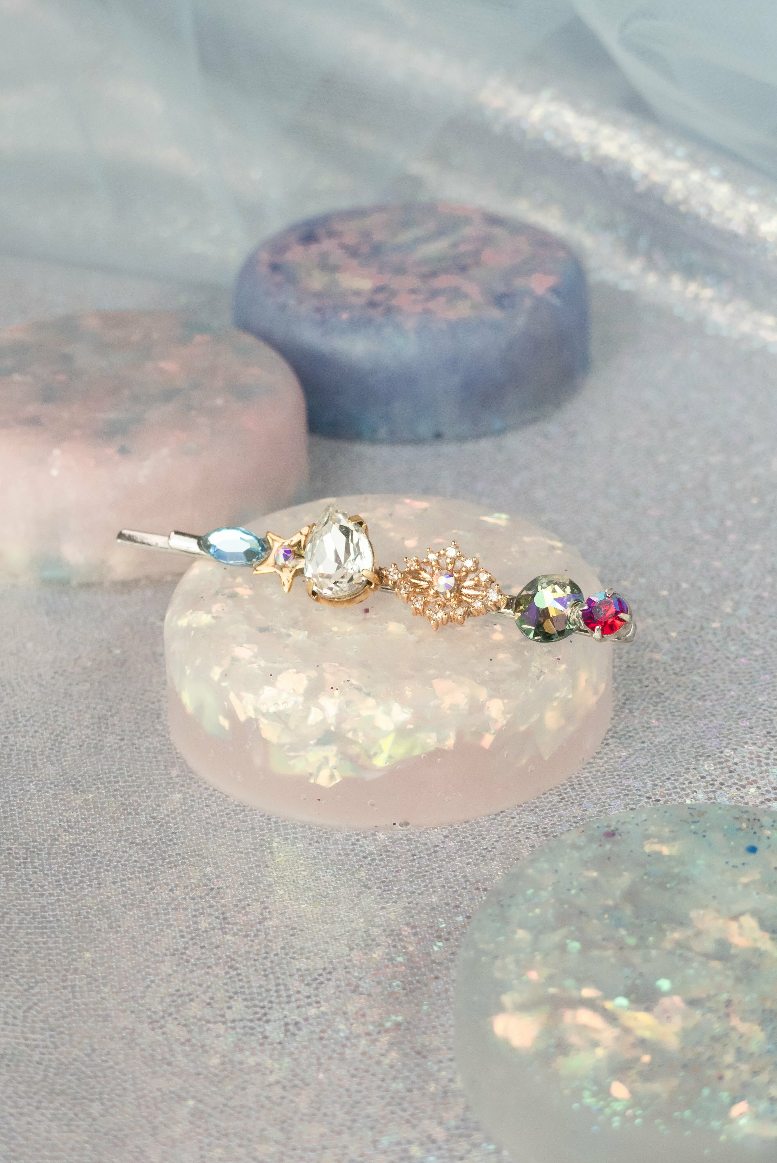 鍍金銀線 | 施華洛世奇水晶 | 日本鋯石 | 手製樹脂黏土花 | 幻彩樹脂膠 | UV膠強化保護層 | 鍍金髮夾