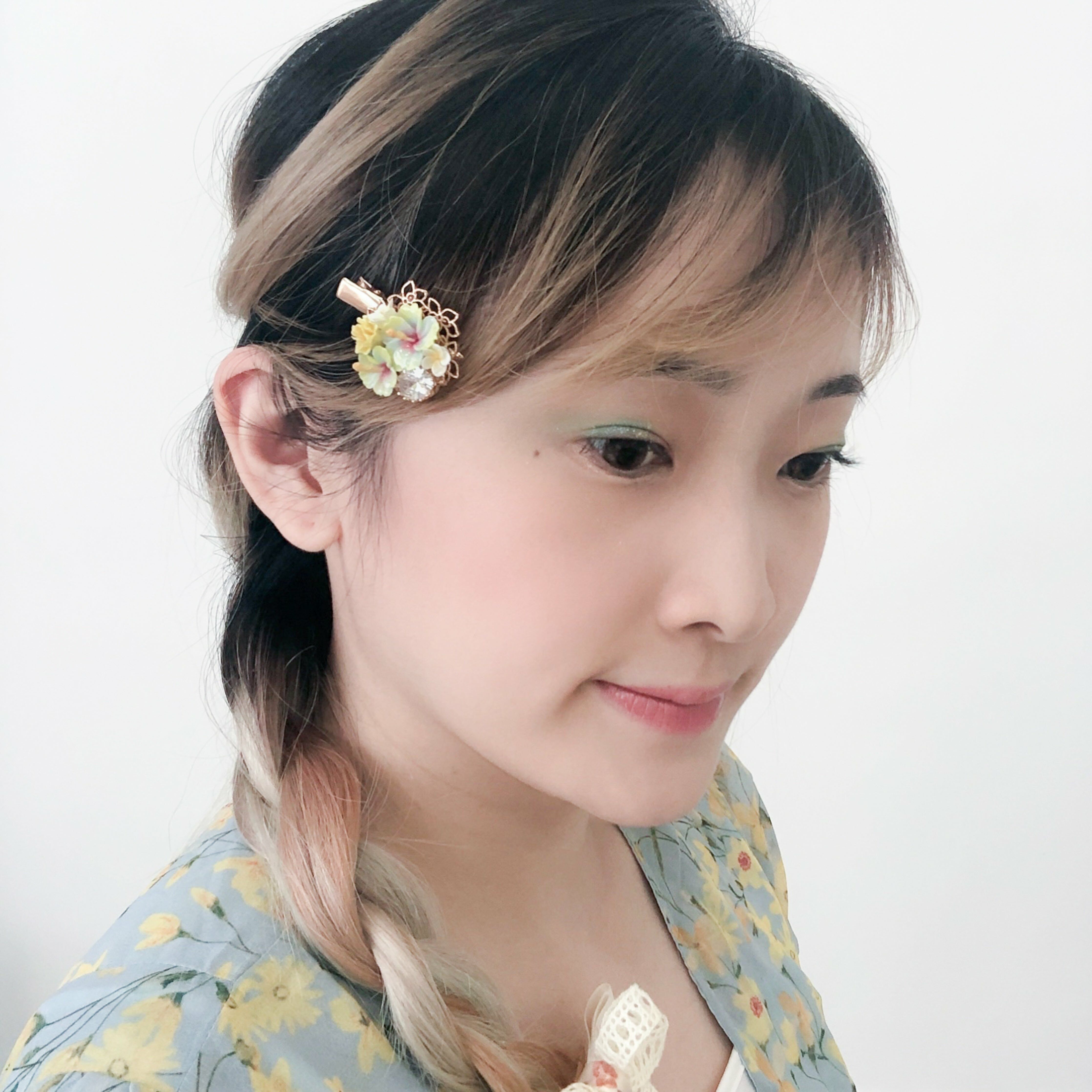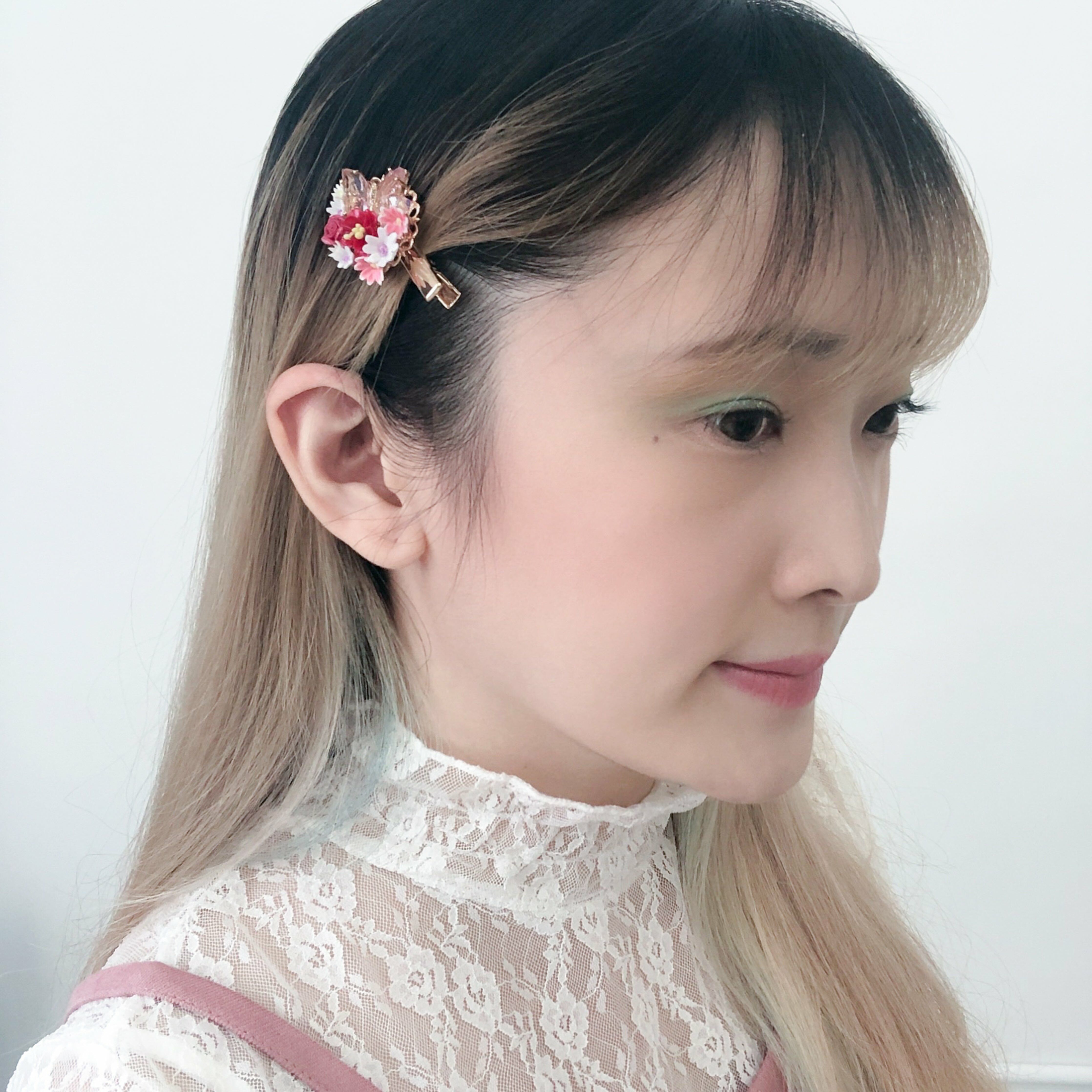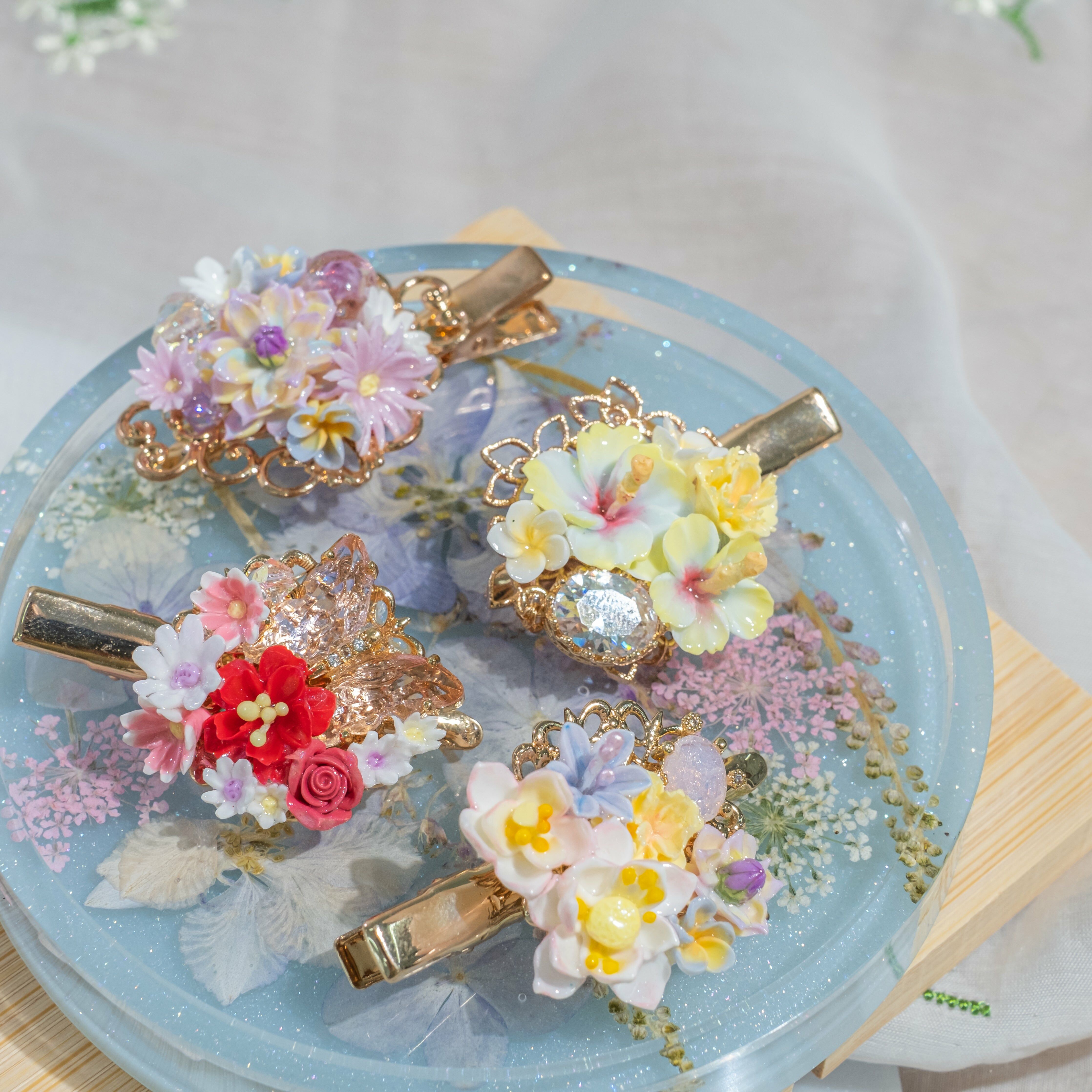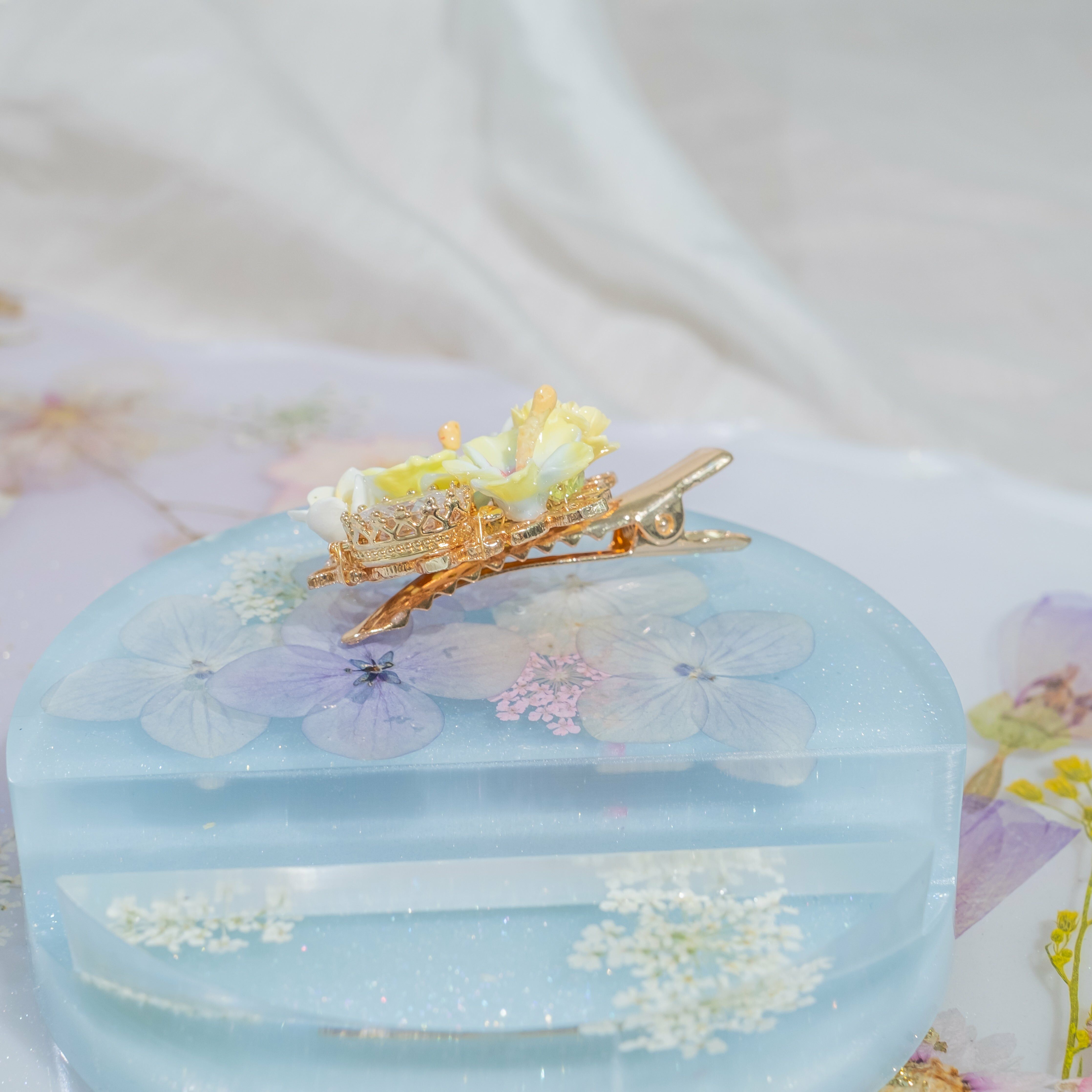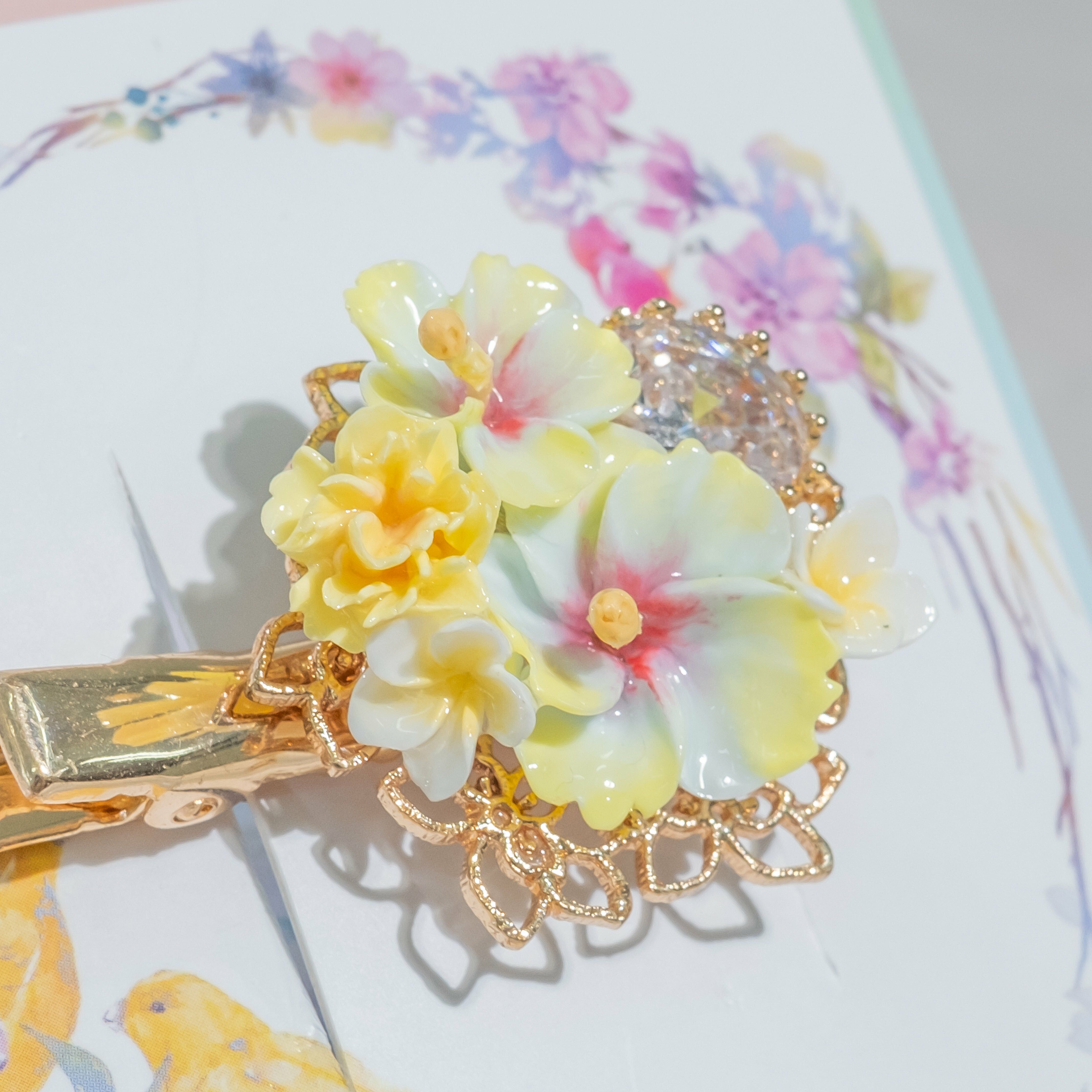 鍍金線 | 施華洛世奇水晶 | 手製樹脂黏土花 | UV膠強化保護層 | 金屬髮夾