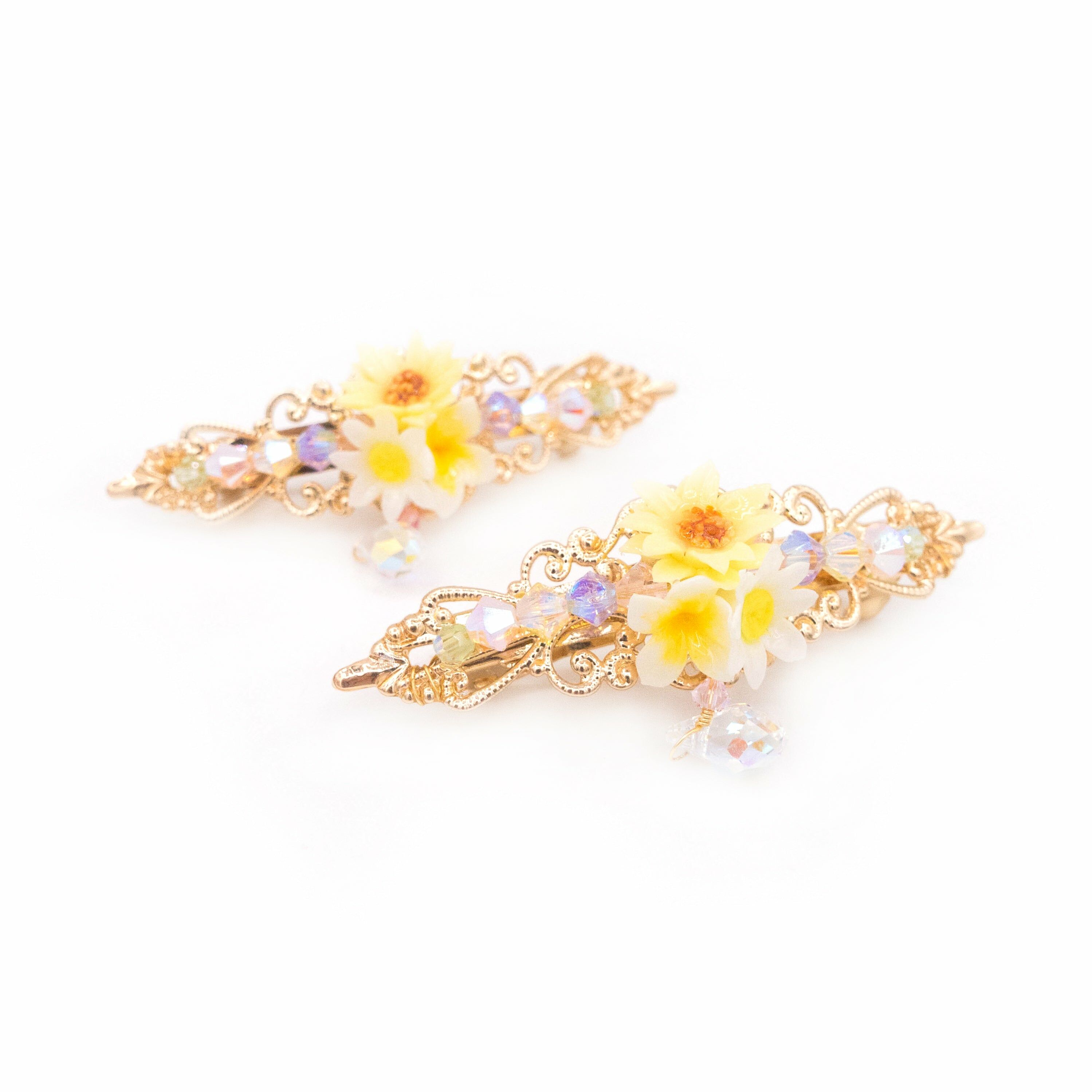 美國進口Beadsmith純銀線 | 奧地利水晶 | 日本鋯石 | 手製樹脂黏土花 | UV膠強化保護層 | 銅鍍金髮夾
