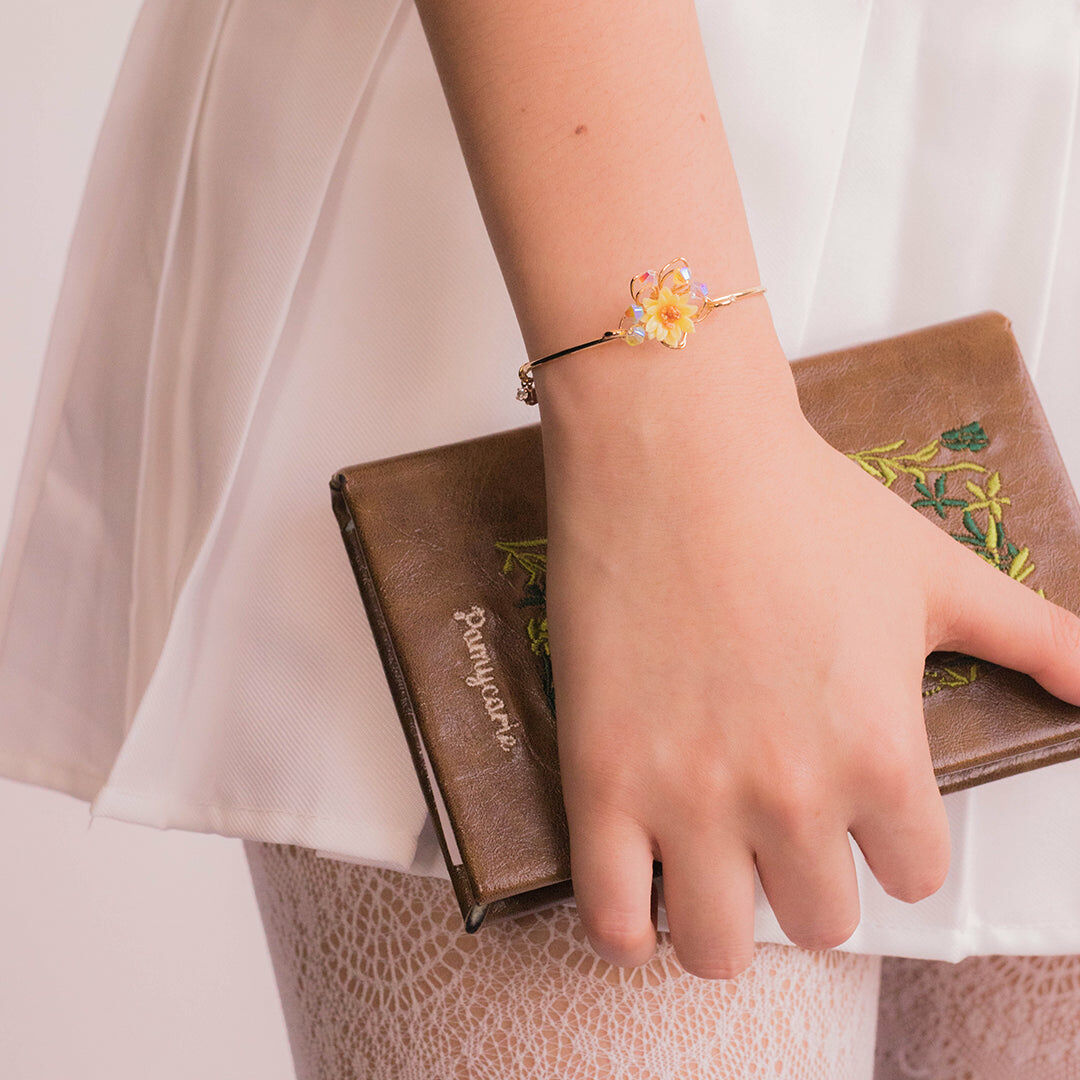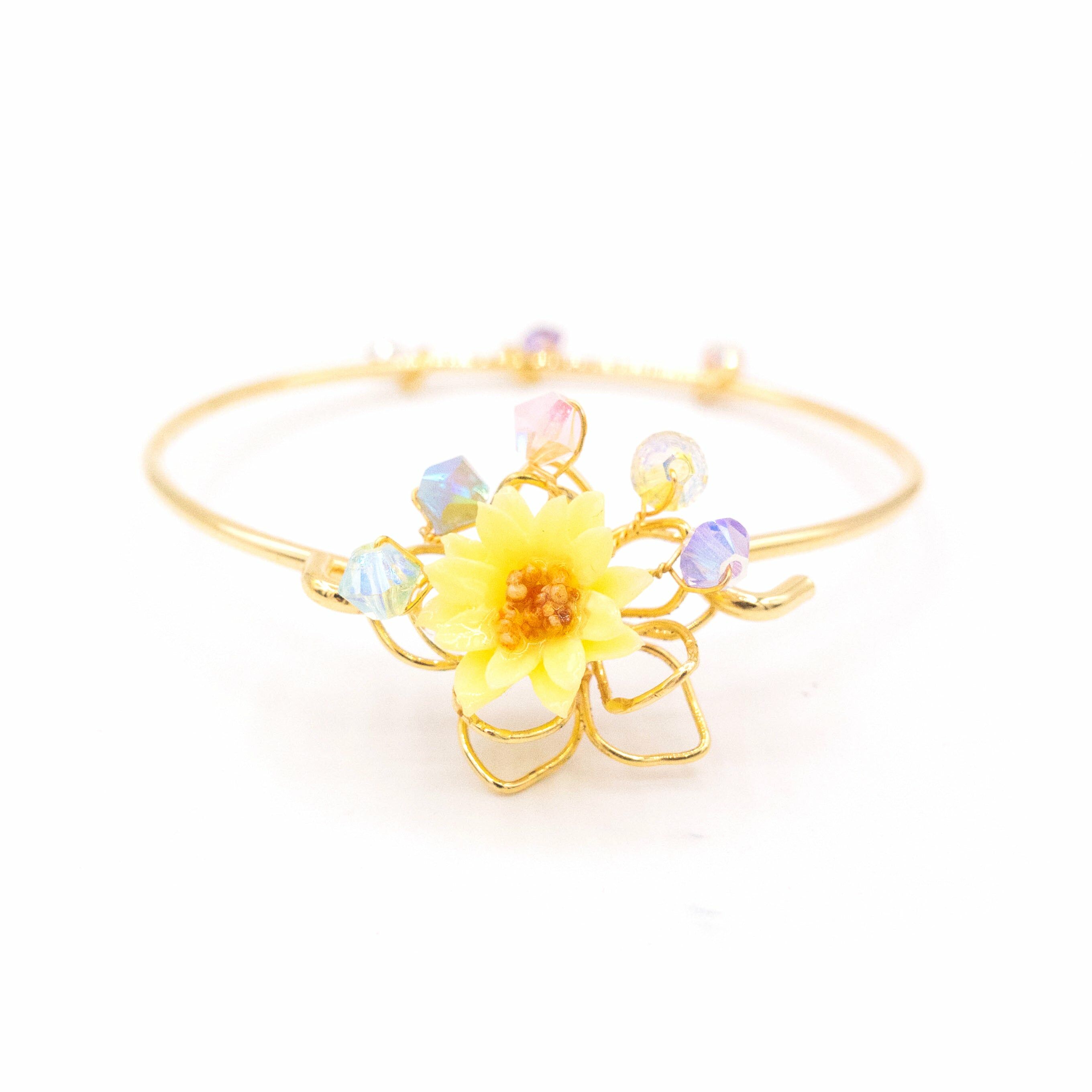 美國進口Beadsmith純銀線 | 奧地利水晶 | 手製樹脂黏土花 | UV膠強化保護層 | 銅鍍14K金手鐲