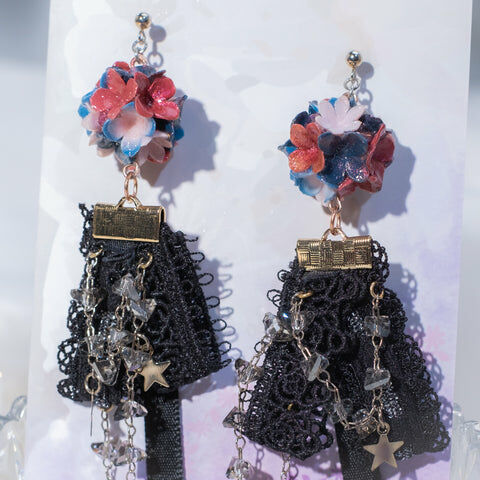 鍍金線 | 施華洛世奇水晶 | 手製樹脂黏土花 | UV膠強化保護層 | 鍍金925純銀耳釘