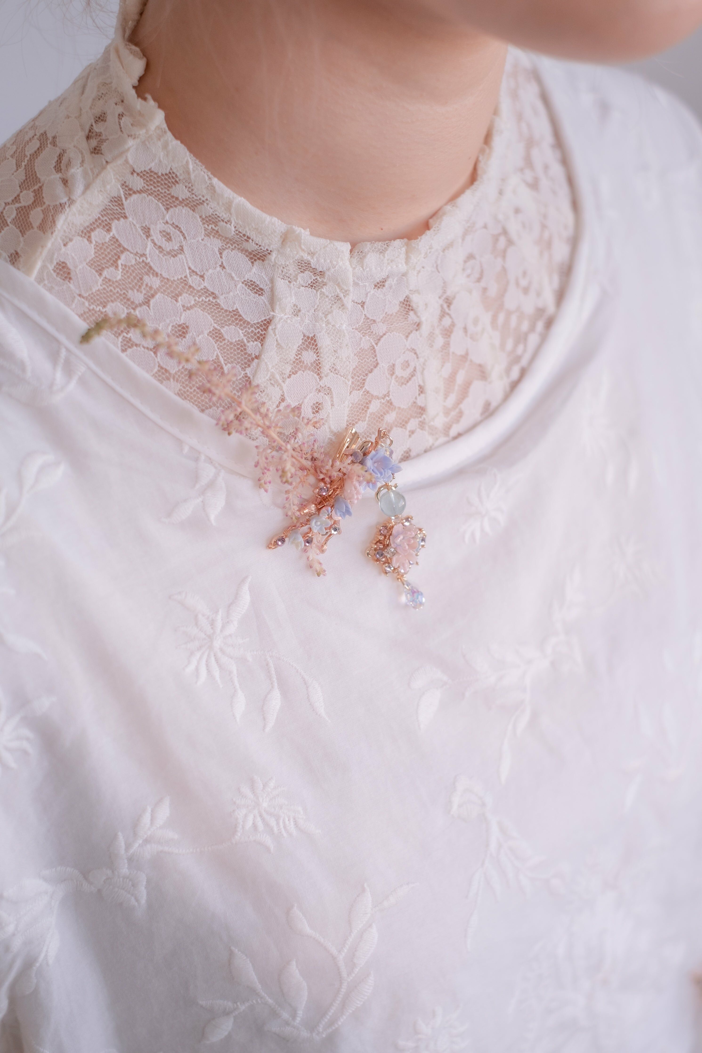 美國進口Beadsmith銀線 | 施華洛世奇水晶 | 手製樹脂黏土花| UV強化保護層 | 金屬領口夾 | 粉紅雲母 & 粉晶 & 海藍寶