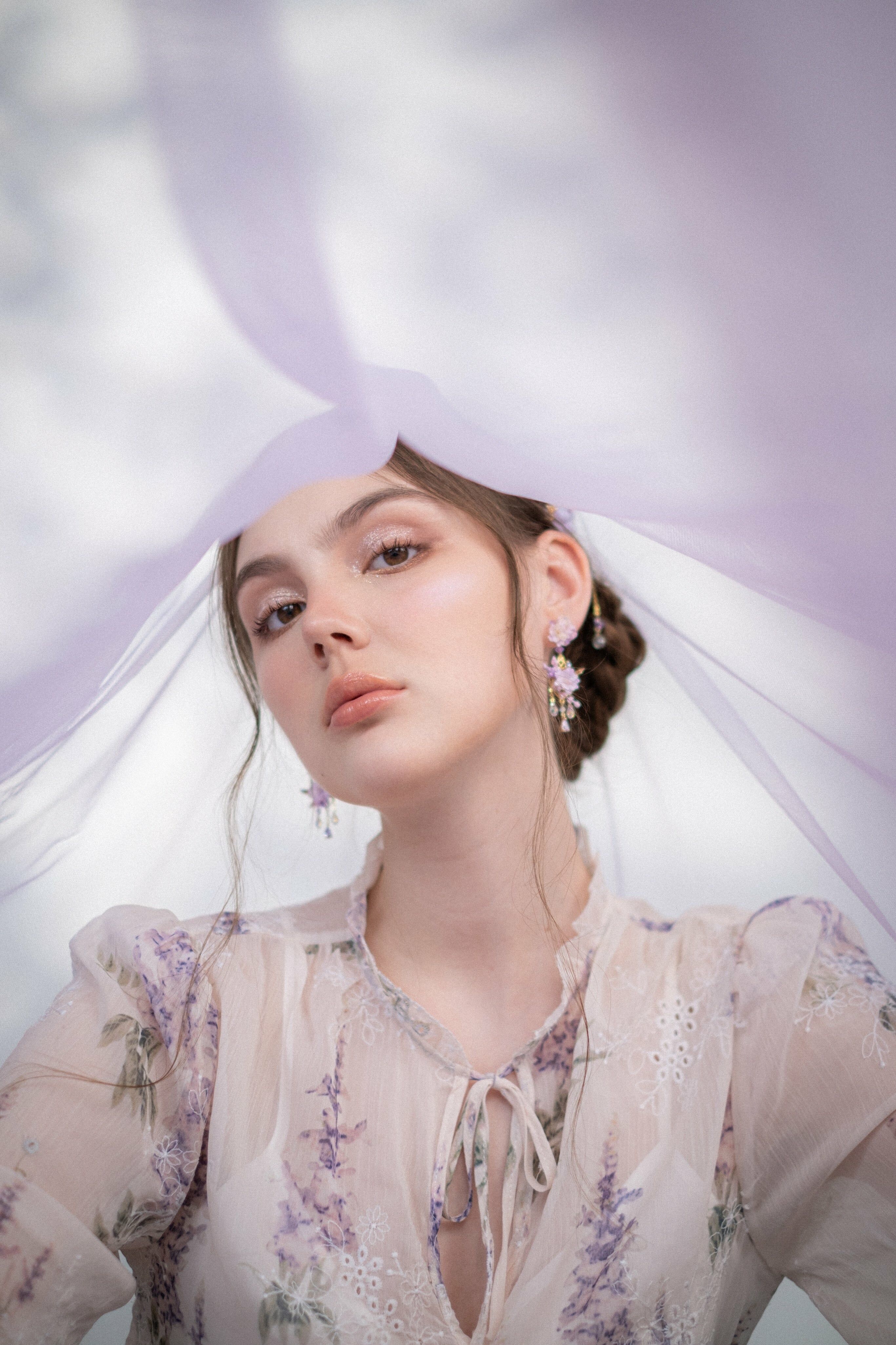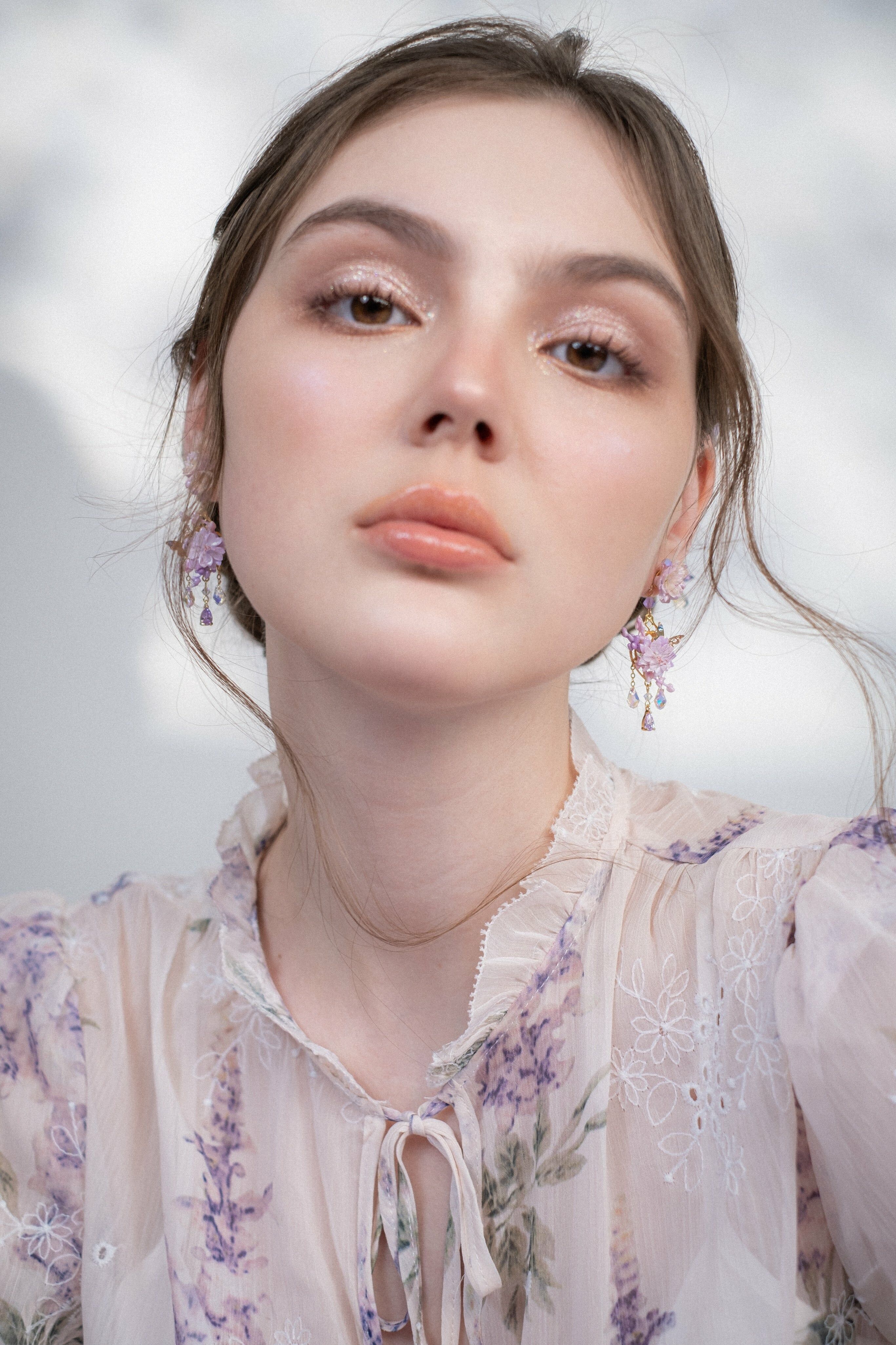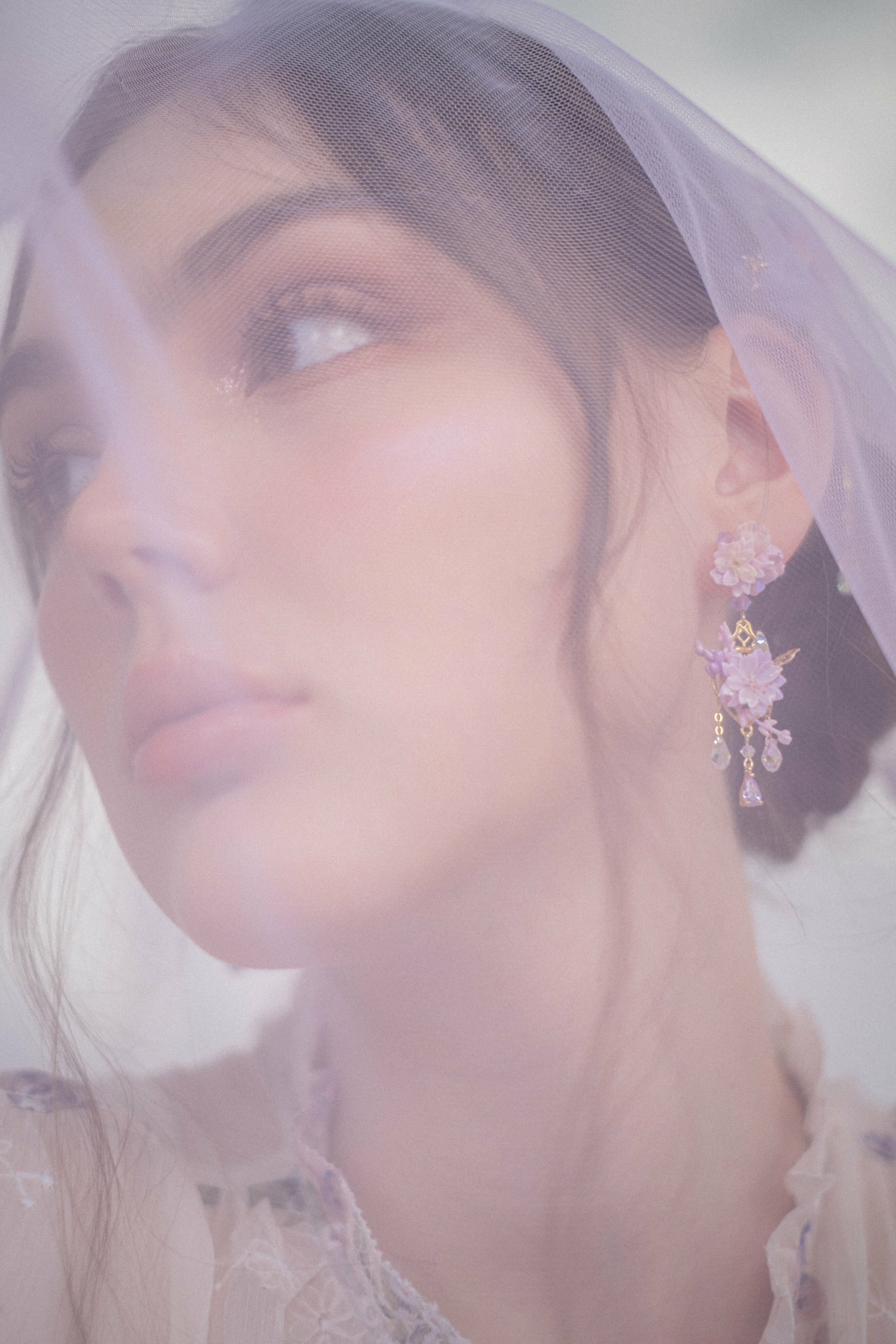 立體設計讓這款輕復古的水晶燈耳環增加了可觀性,從不同角度欣賞耳環會有不一樣的美。薰衣草和櫻花突顯了耳環的貴族感,搭上具復古感的迷你水晶,今個春天不妨做個古典少女吧。