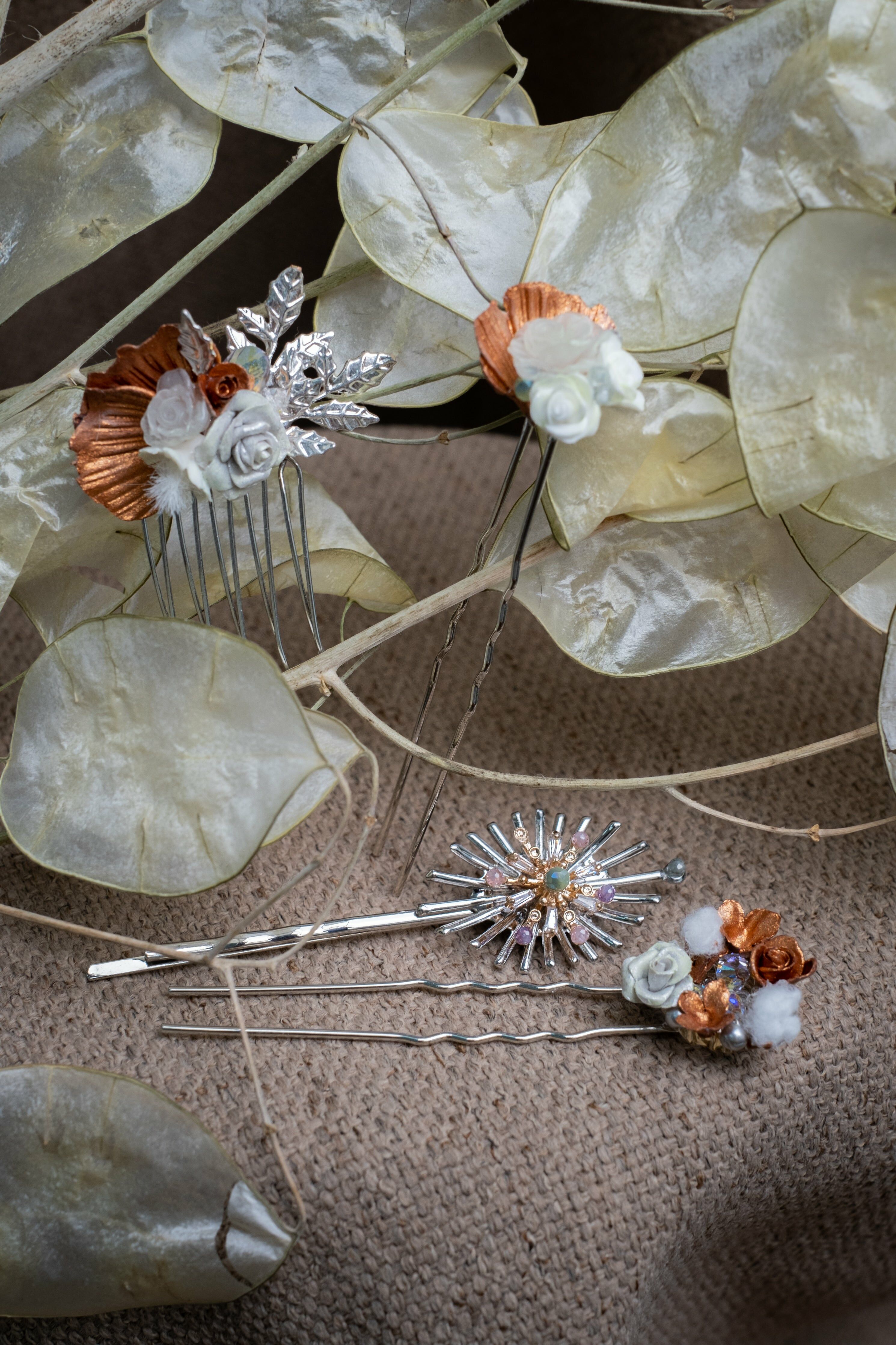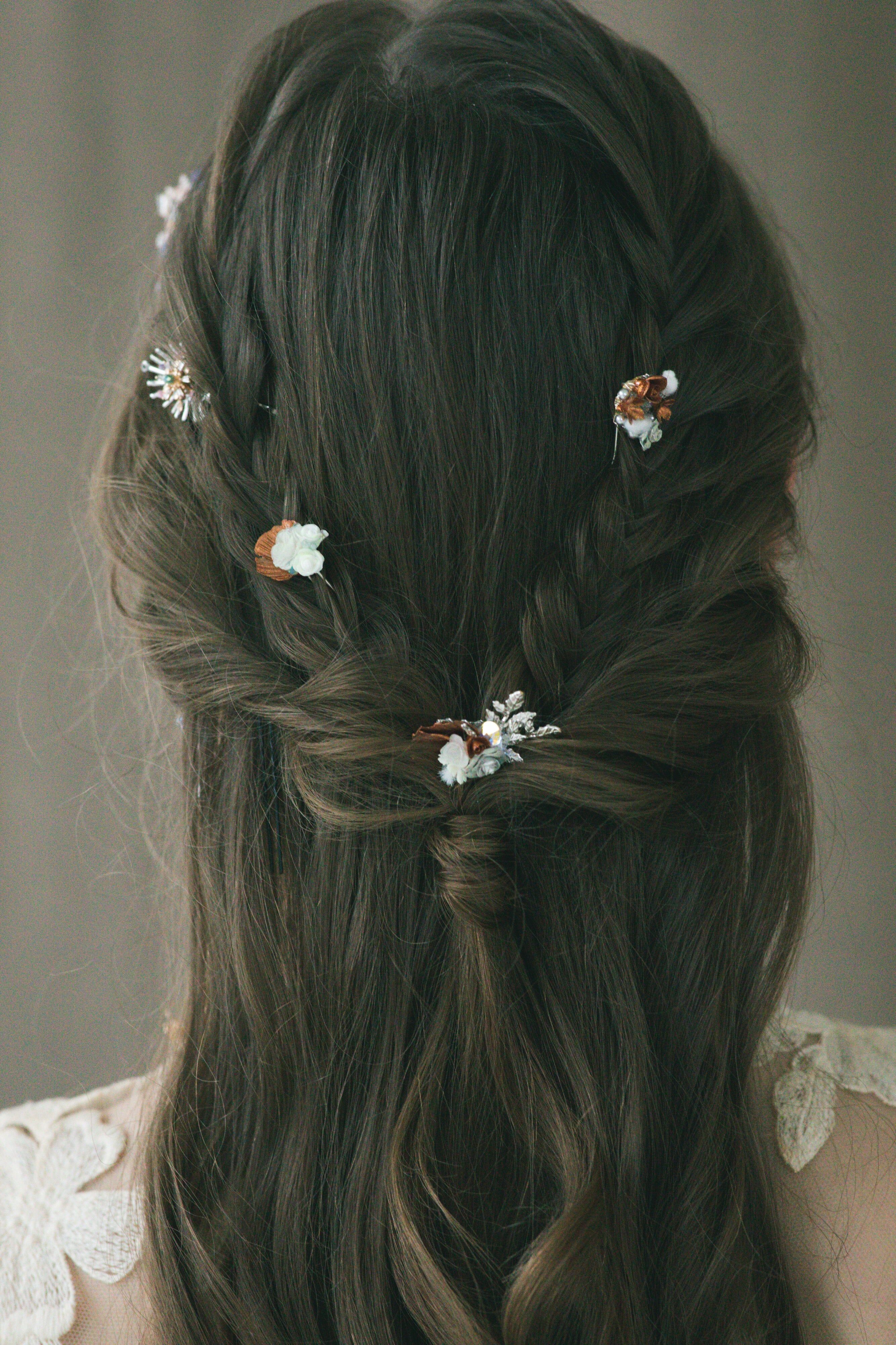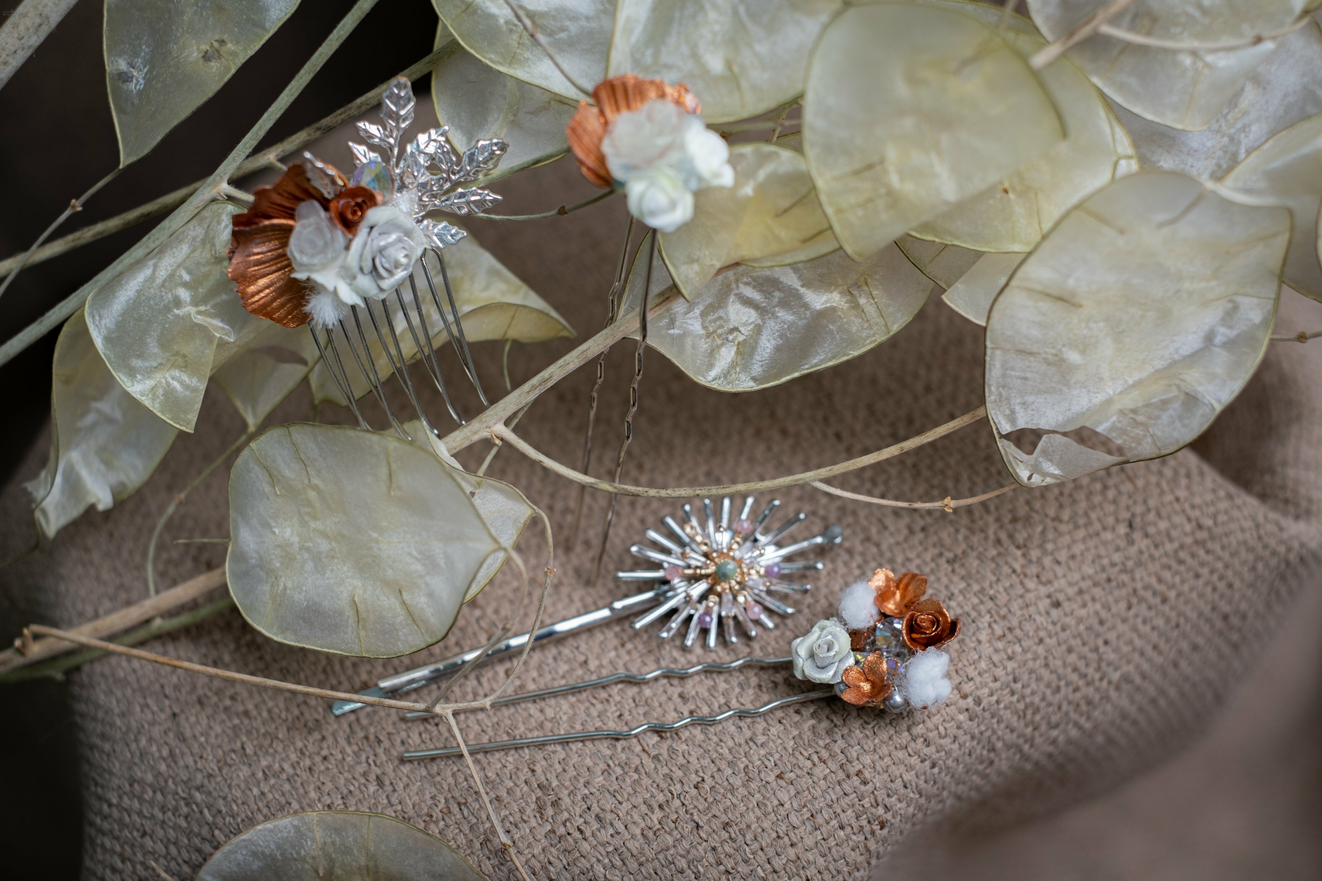 Silver-plated Metal Hair Pin | Swarovski Crystal | Handcrafted Cold Porcelain Flower | Hardening Resin Coating