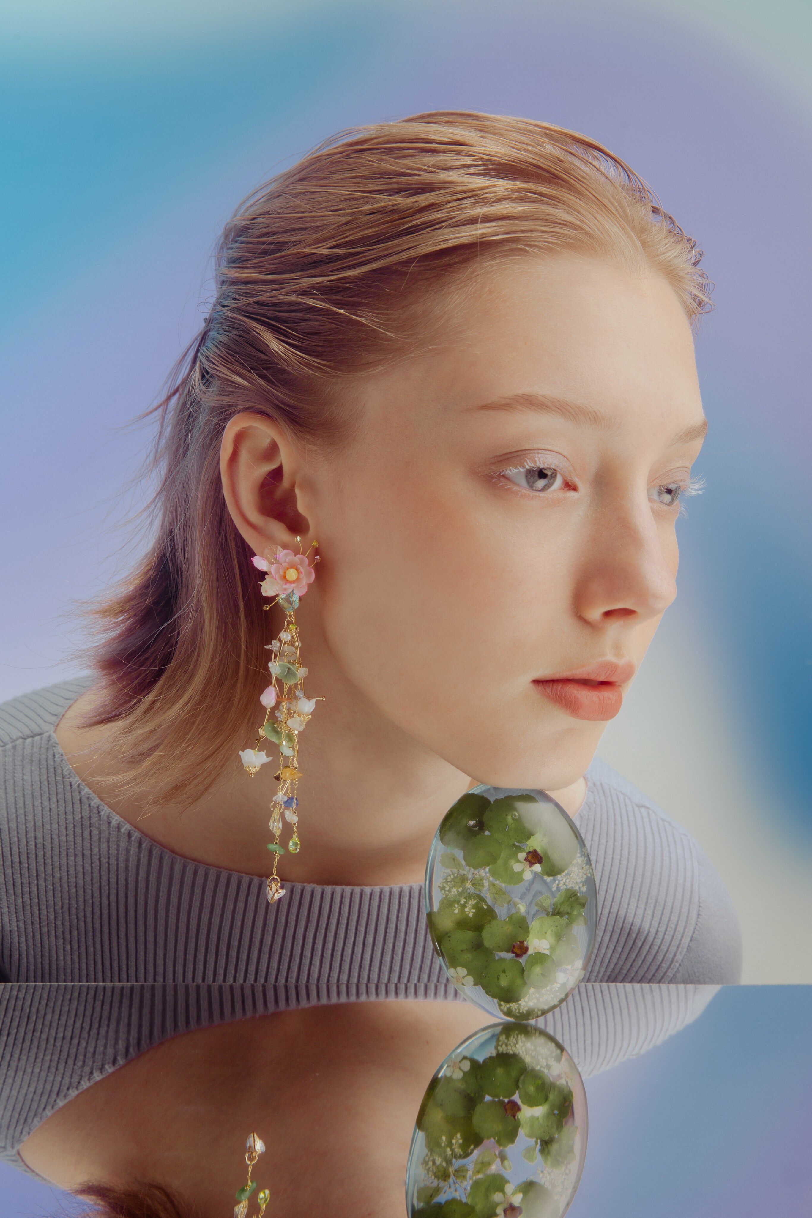 耳環 X 耳勾的新鮮配搭。靈感啟發自荷塘水底及水面的景象,配戴後兩邊耳飾呈現完全不一樣的景象。工藝師以金絲配件模彷出水生荷花的一縷縷根,凸顯荷花的滿滿的生命力。當夏日女生們因炎熱氣溫需要束髮時,耳朵兩旁容易顯得有點落寞,在這類較多細節及配件的耳飾正好填補了這點空隙,當放下頭髮時輕盈飾鏈滲入秀髮又是另一番風味。