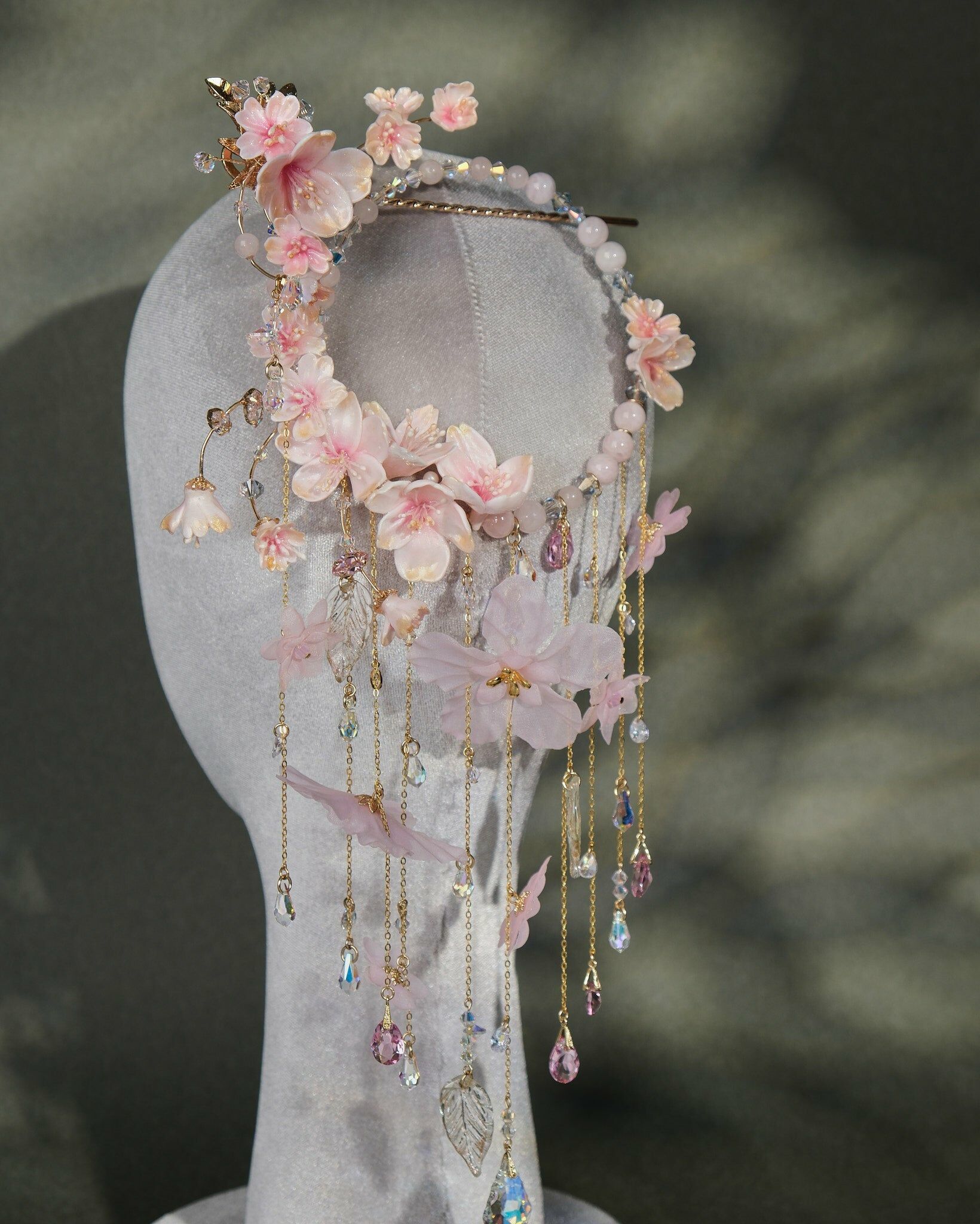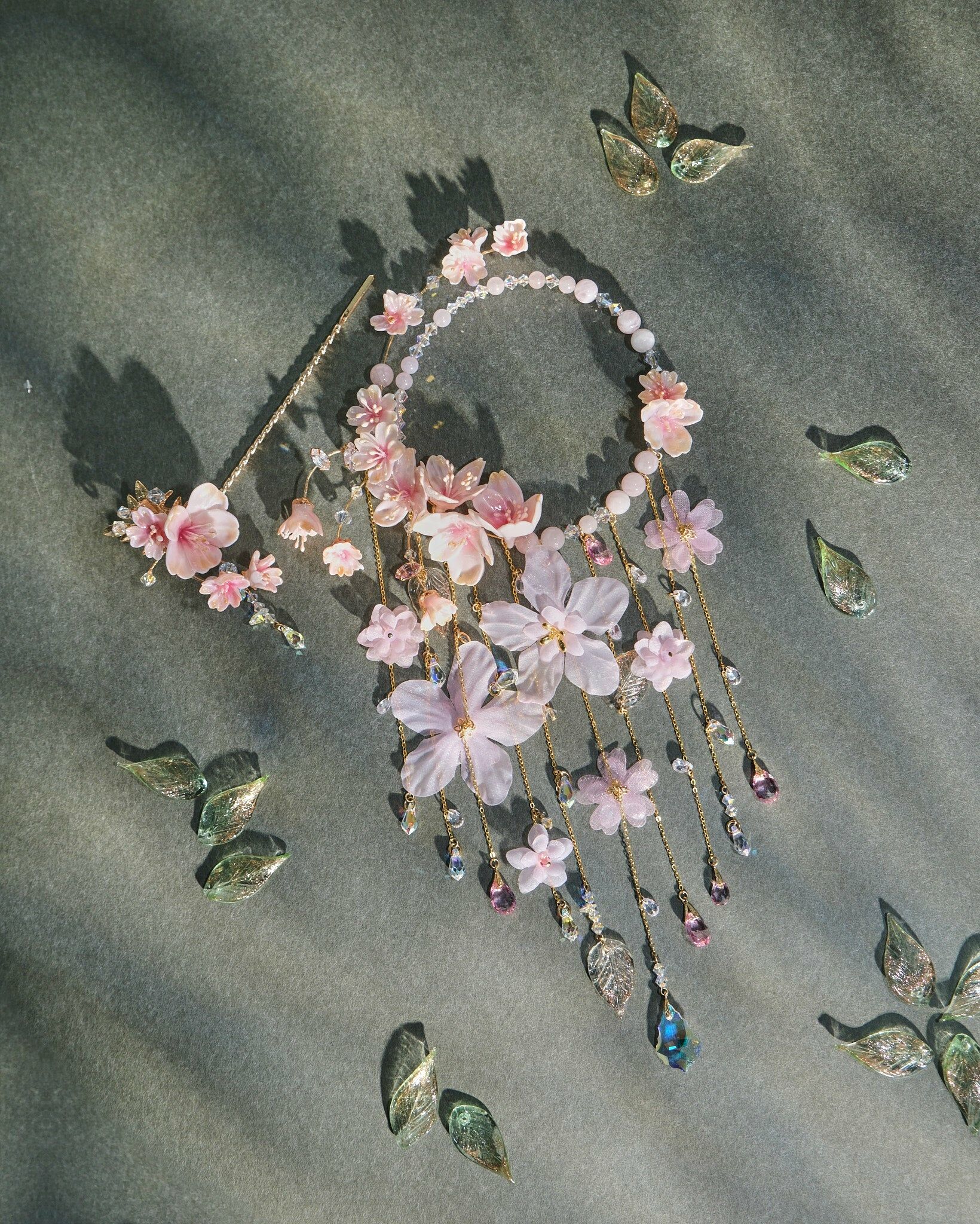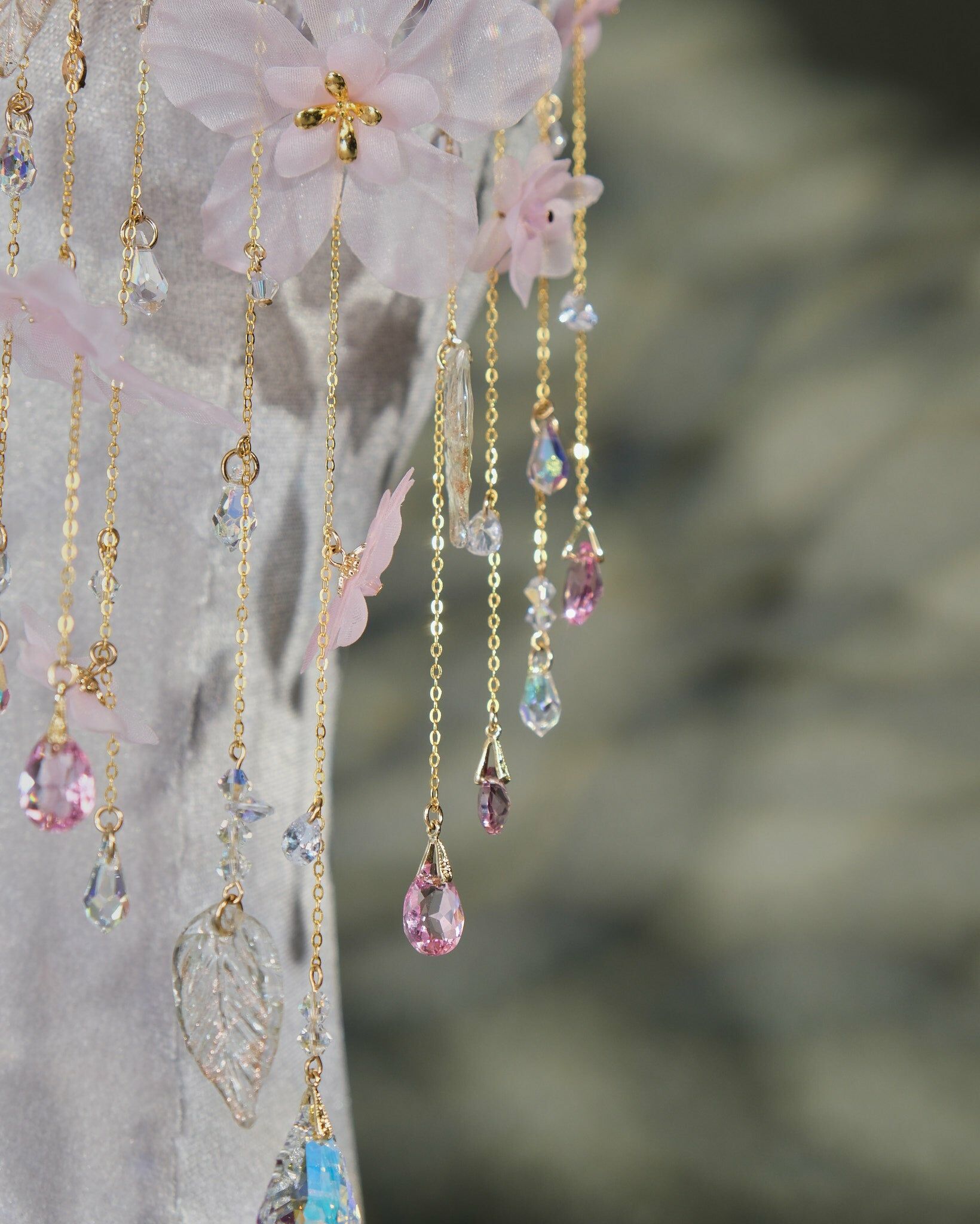 作品分為髮帶及水滴垂簾兩部份,可獨立購買。水滴垂鏈與布花交織出層層遞進的櫻花瀑布,彷彿置身於如詩如畫的櫻花世界中。這件作品絕對能夠讓你成為當下最閃耀的存在。