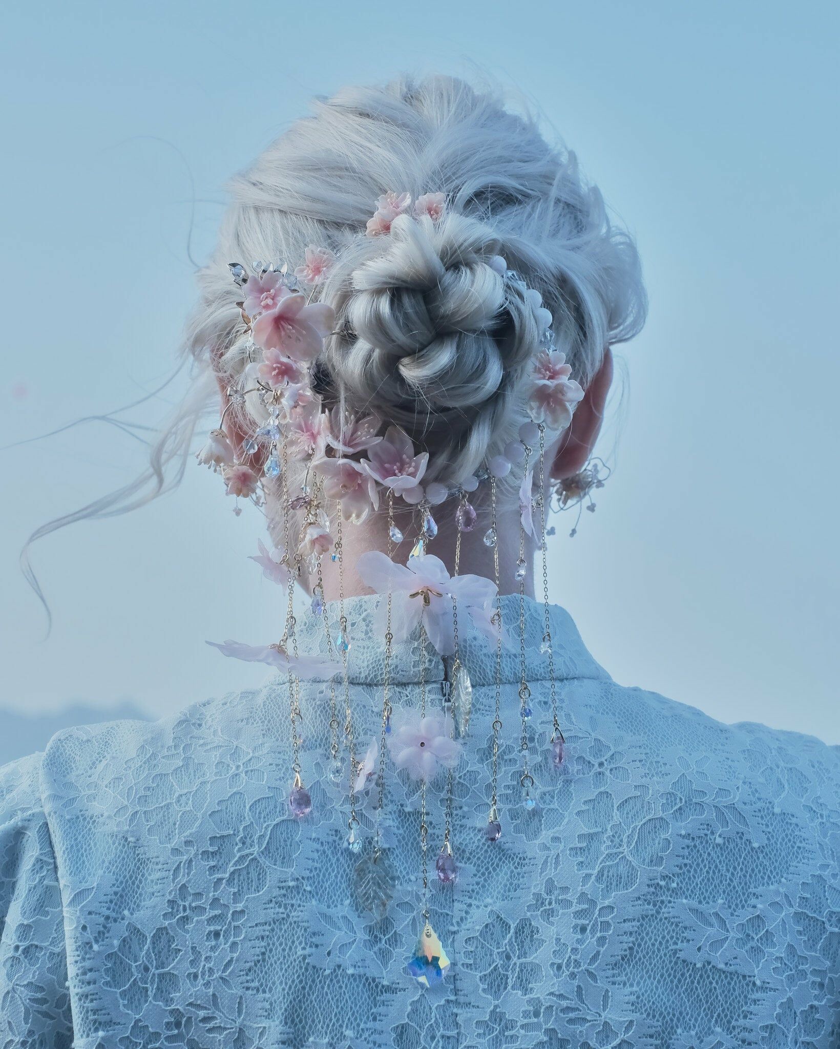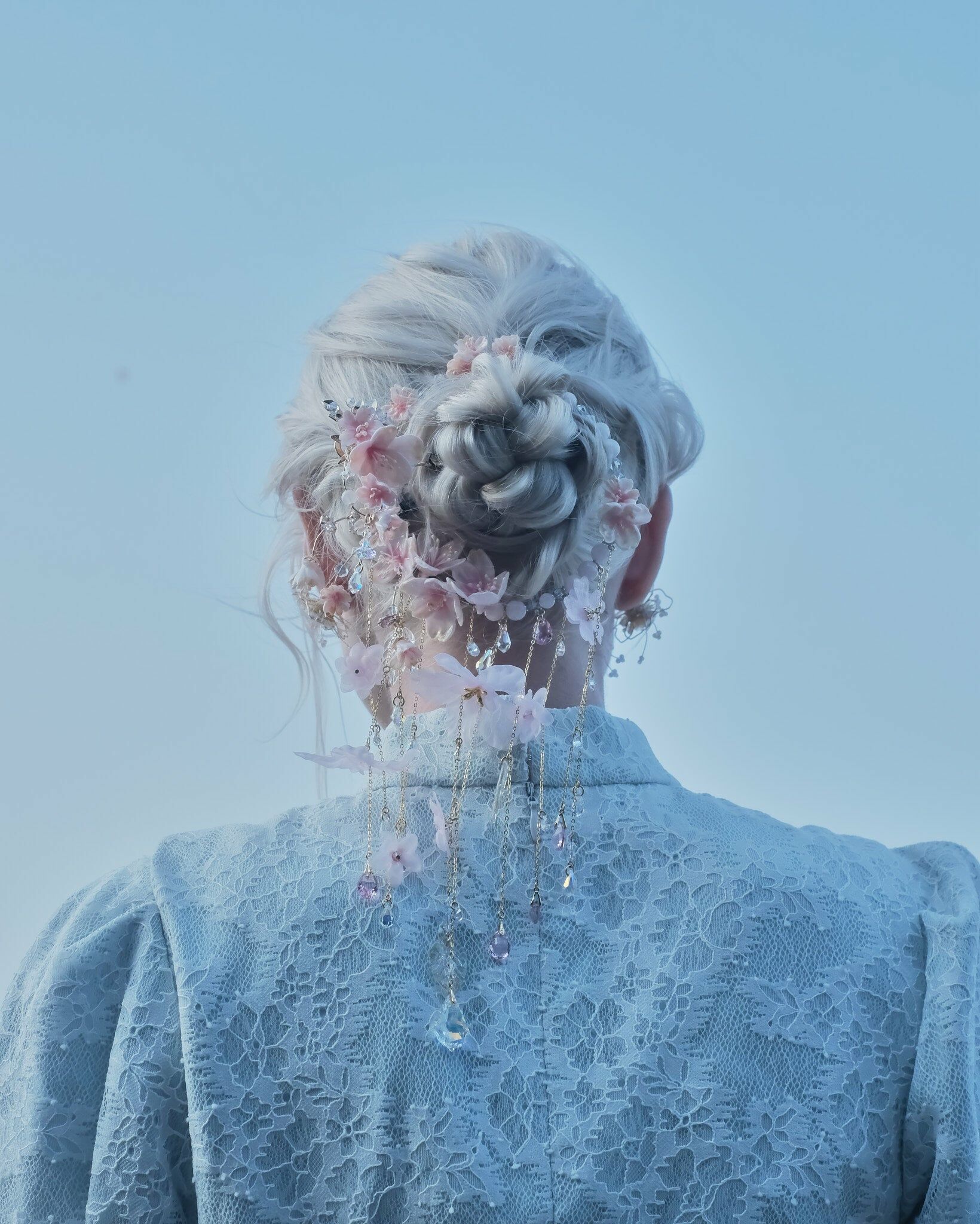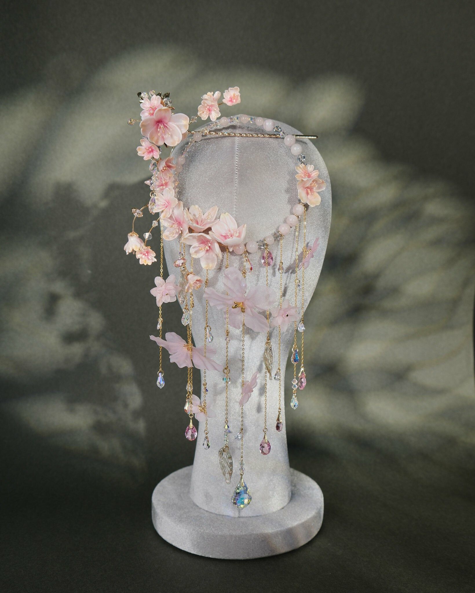 作品分為髮帶及水滴垂簾兩部份,可獨立購買。水滴垂鏈與布花交織出層層遞進的櫻花瀑布,彷彿置身於如詩如畫的櫻花世界中。這件作品絕對能夠讓你成為當下最閃耀的存在。