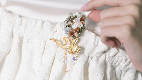 胸針分為花環及蝴蝶結兩部分,可獨立購買,花環胸針同樣結合了乾燥植物和黏土花!薔薇更是採用了金屬色系,古典感覺濃厚。而胸針其實有多種搭法,除了勾在上衣,大衣等等,勾在絲巾/頸巾的效果也是極佳。