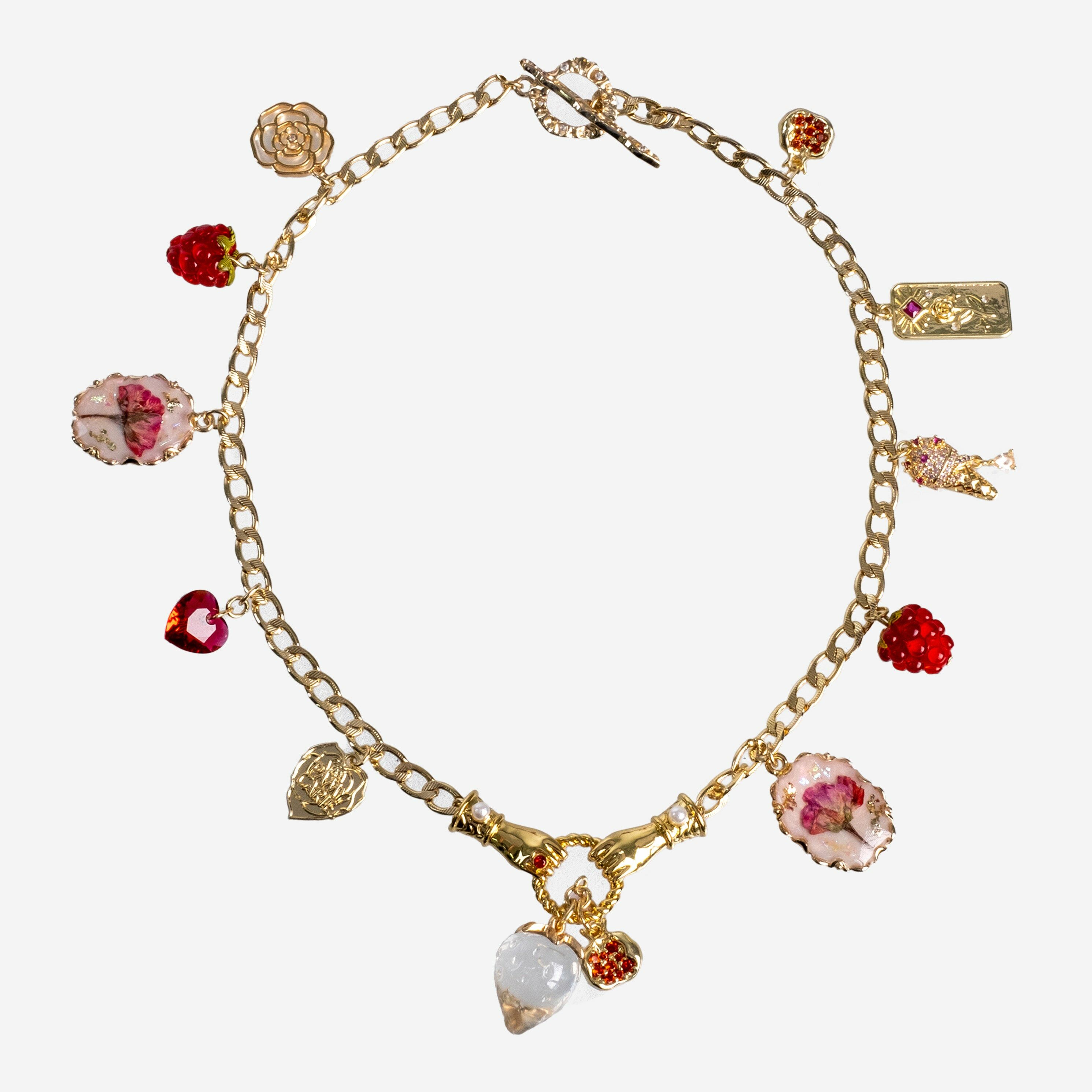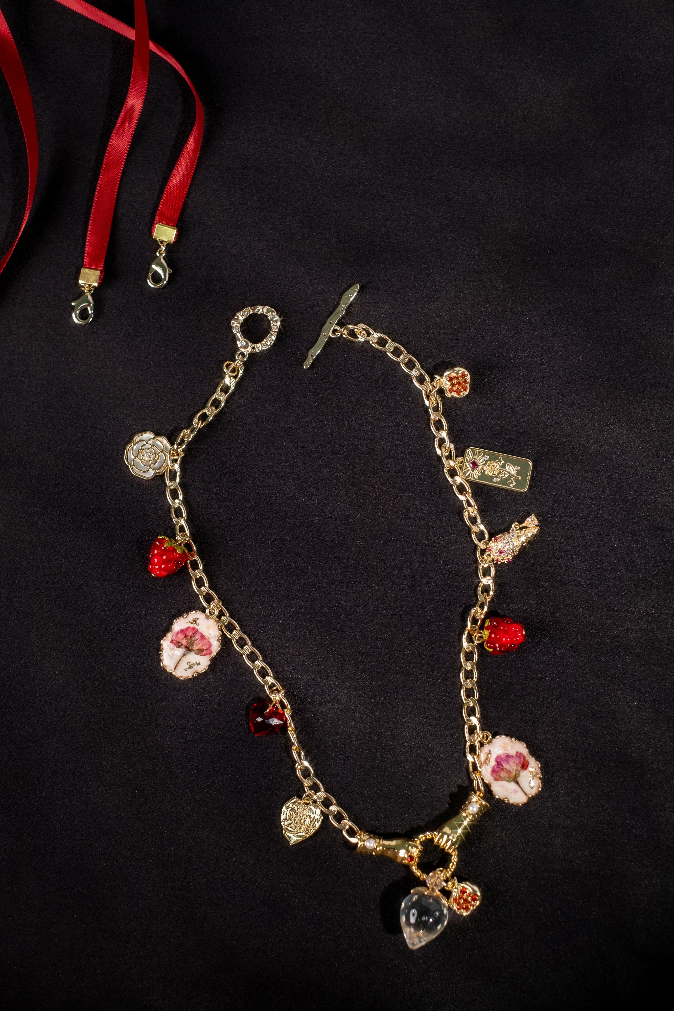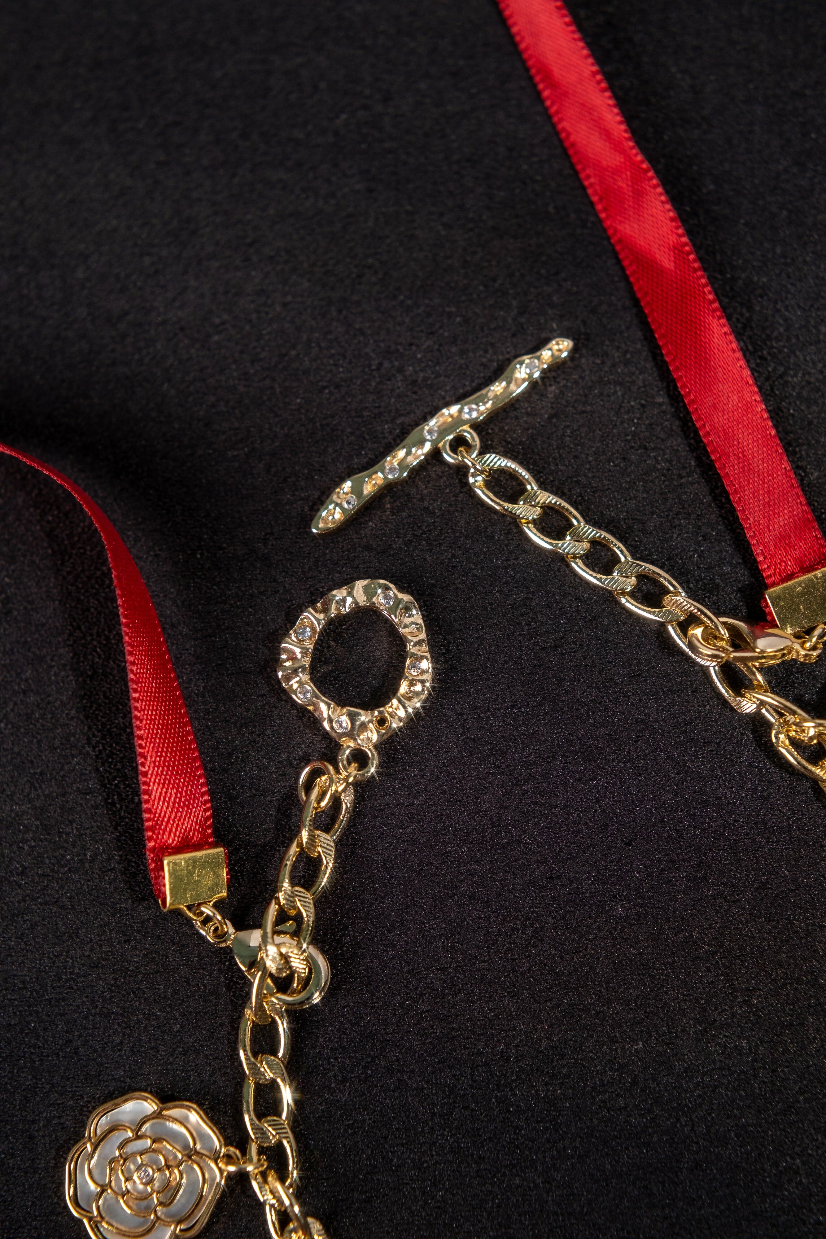 Victorian Afternoon Tea Rosette and Fraise Charms Chain Necklace with Ribbon