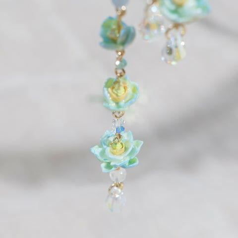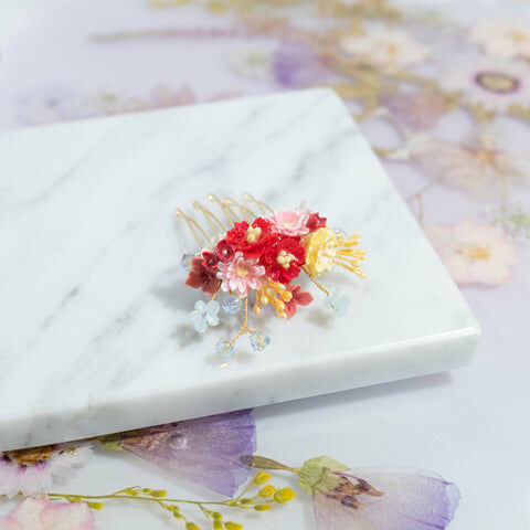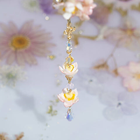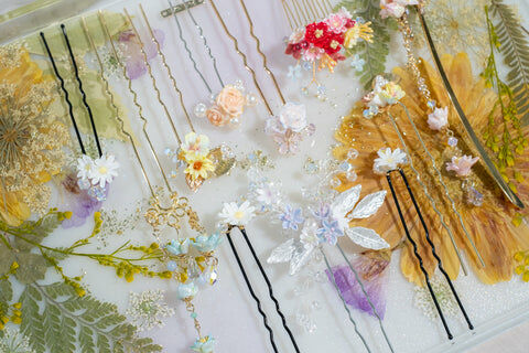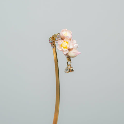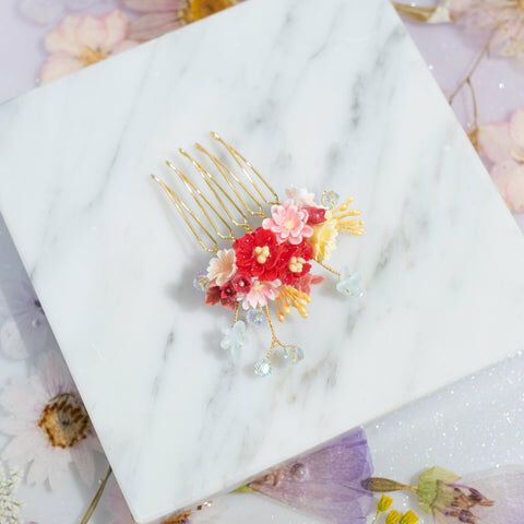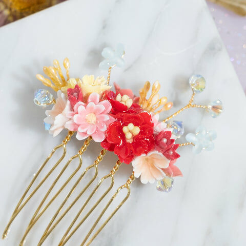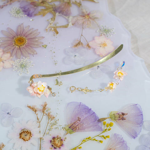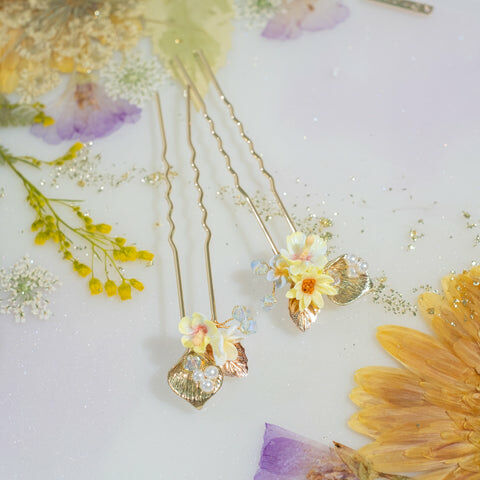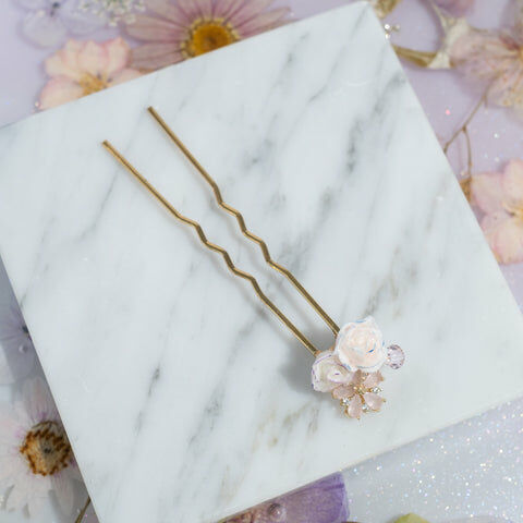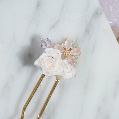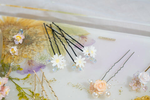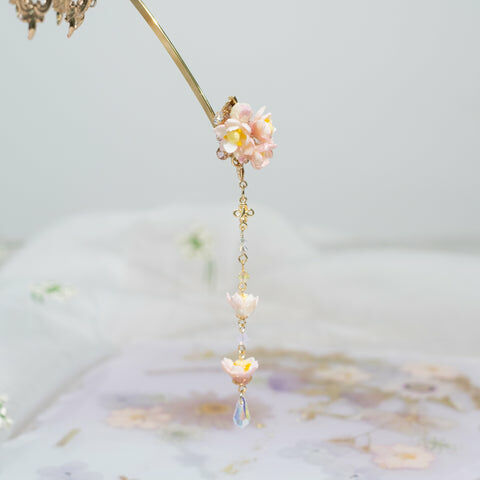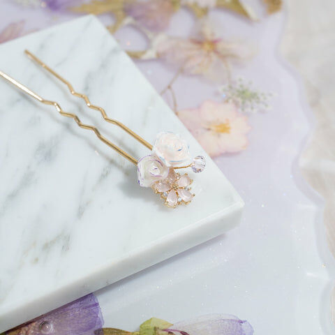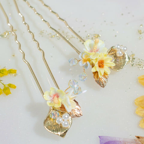 鍍金線 | 施華洛世奇水晶 | 手製樹脂黏土花 | UV膠強化保護層 | 金屬髮簪
