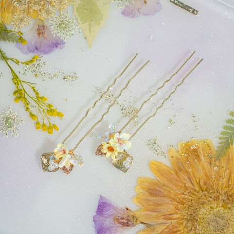 Gold Plated Artistic Wire | Swarovski Crystal Bead | Handcrafted Resin Clay Flower | UV Hardening Coating | Metal Hair Pin