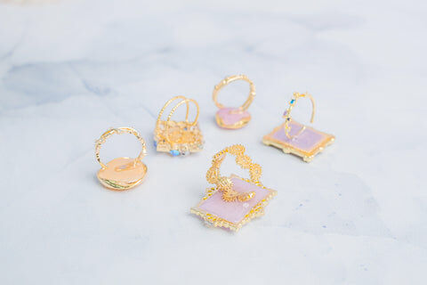 一套五件的戒指套裝,最近相當流行多層次戒指佩戴法,意思是指同一隻手上戴上多隻戒指,由數量堆疊出來的華麗感是其他款式無法取代的,鮮艷的色彩配上金屬小畫框襯托陣陣複古氣息。