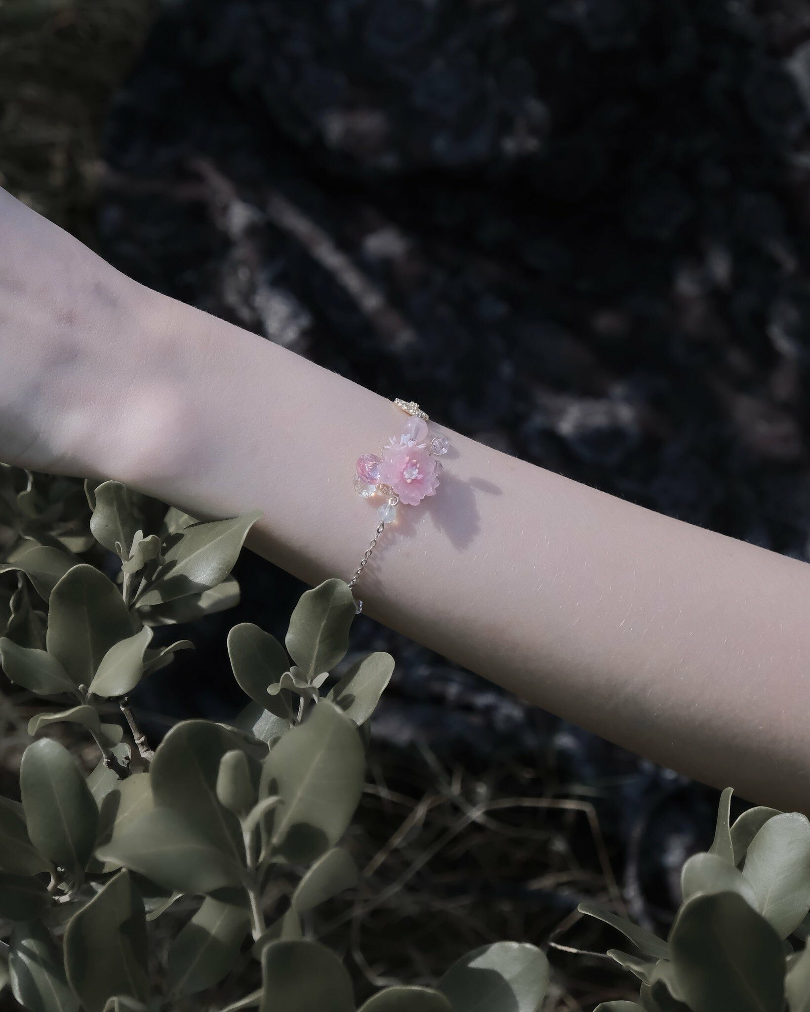 這款細手鏈讓人感覺可愛、乖巧,每顆天然石都非常精緻、配上粉嫩櫻花,戴上後讓人感到溫柔而舒適。