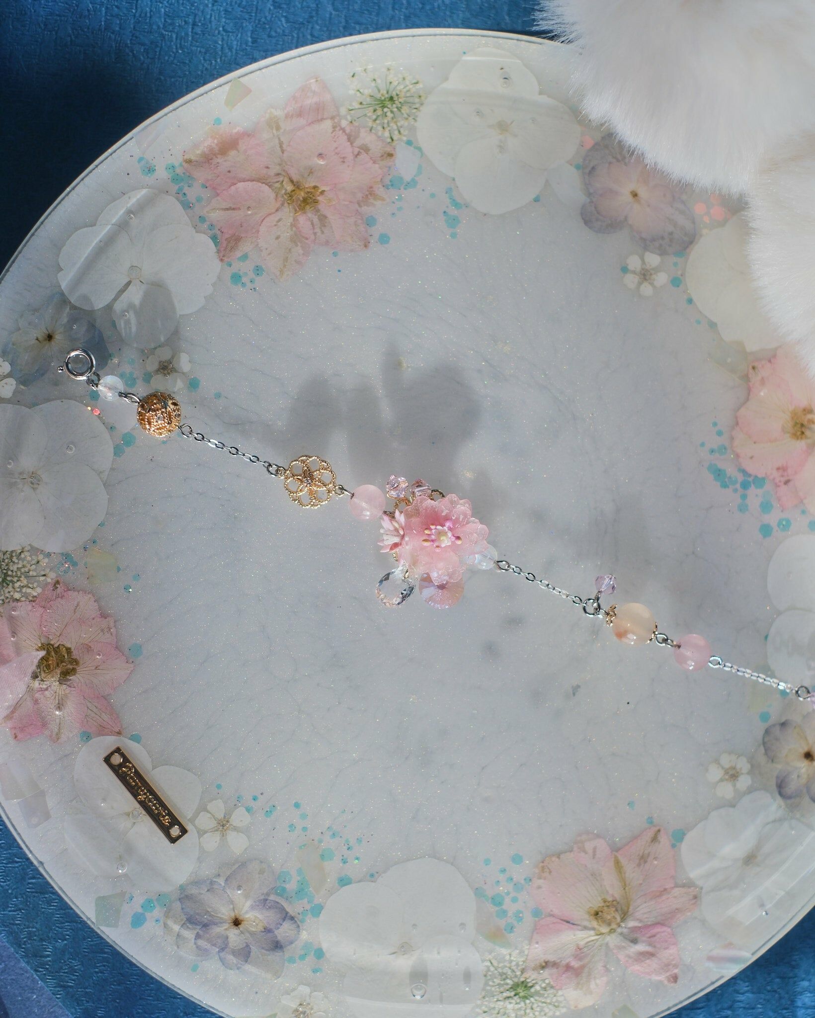 Sliver-plated S925 Bracelet | Resin Clay Flower | Swarovski Crystals | Adjustable Size | Natural Quartz