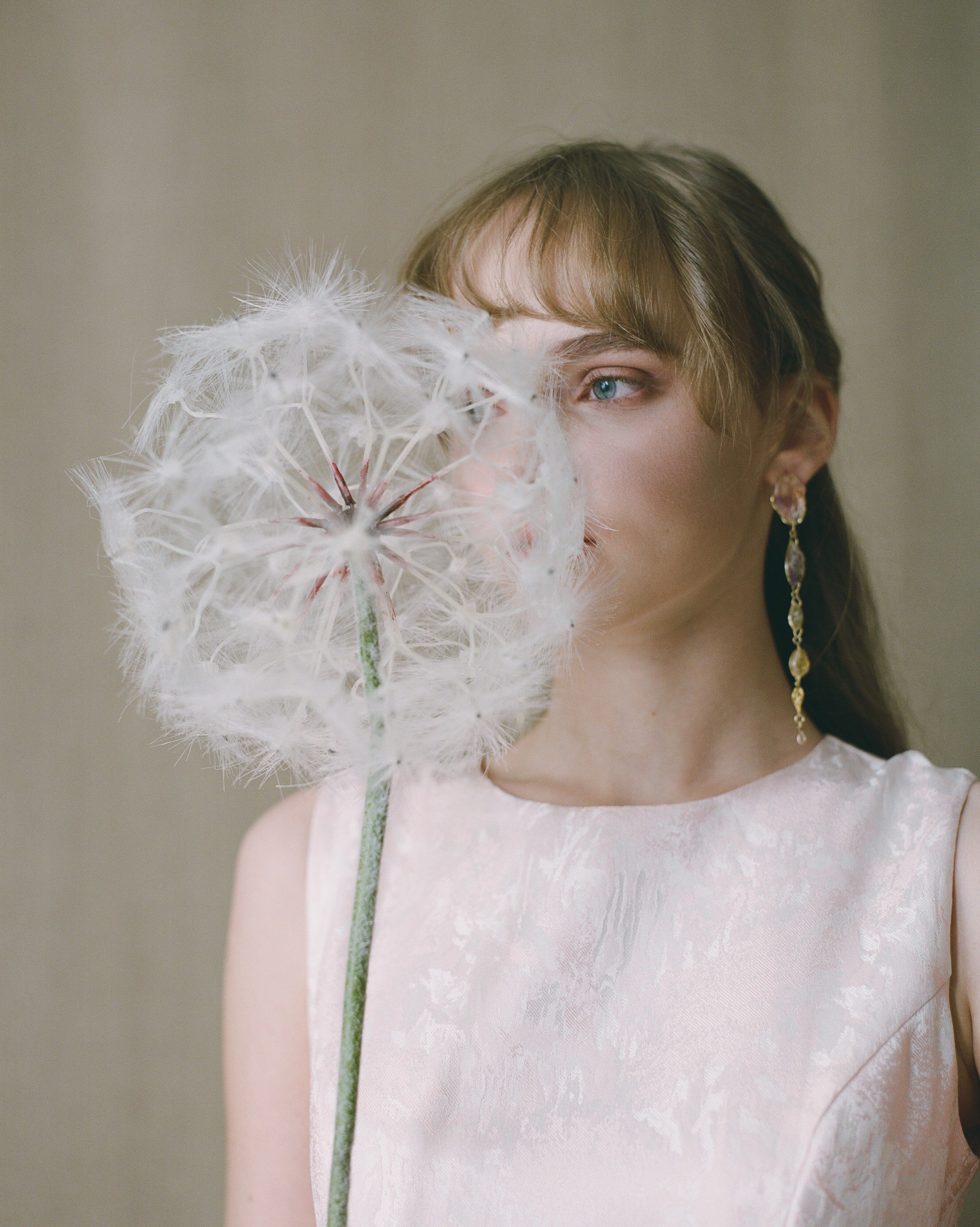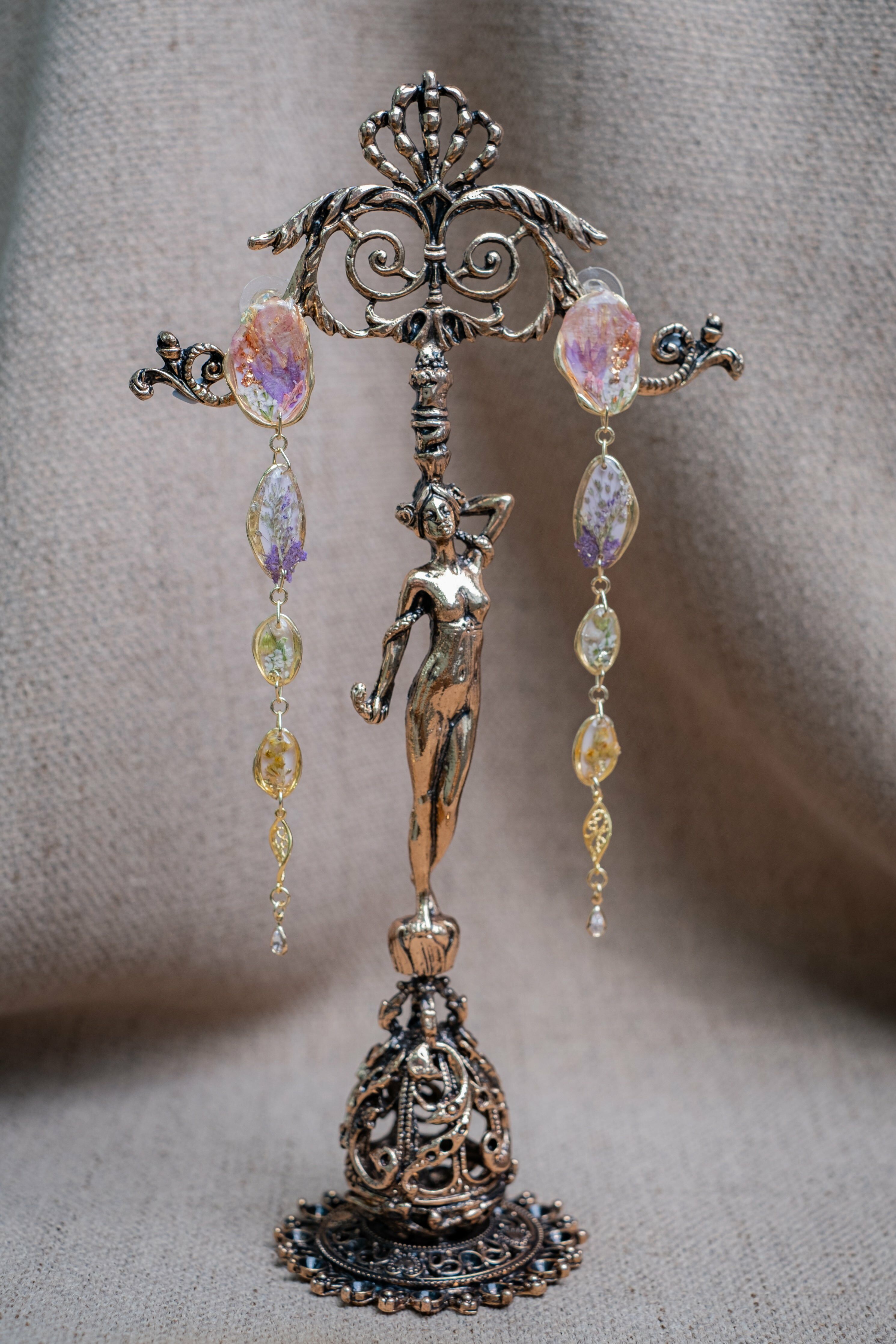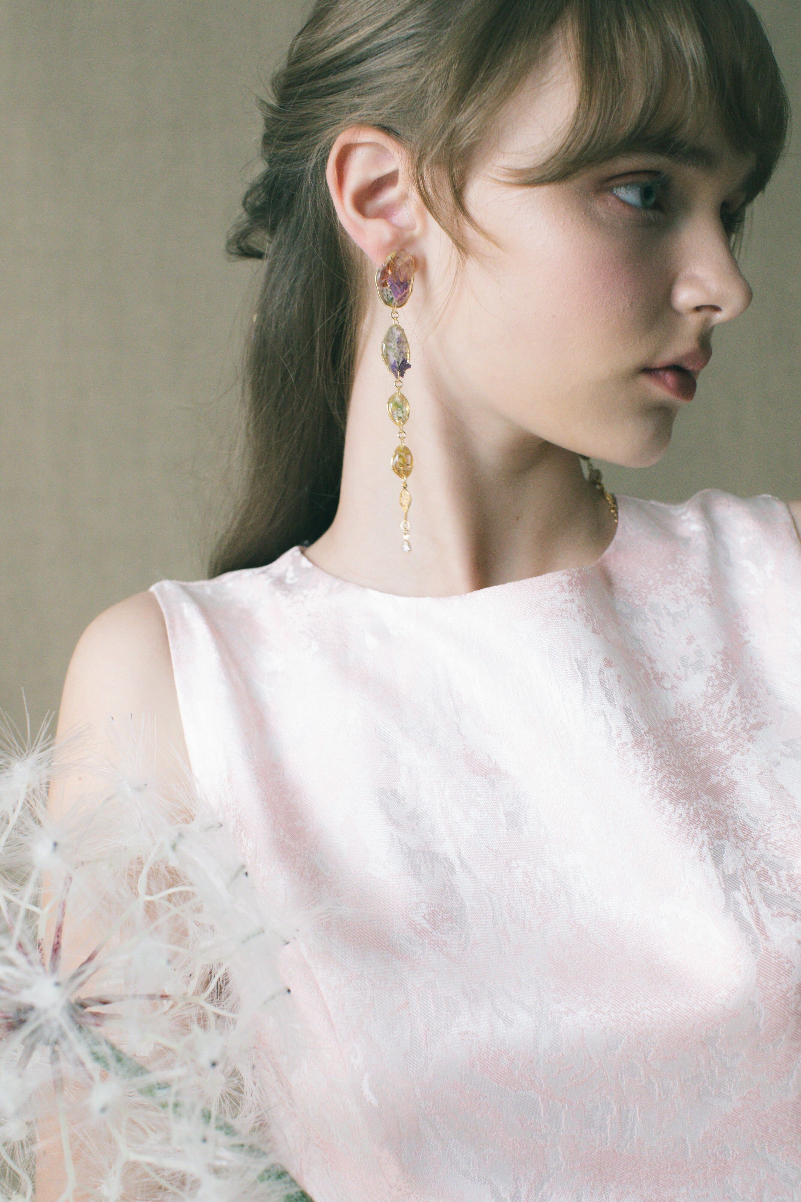當冬露沿冰川滴下,被冰封的小花嶄露頭角,成就了這款日系風格的押花長耳環。