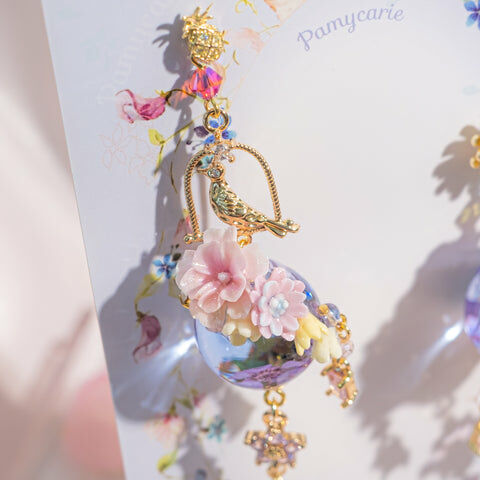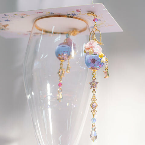 鍍金線 | 施華洛世奇水晶 | 手製樹脂黏土花 | UV膠強化保護層 | 鍍金925純銀耳釘