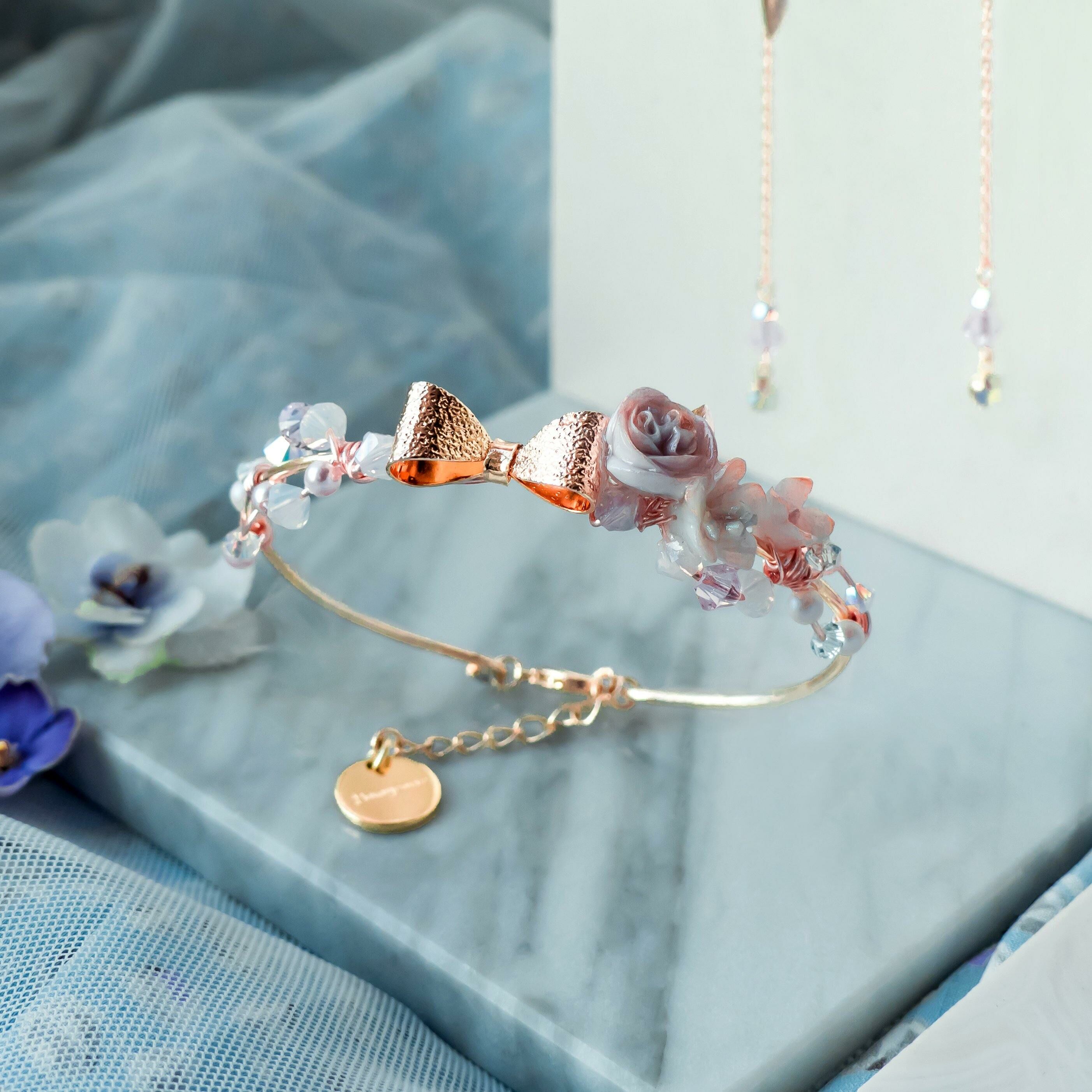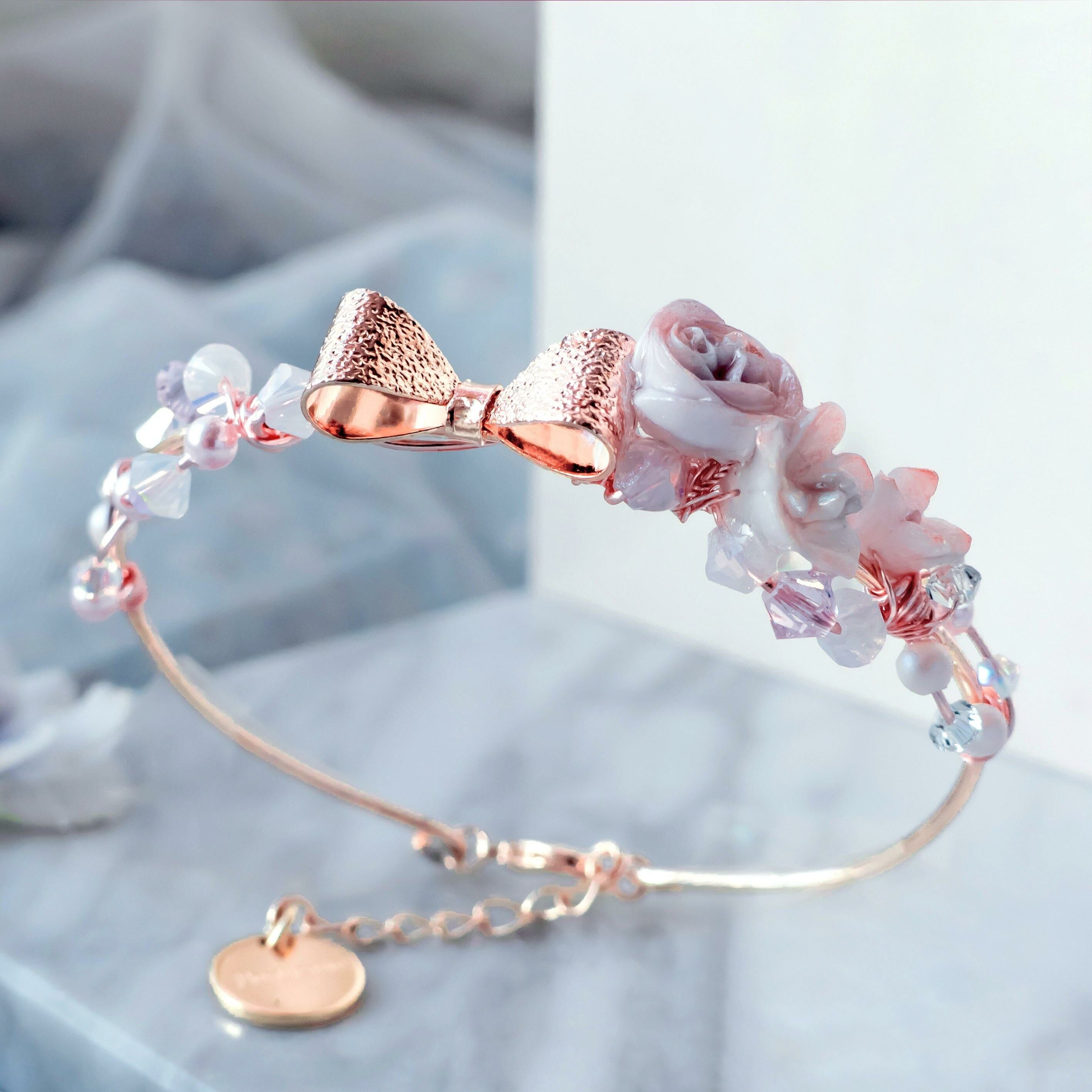 美國進口Beadsmith純銀線 | 奧地利水晶 | 奧地利水晶珍珠 | 手製樹脂黏土花 | UV膠強化保護層 | 銅鍍玫瑰金手鐲