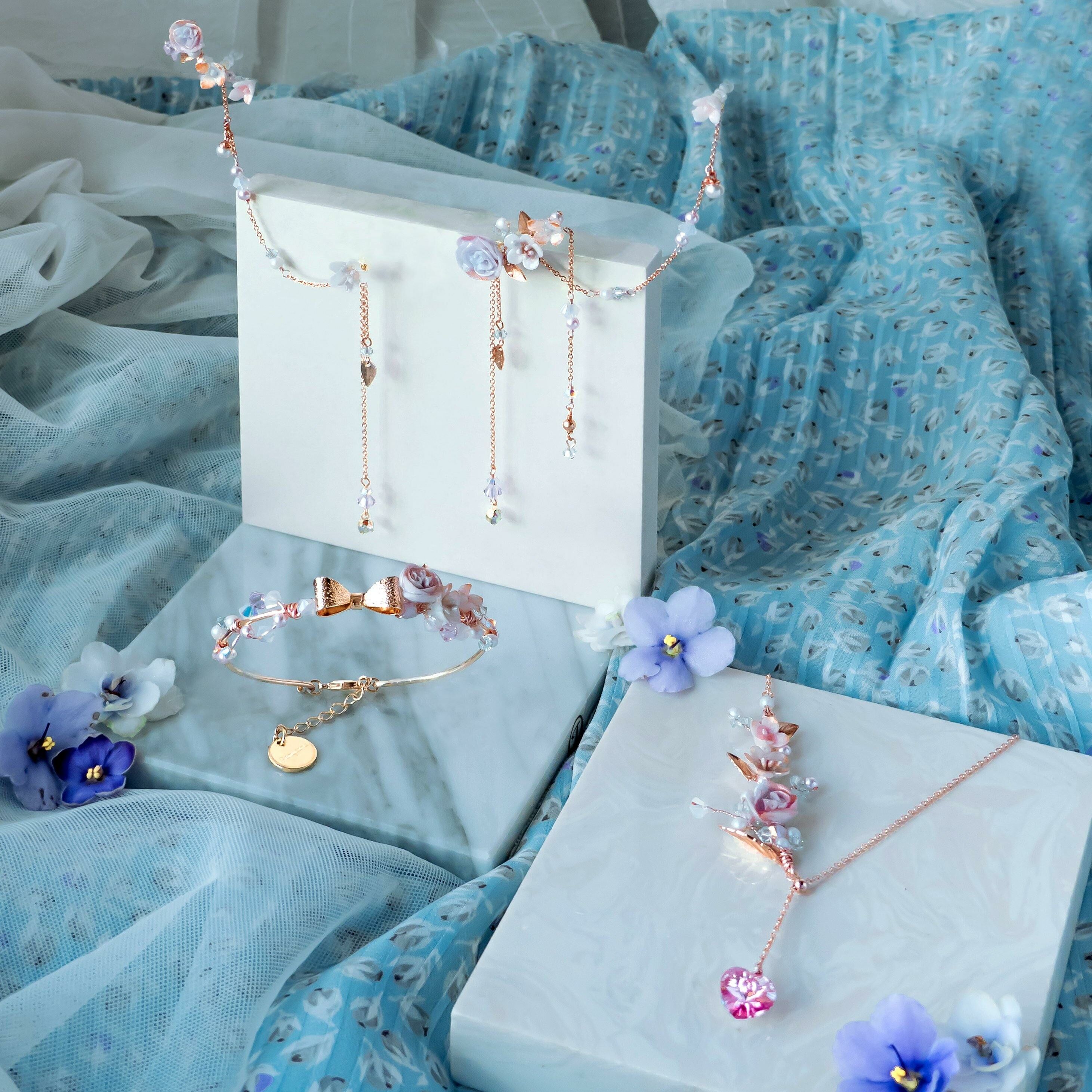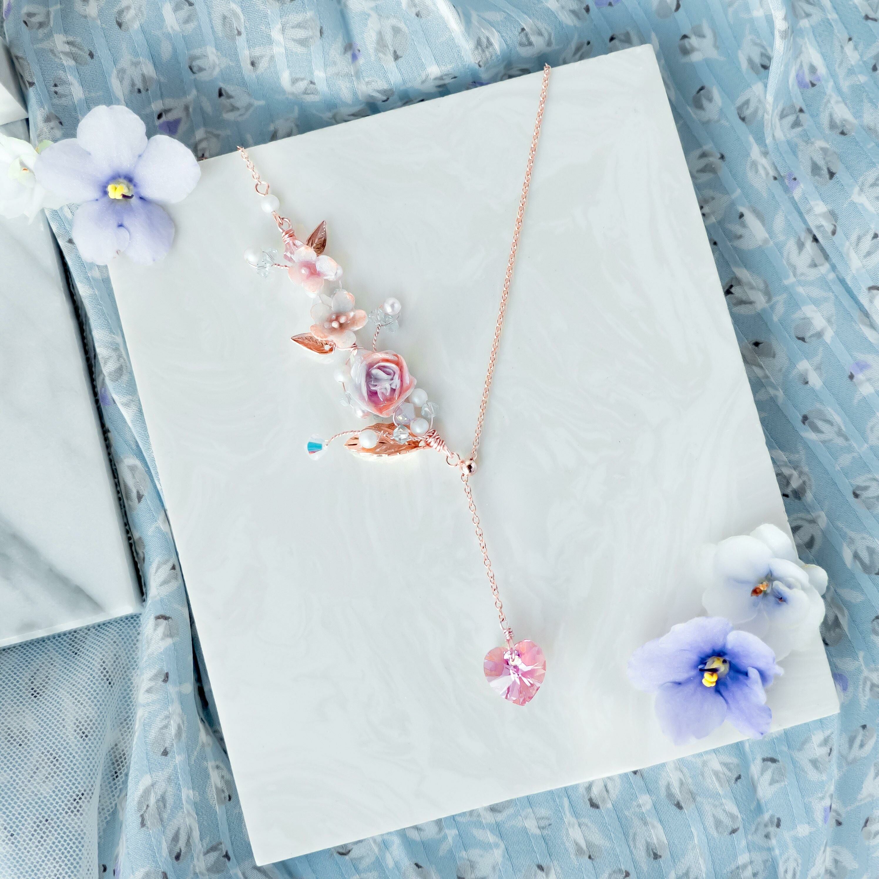 美國進口Beadsmith純銀線 | 奧地利水晶 | 奧地利水晶珍珠 | 手製樹脂黏土花 | UV膠強化保護層 | 鍍玫瑰金925純銀項鍊