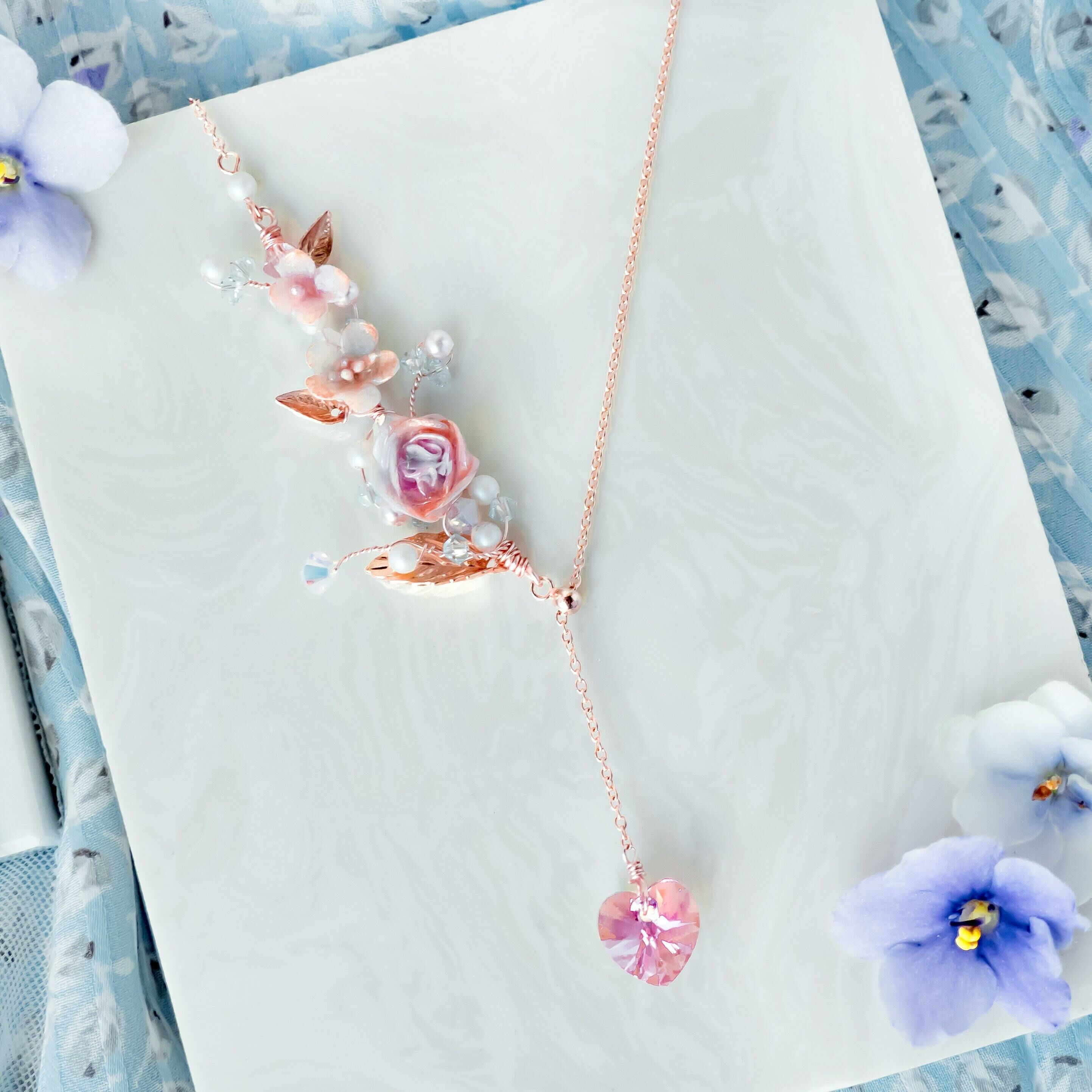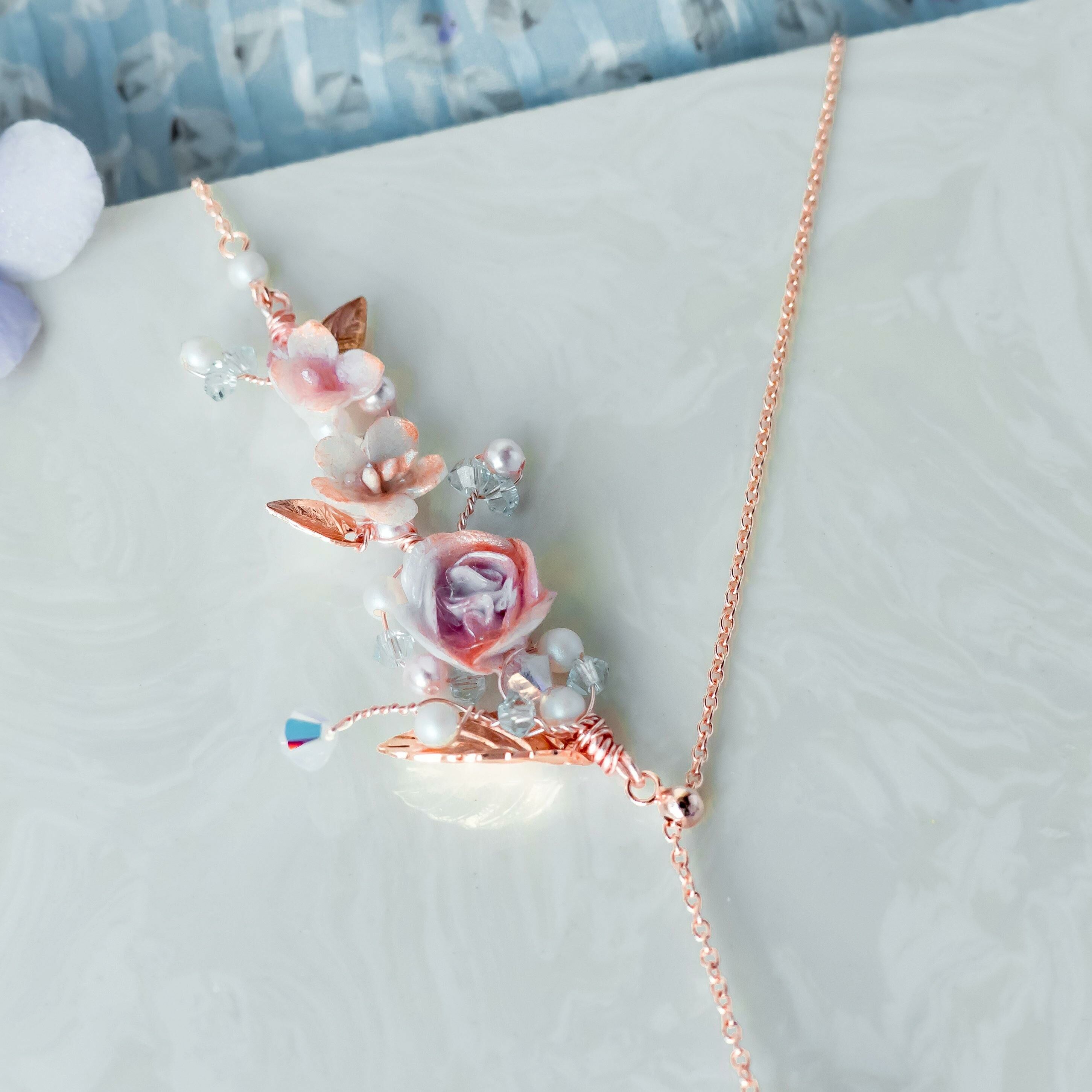 Rosegold Plated Artistic Wire | Austrian Crystal | Austrian Crystal Pearl | Handcrafted Resin Clay Flower | UV Hardening Coating | 14K Rose Gold-plated 925 silver necklace