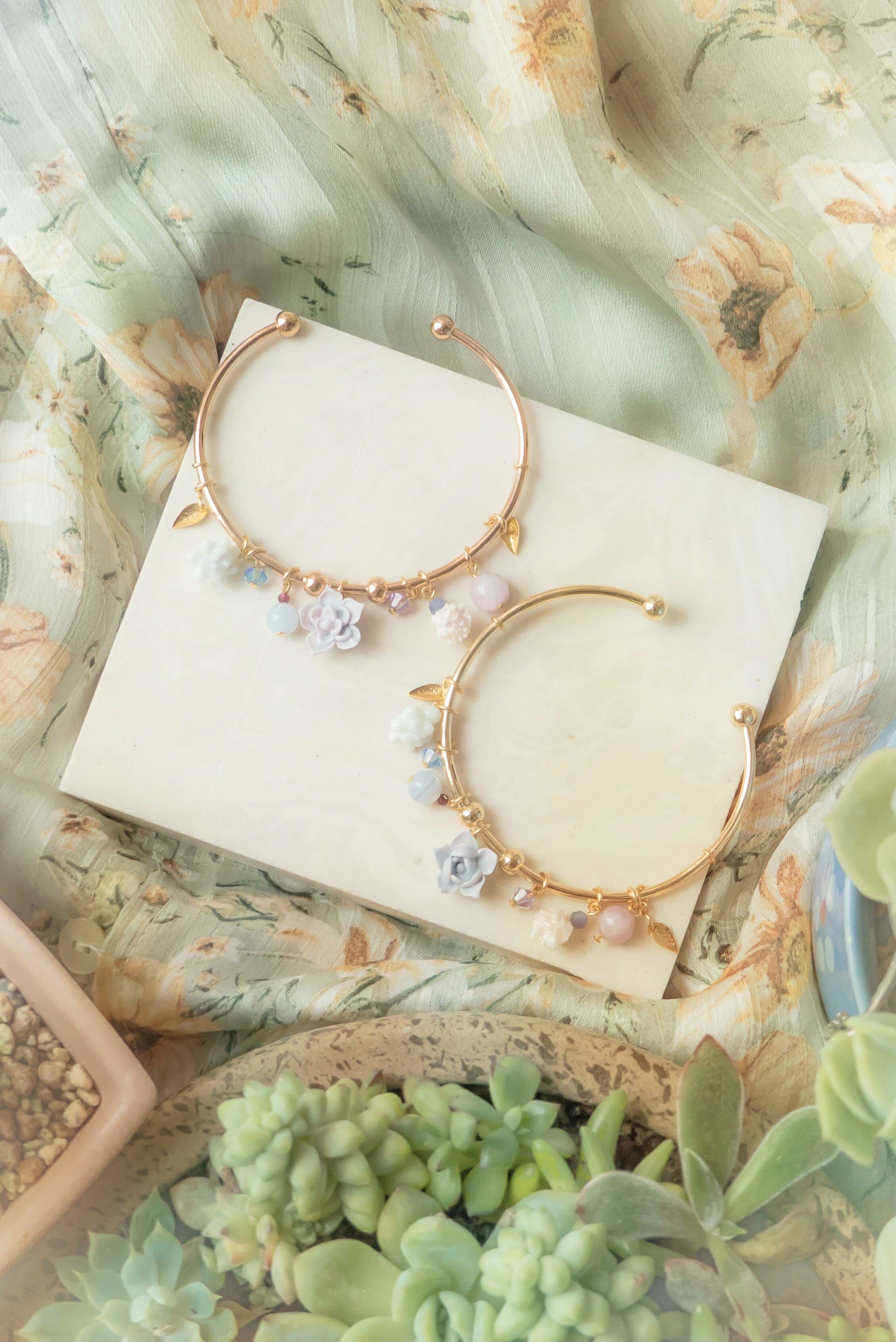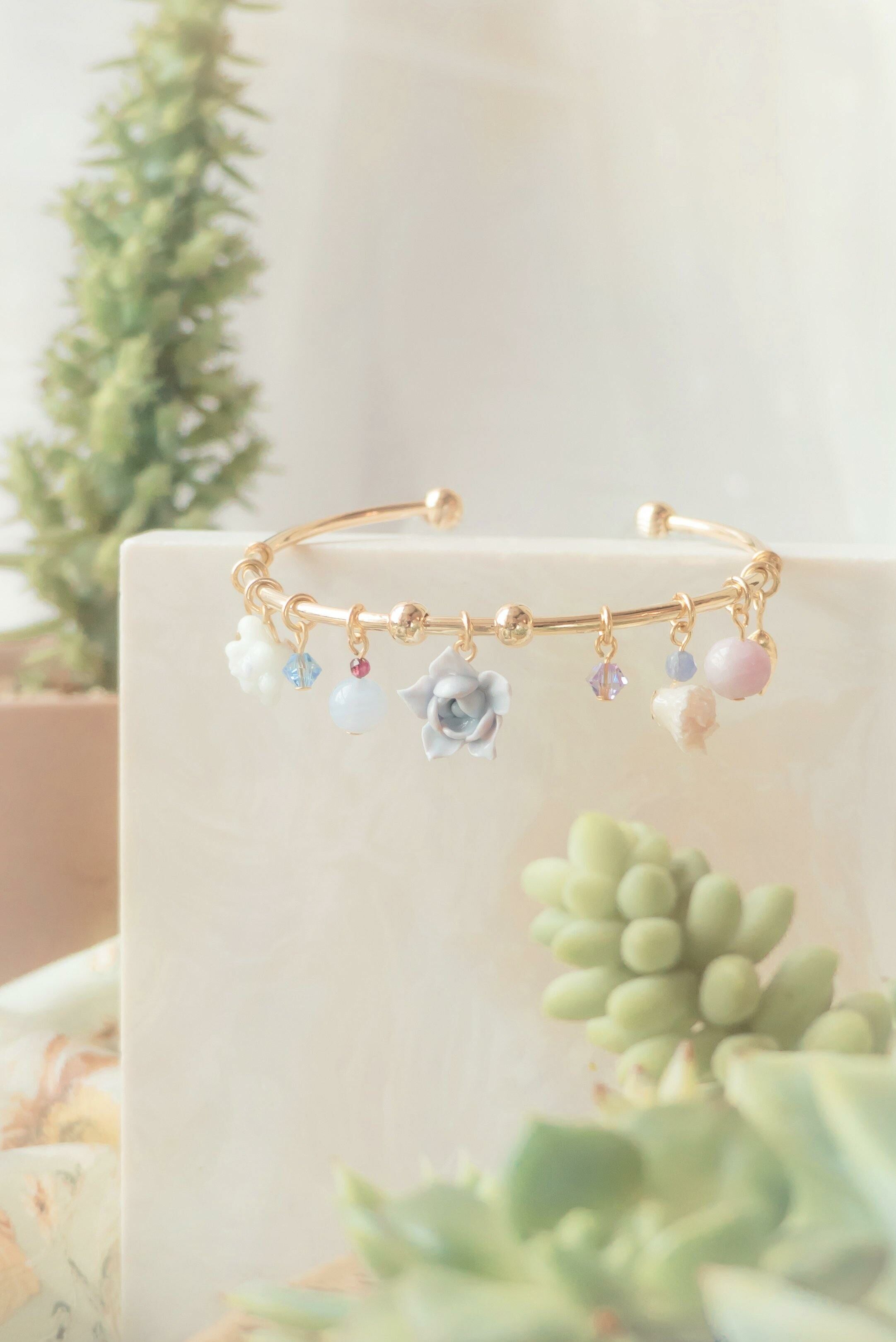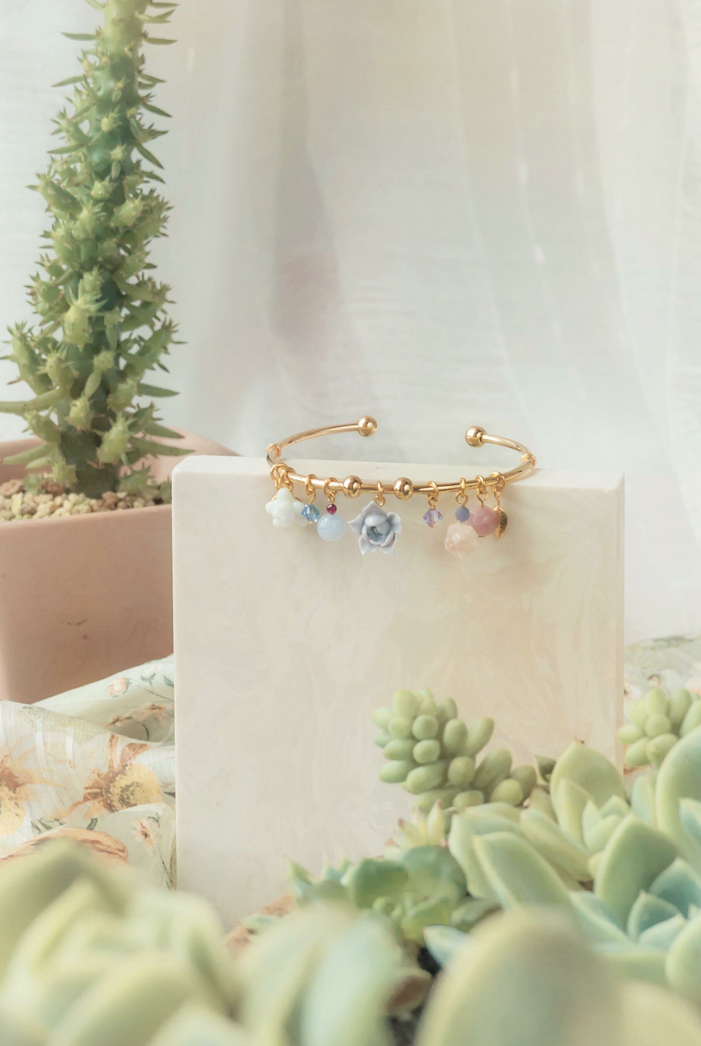 Gold Plated Artistic Wire | Austrian Crystal | Austrian Crystal Pearl | Tourmaline | Blue Lace Agate | Kunzite | Handcrafted Resin Clay Succulent Plants | UV Hardening Coating | 14K Gold-plated Bangle