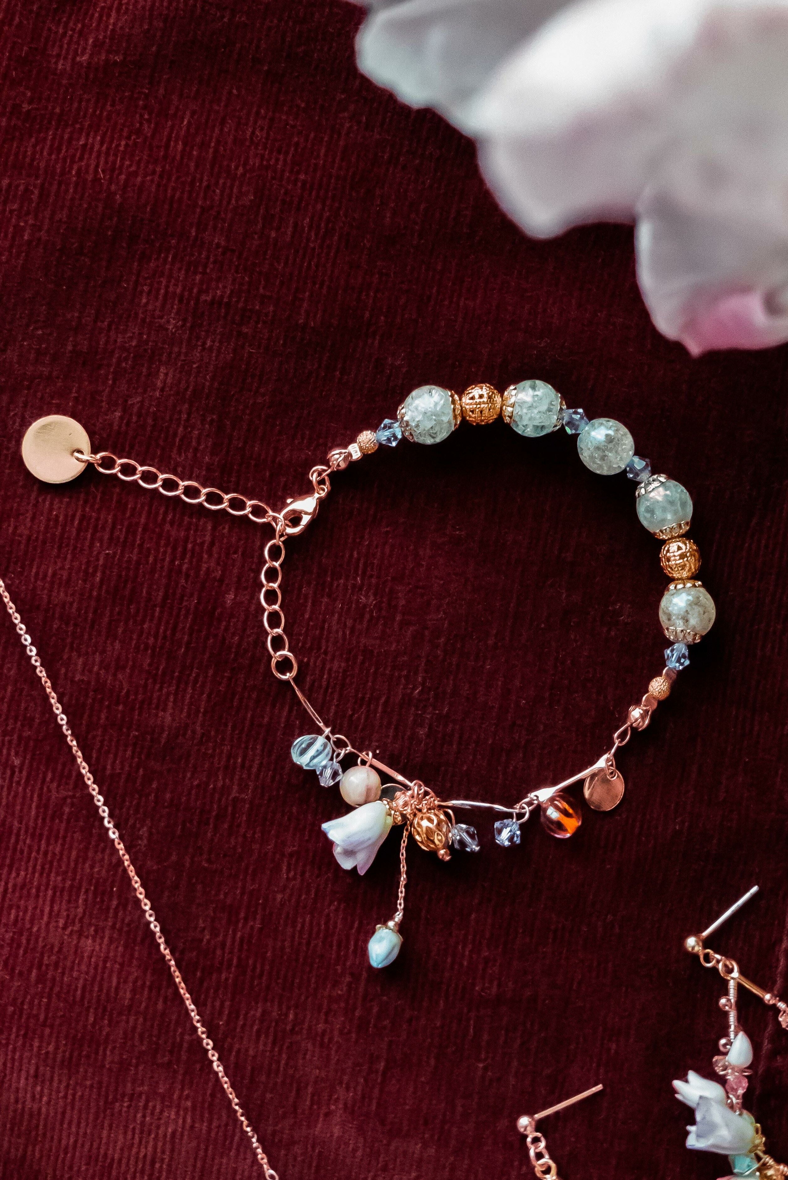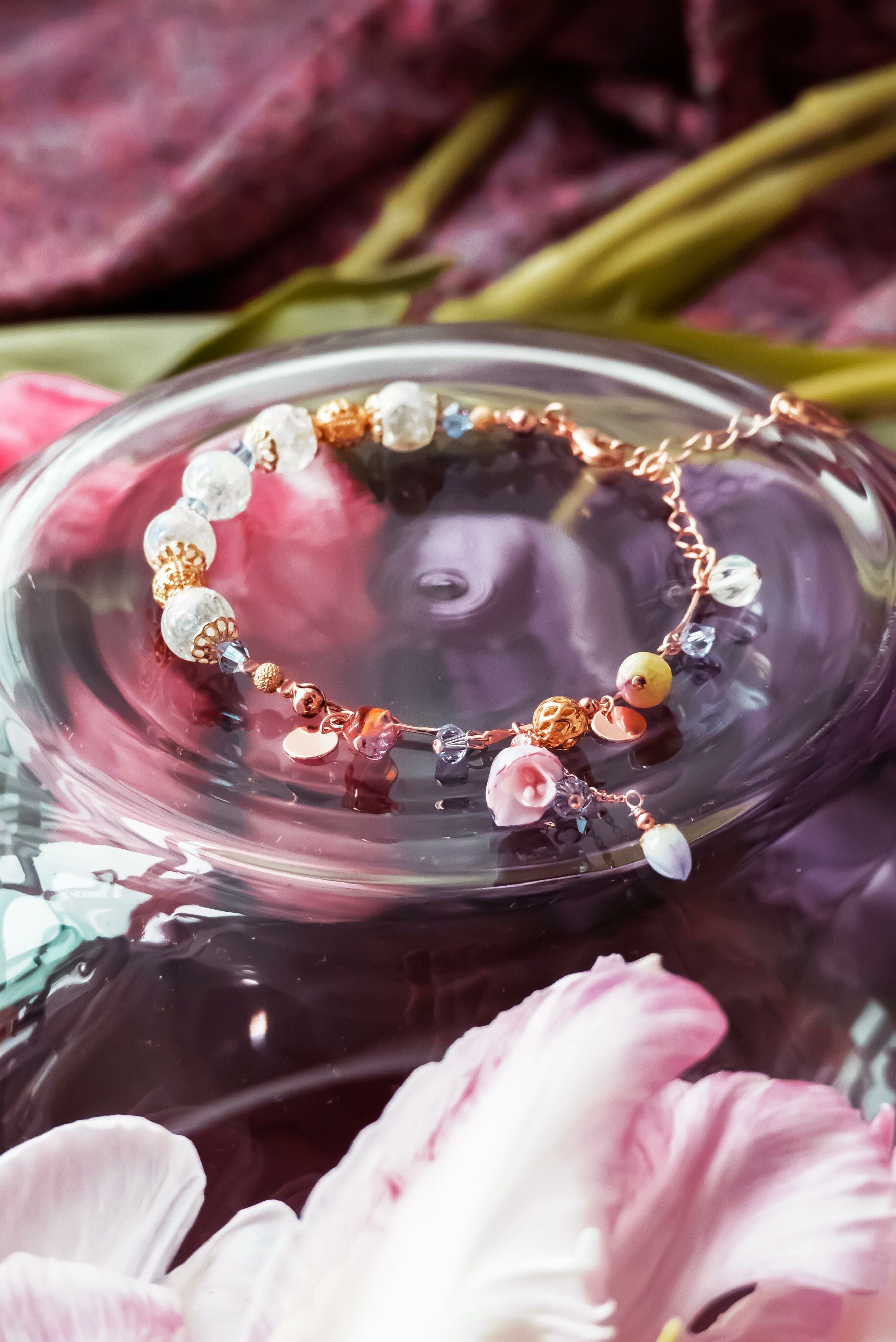 美國進口Beadsmith純銀線 | 奧地利水晶 | 日本琉璃珠 | 手製樹脂黏土花 | UV膠強化保護層 | 銅鍍玫瑰金手鏈