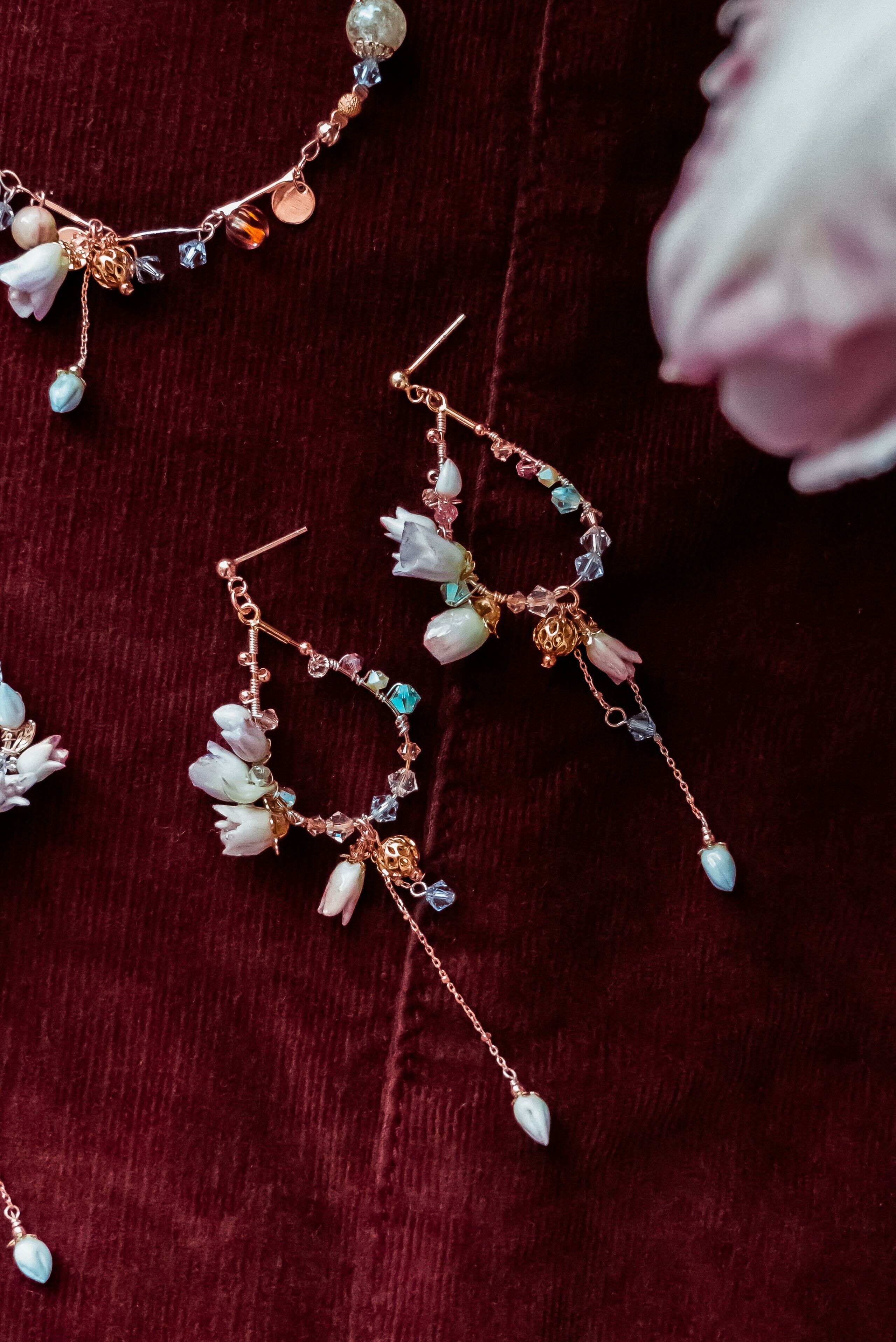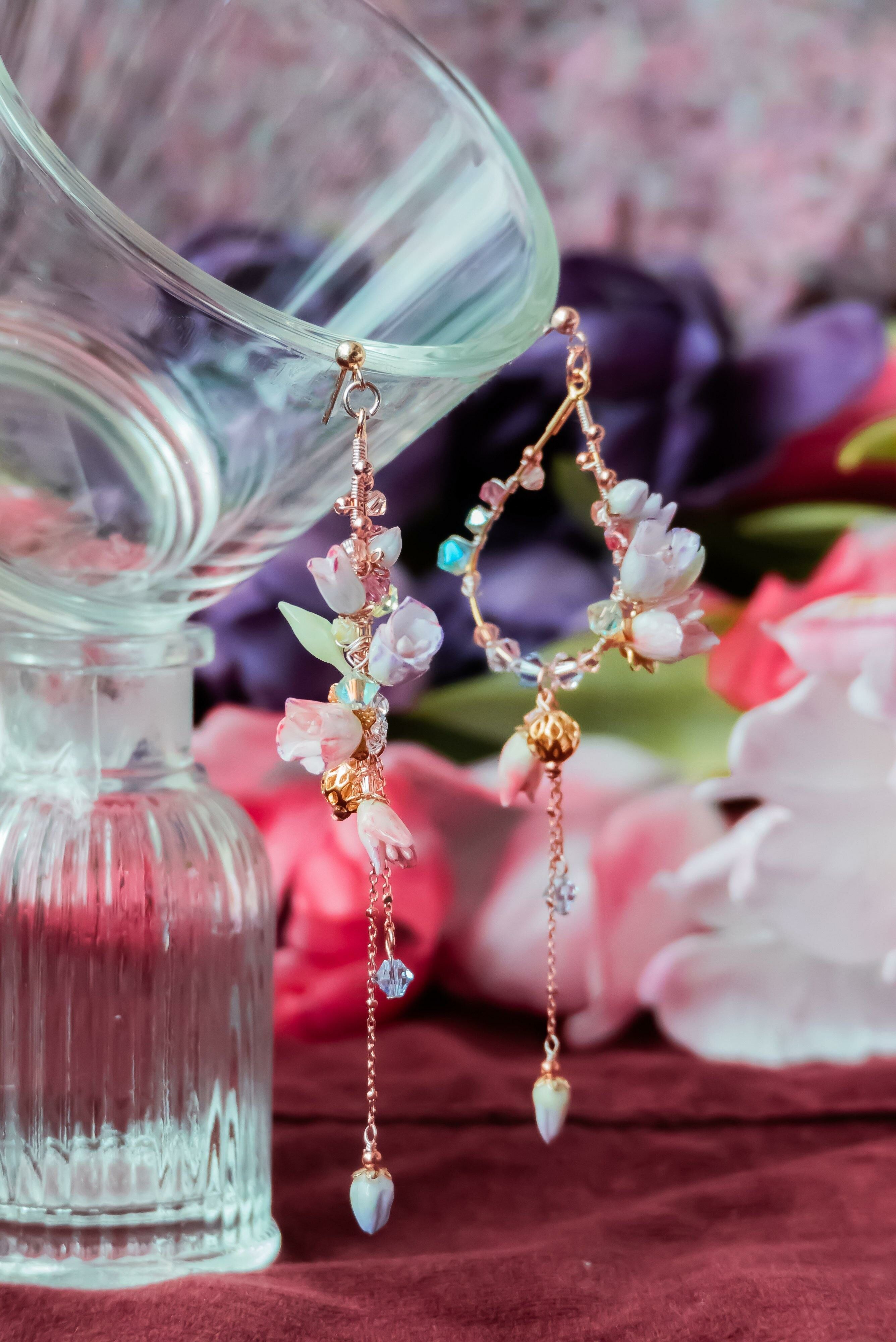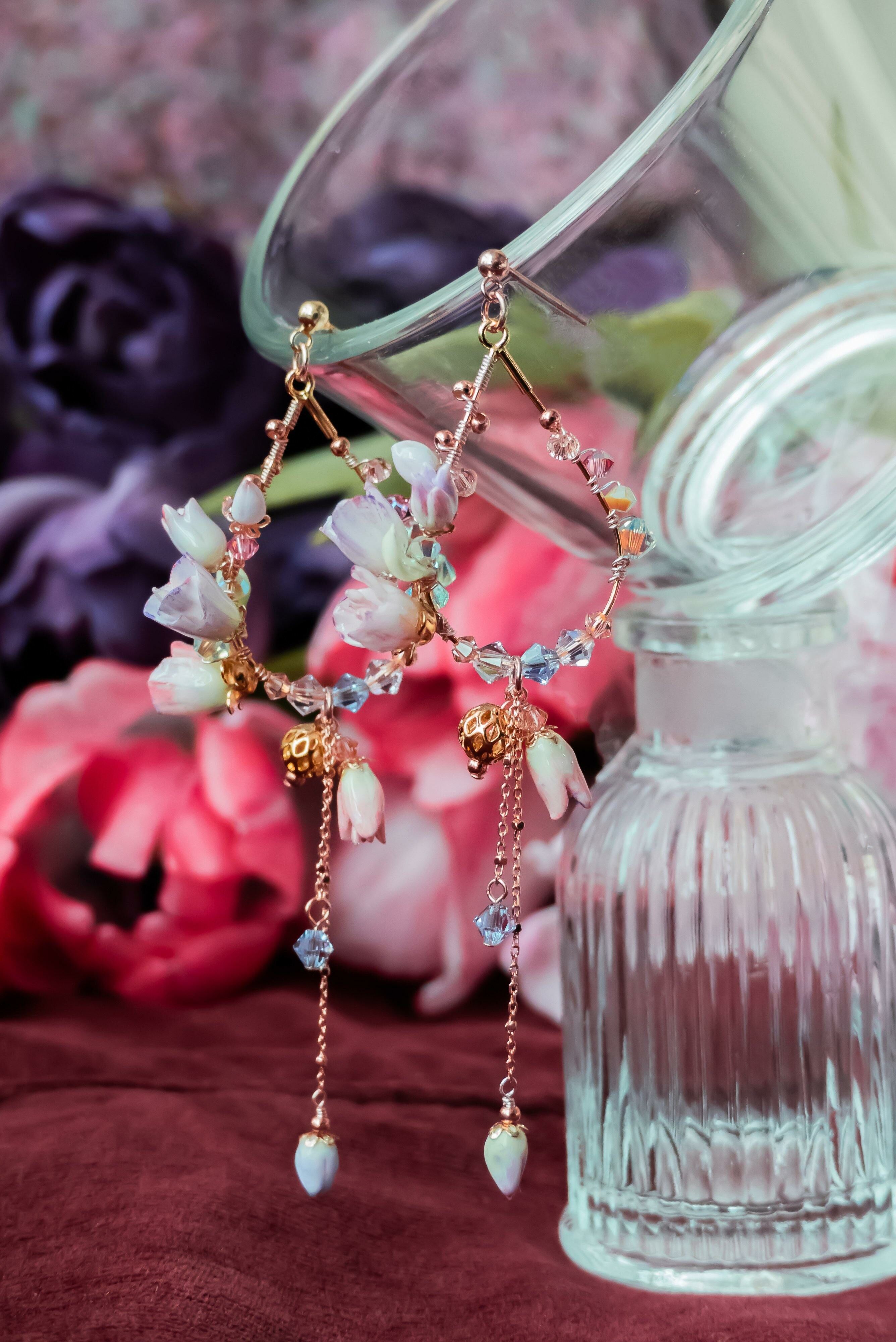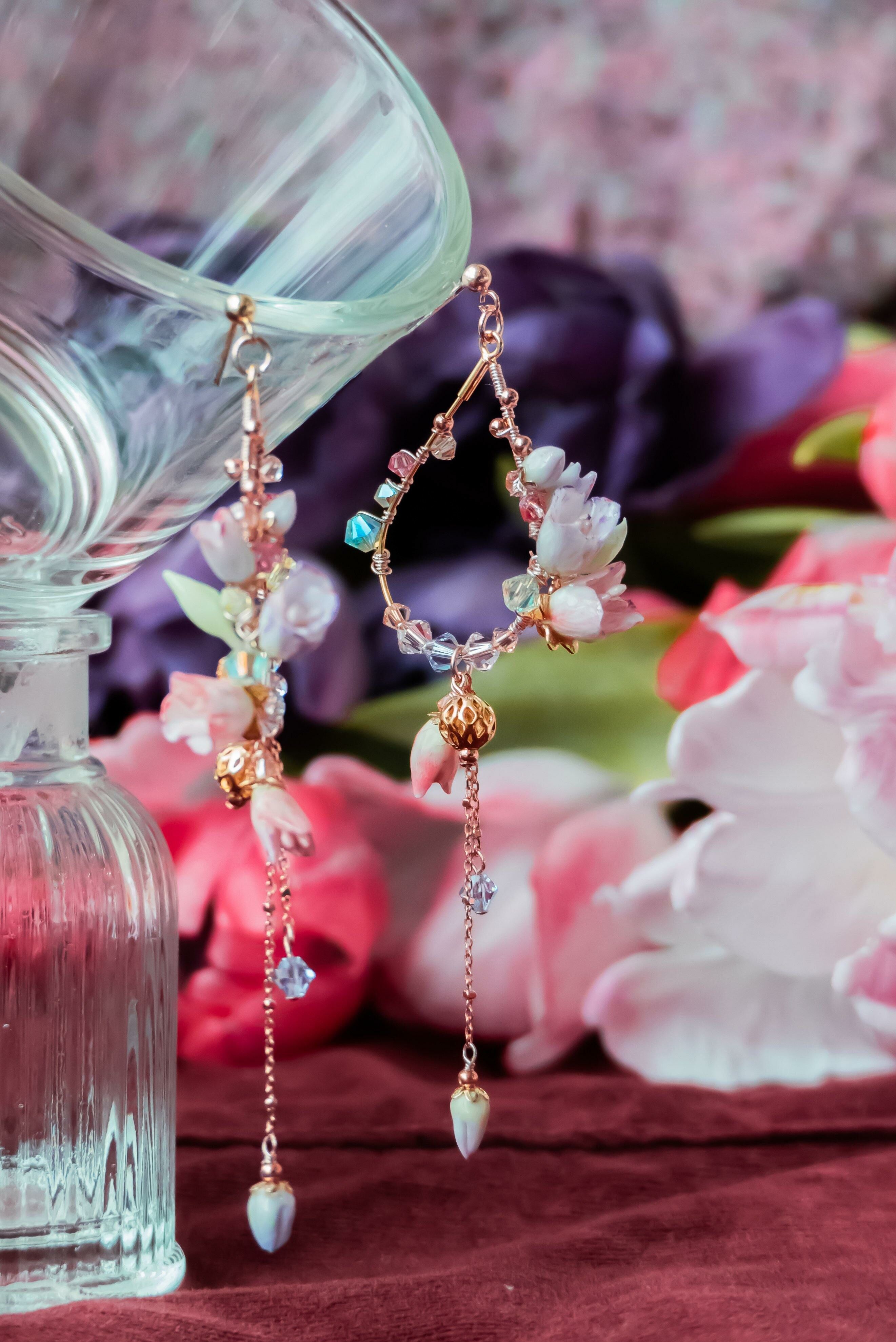 美國進口Beadsmith純銀線 | 奧地利水晶 | 手製樹脂黏土花 | UV膠強化保護層 | 925銀針鍍玫瑰金