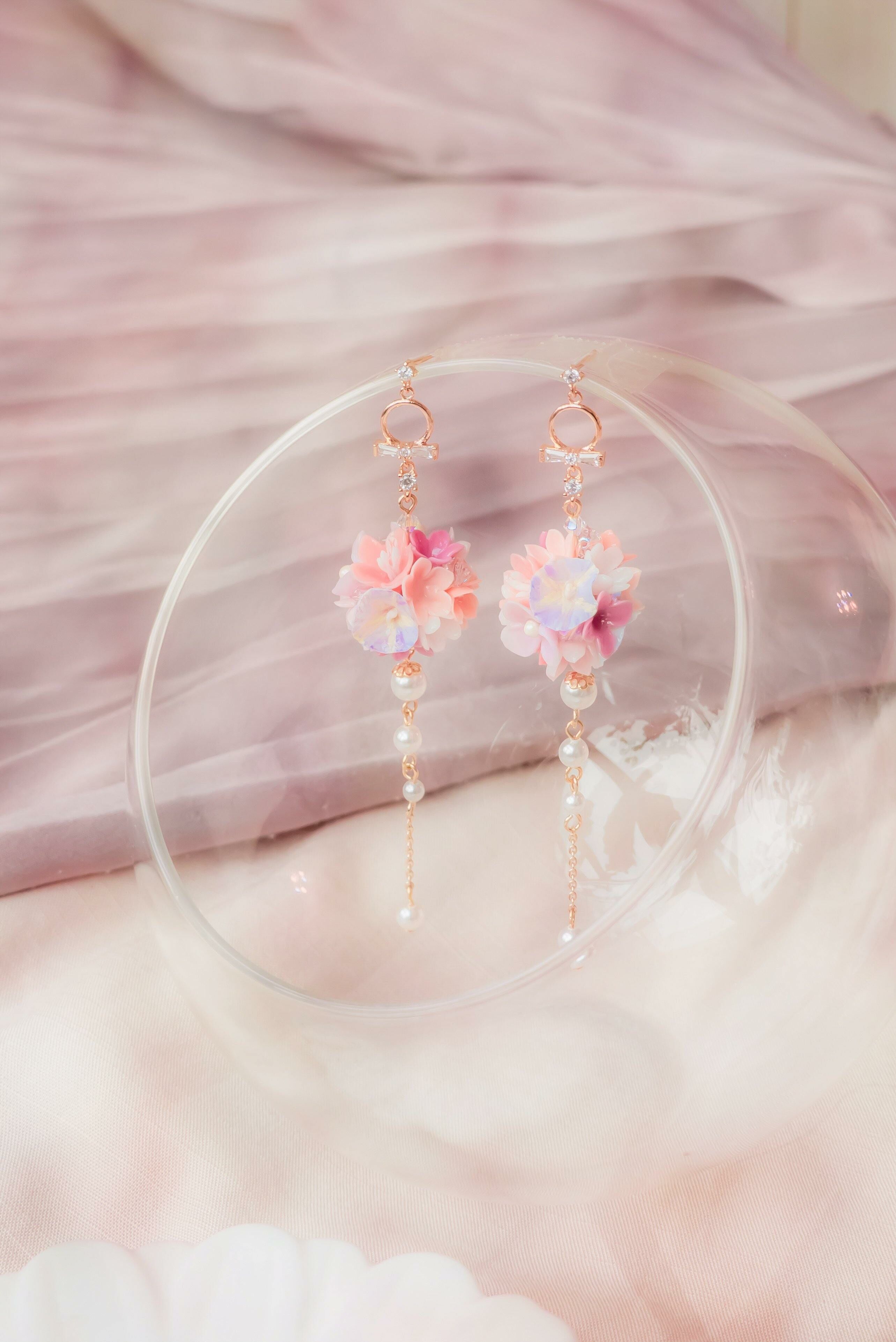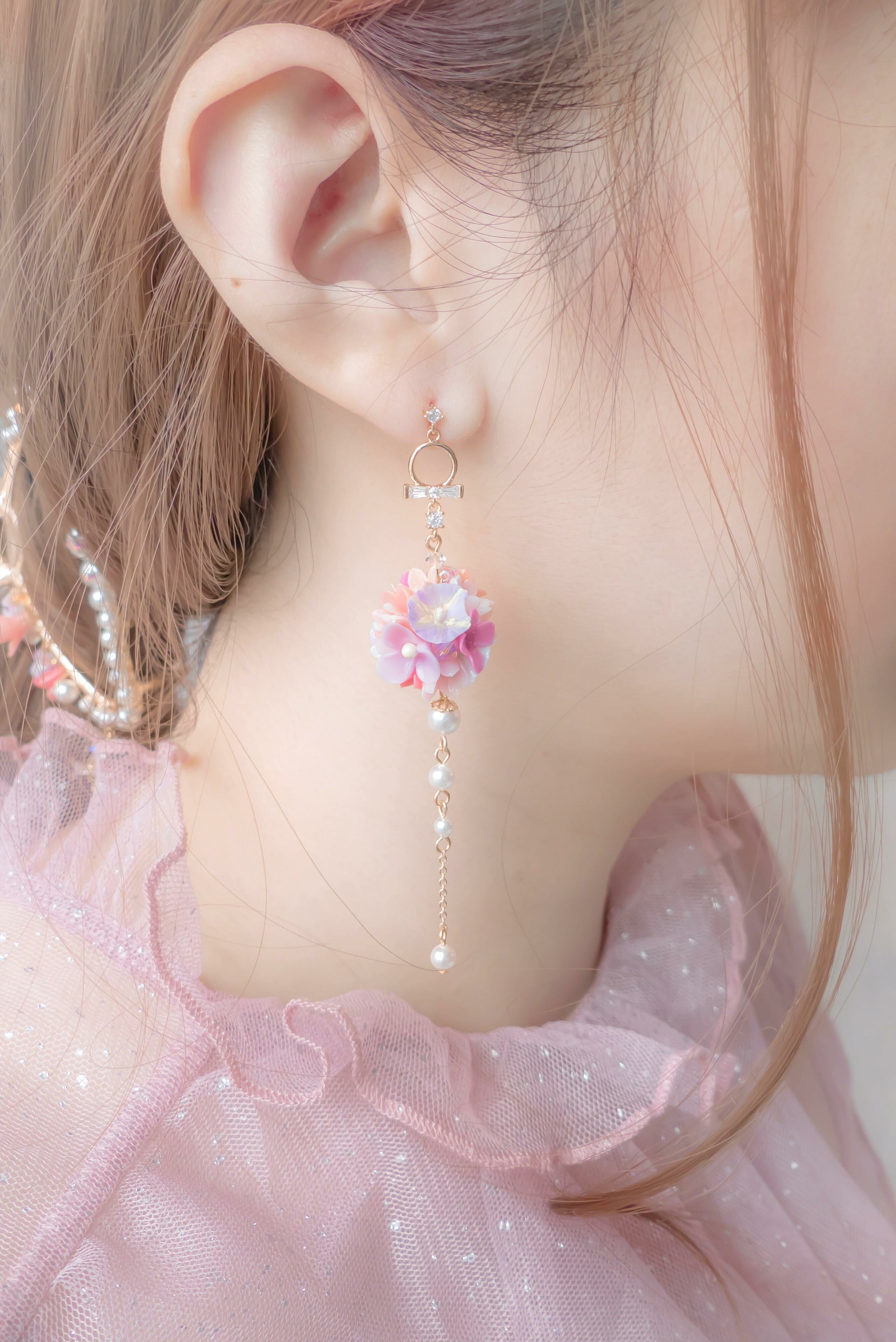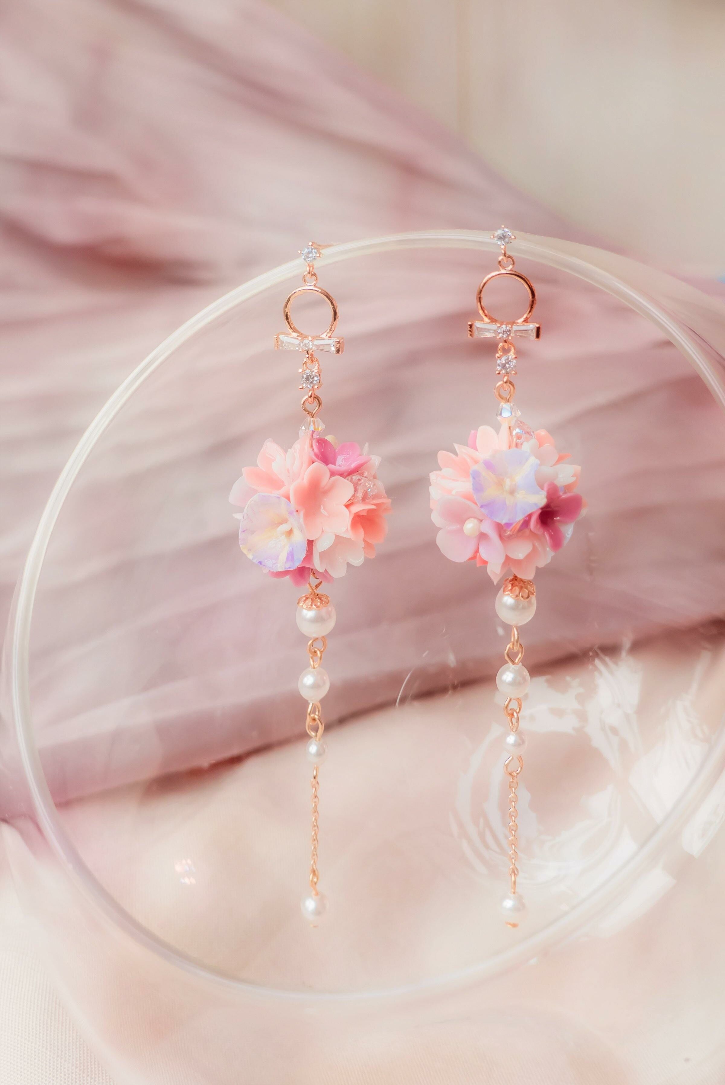 Length of earrings is 8.5cm. Diameter of floral bouquet is~2cm