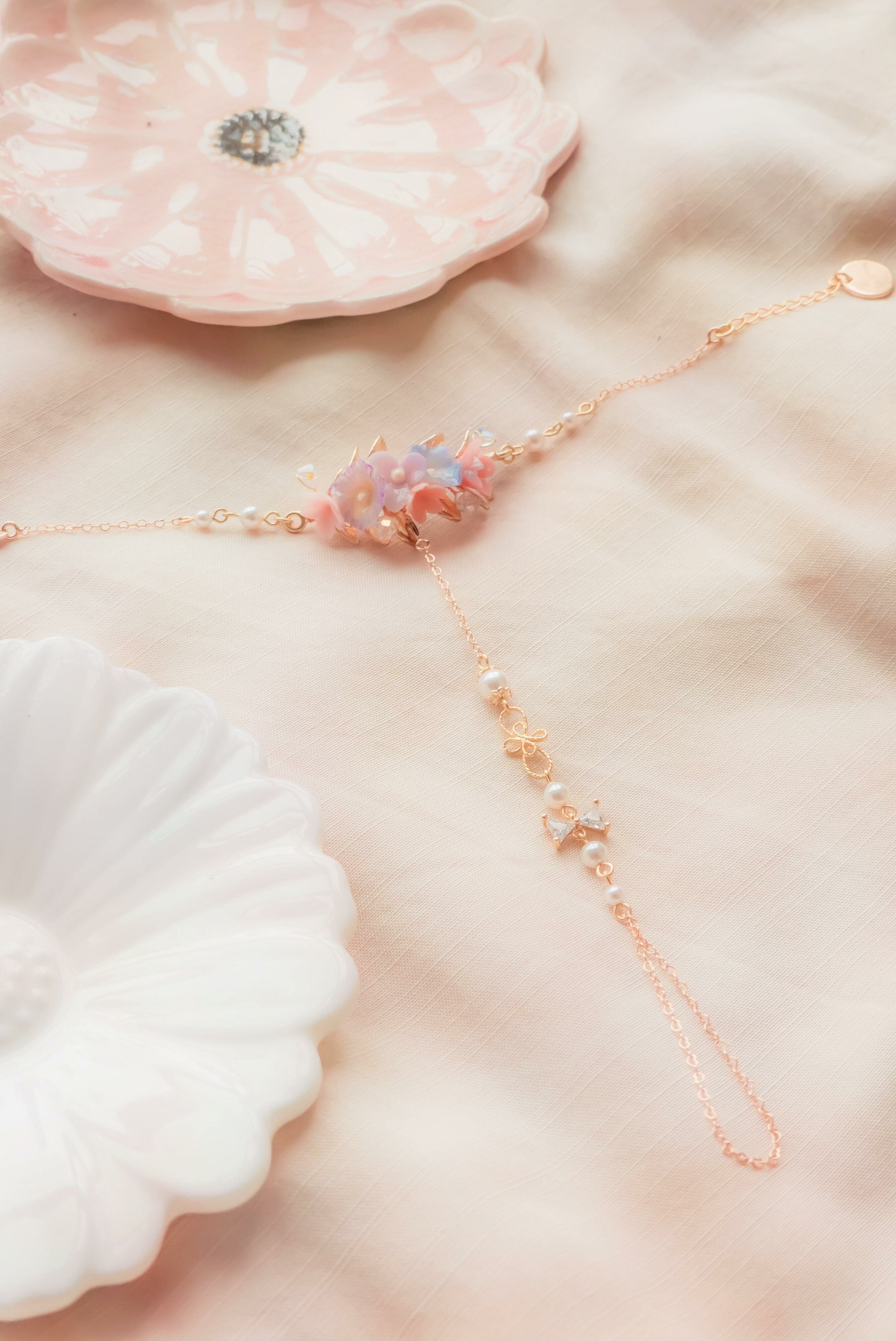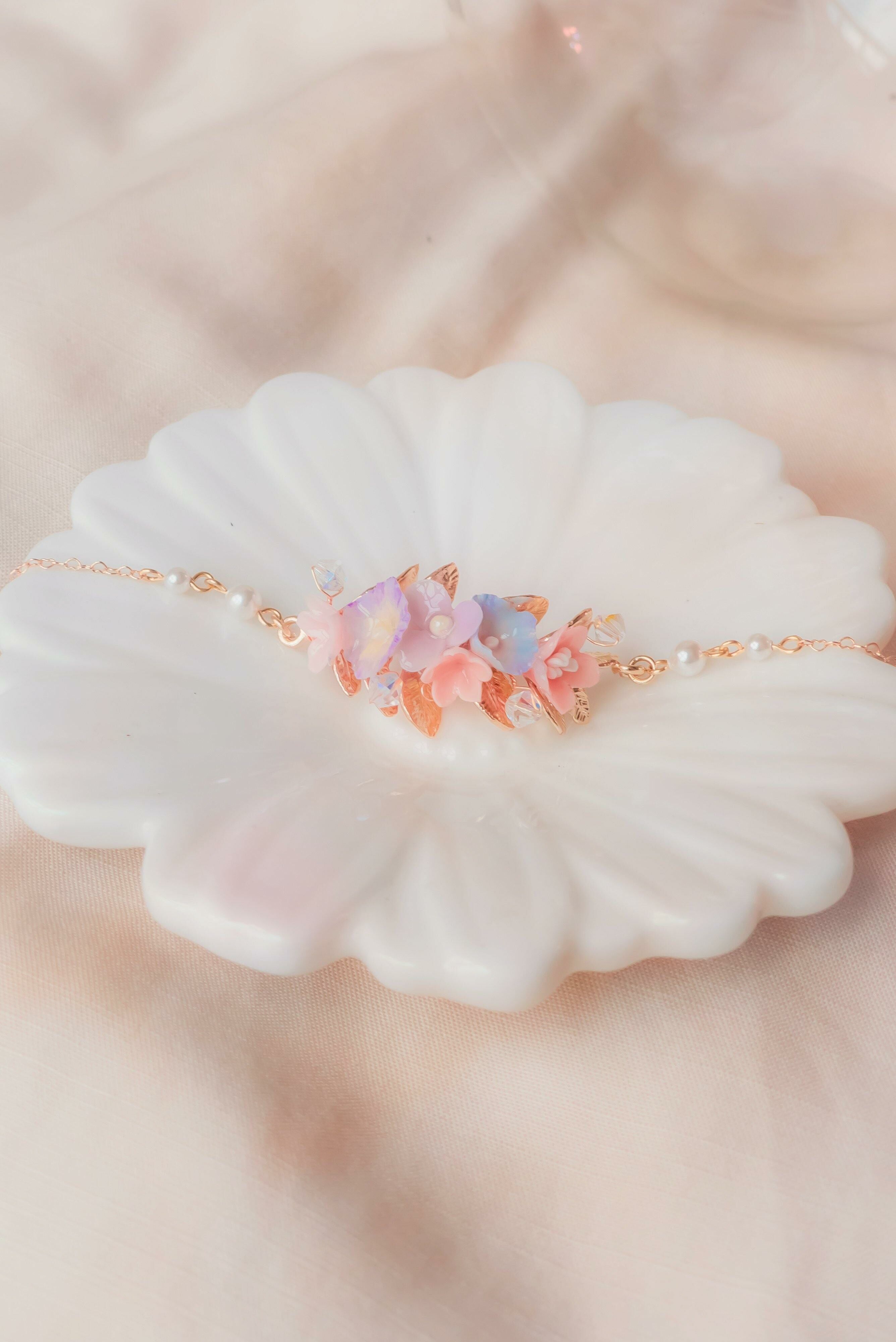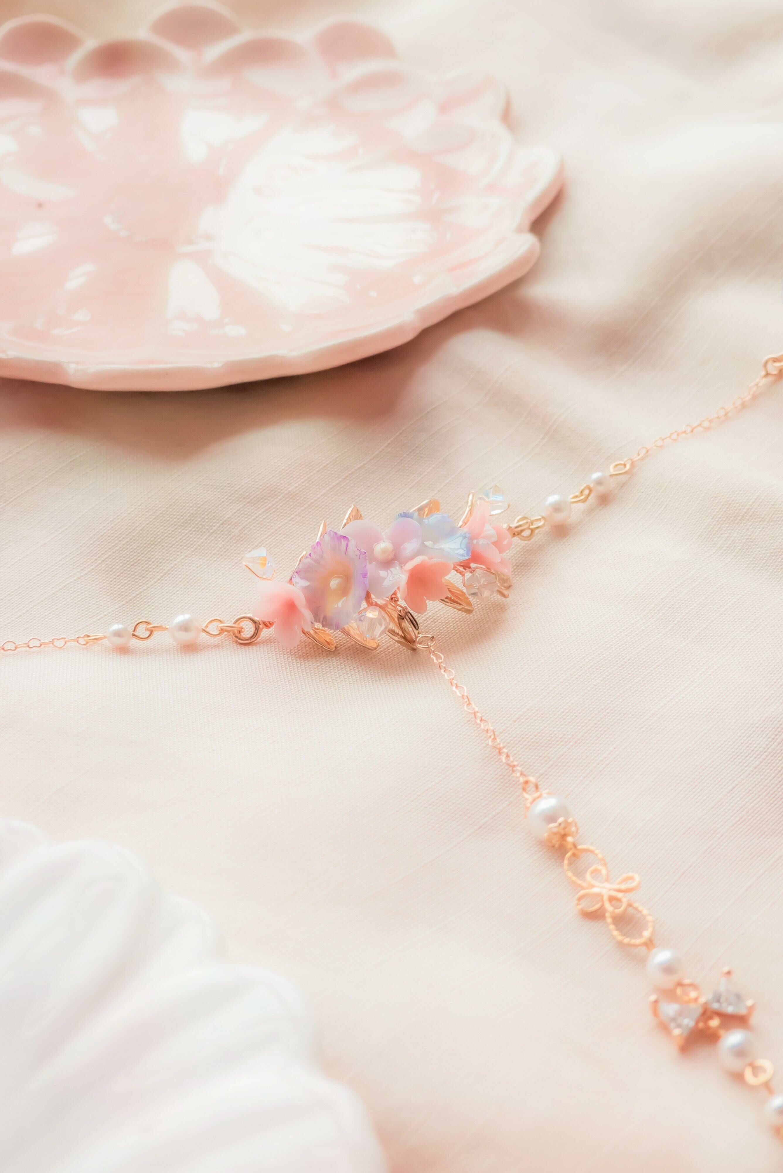 美國進口Beadsmith純銀線 | 奧地利水晶 | 奧地利水晶珍珠 |日本鋯石 | 手製樹脂黏土花 | UV膠強化保護層 | 鍍14K金耳針 | 鍍14K金925銀鏈