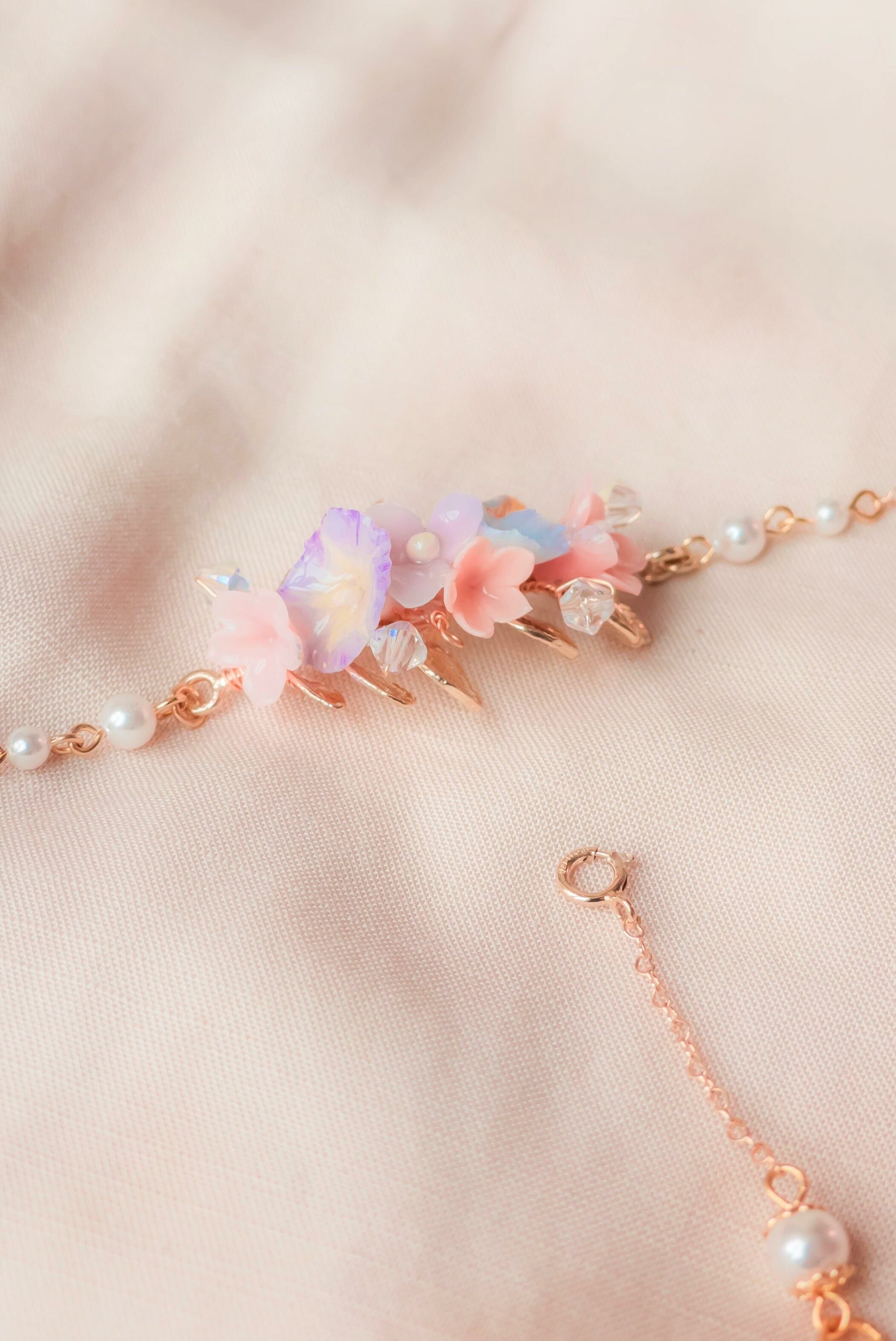 Gold Plated Artistic Wire | Austrian Crystal | Pearl | Japanese CZ | Handcrafted Resin Clay Flower | UV Hardening Coating | 14K Gold-Plated Ear Stud | 925 Silver Chain