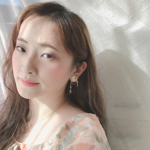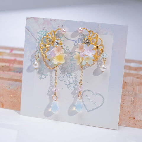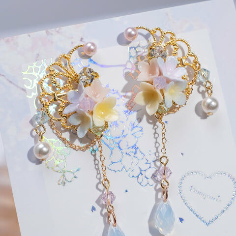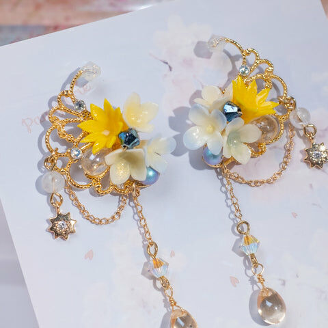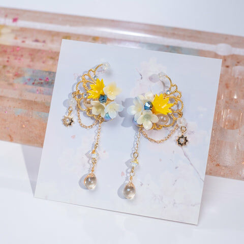 鍍金線 | 施華洛世奇水晶 | 手製樹脂黏土花 | UV膠強化保護層 | 鍍金925純銀耳釘