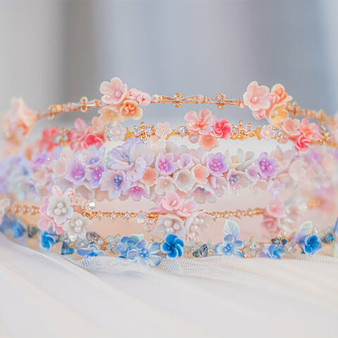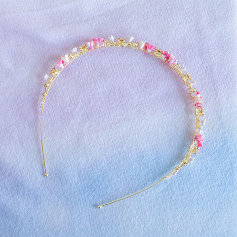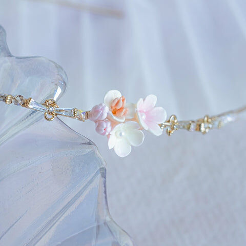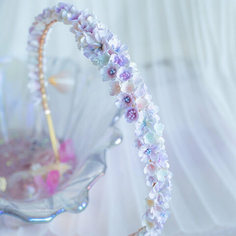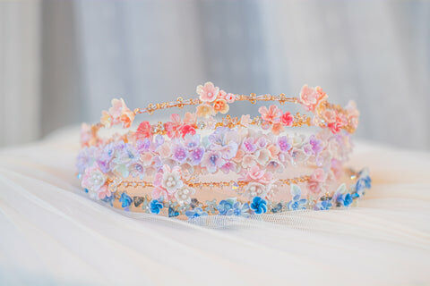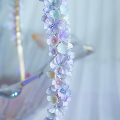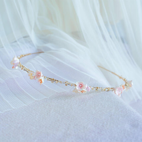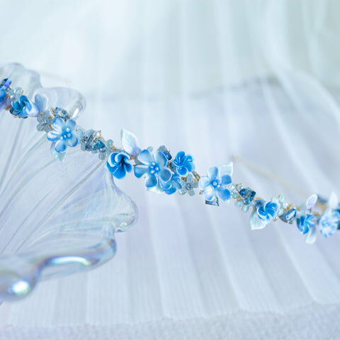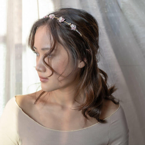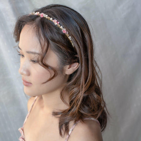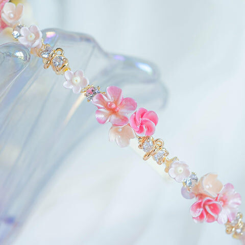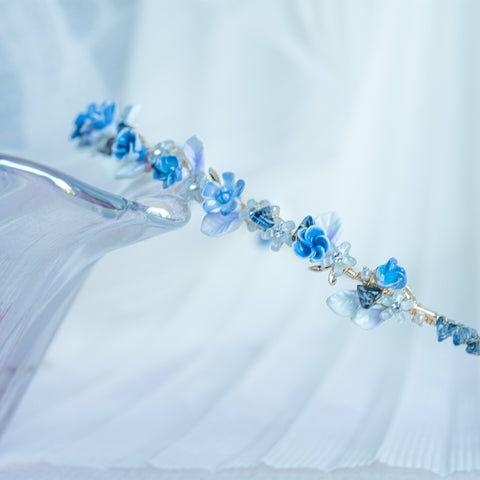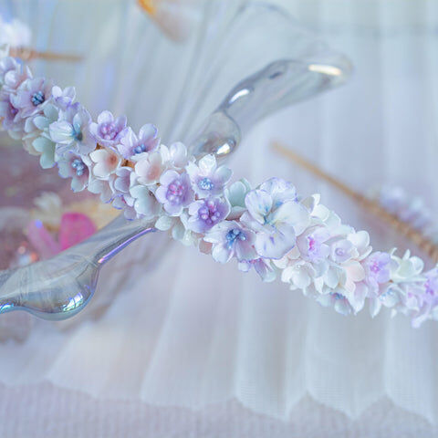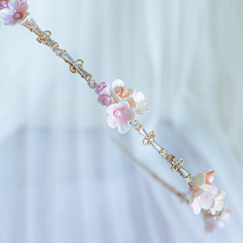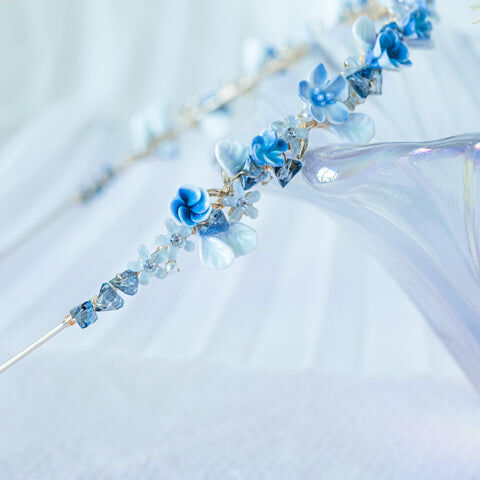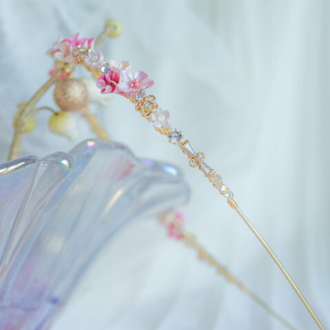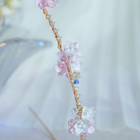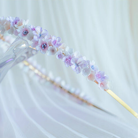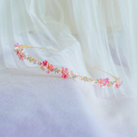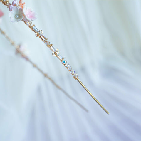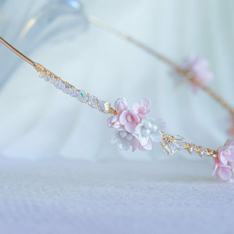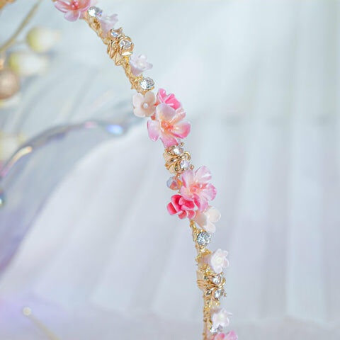 鍍金線 | 施華洛世奇水晶 | 手製樹脂黏土花 | UV膠強化保護層 | 金屬髮箍