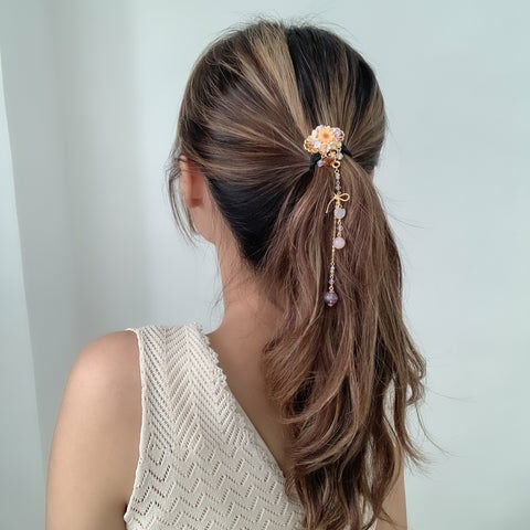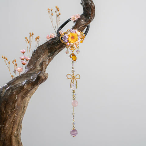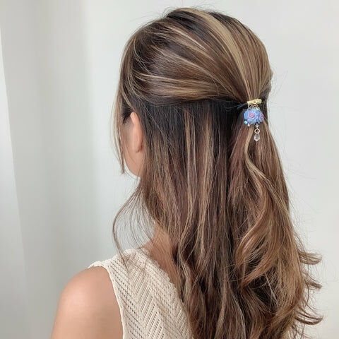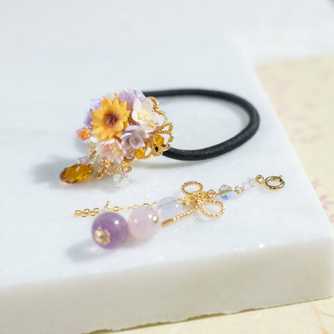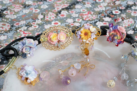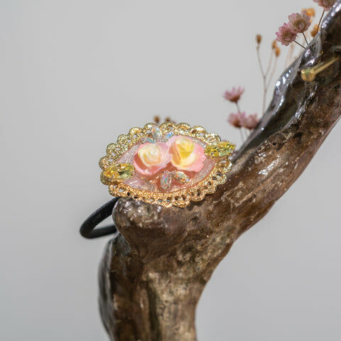 鍍金線 | 施華洛世奇水晶 | 手製樹脂黏土花 | UV膠強化保護層 | 彈性橡筋